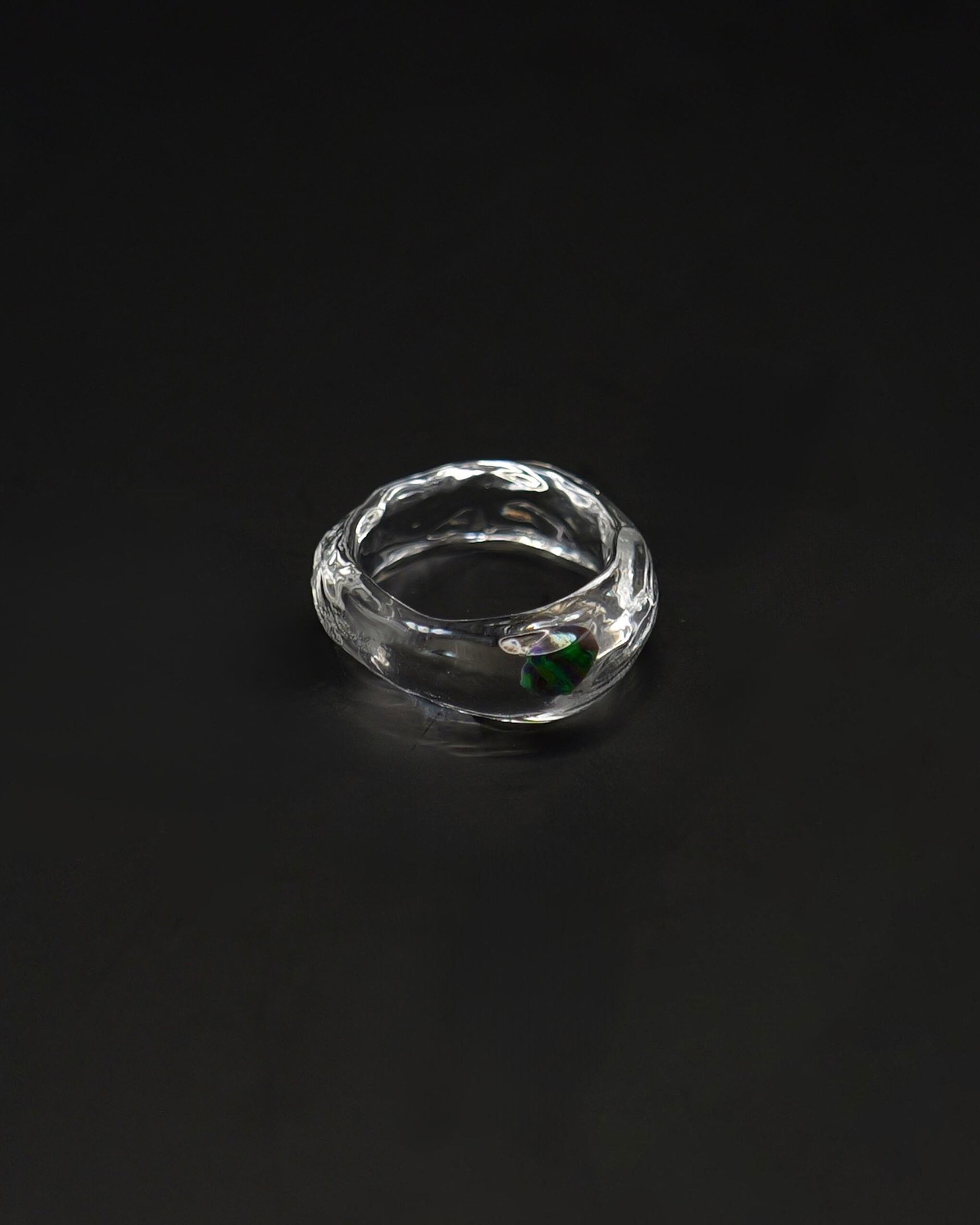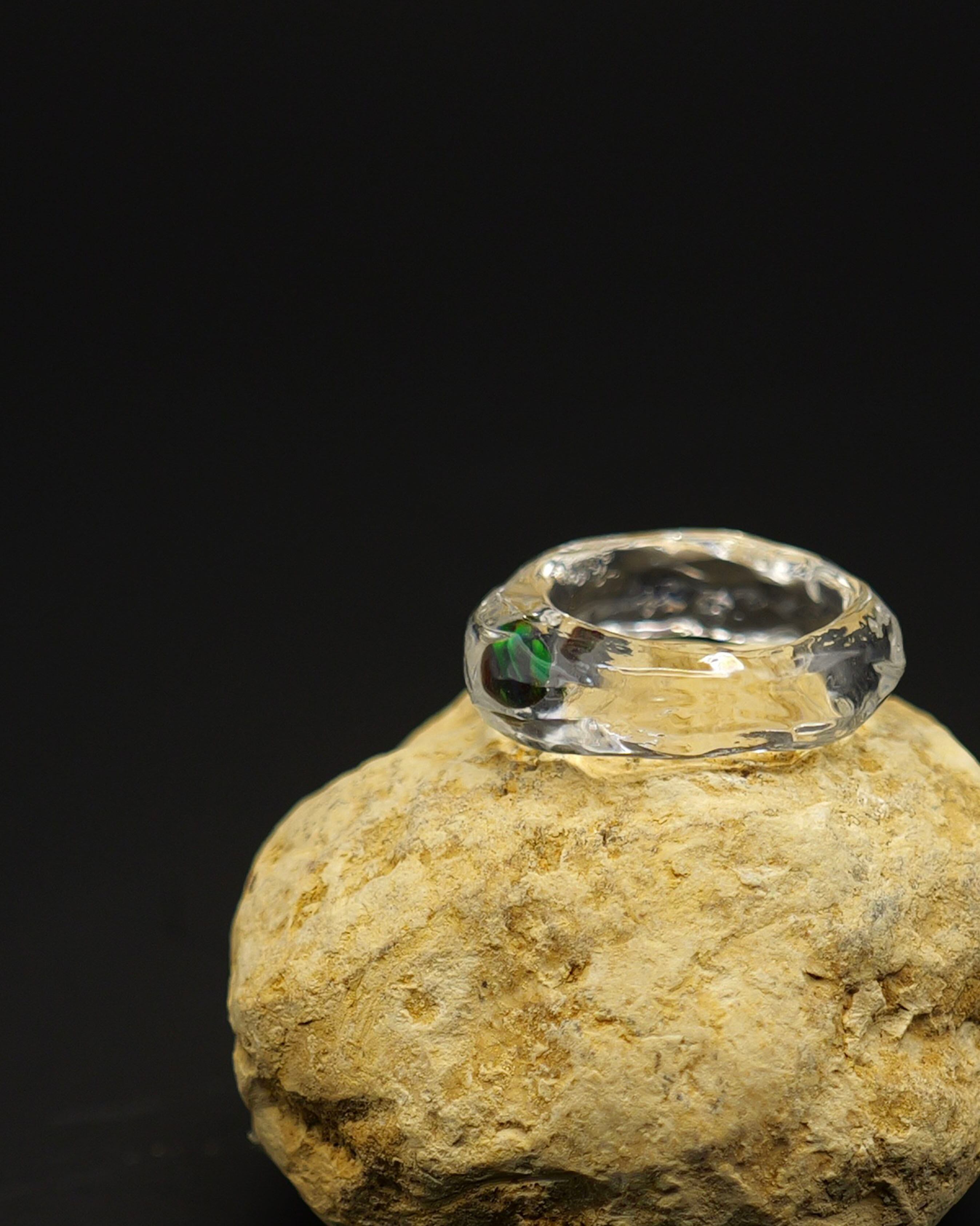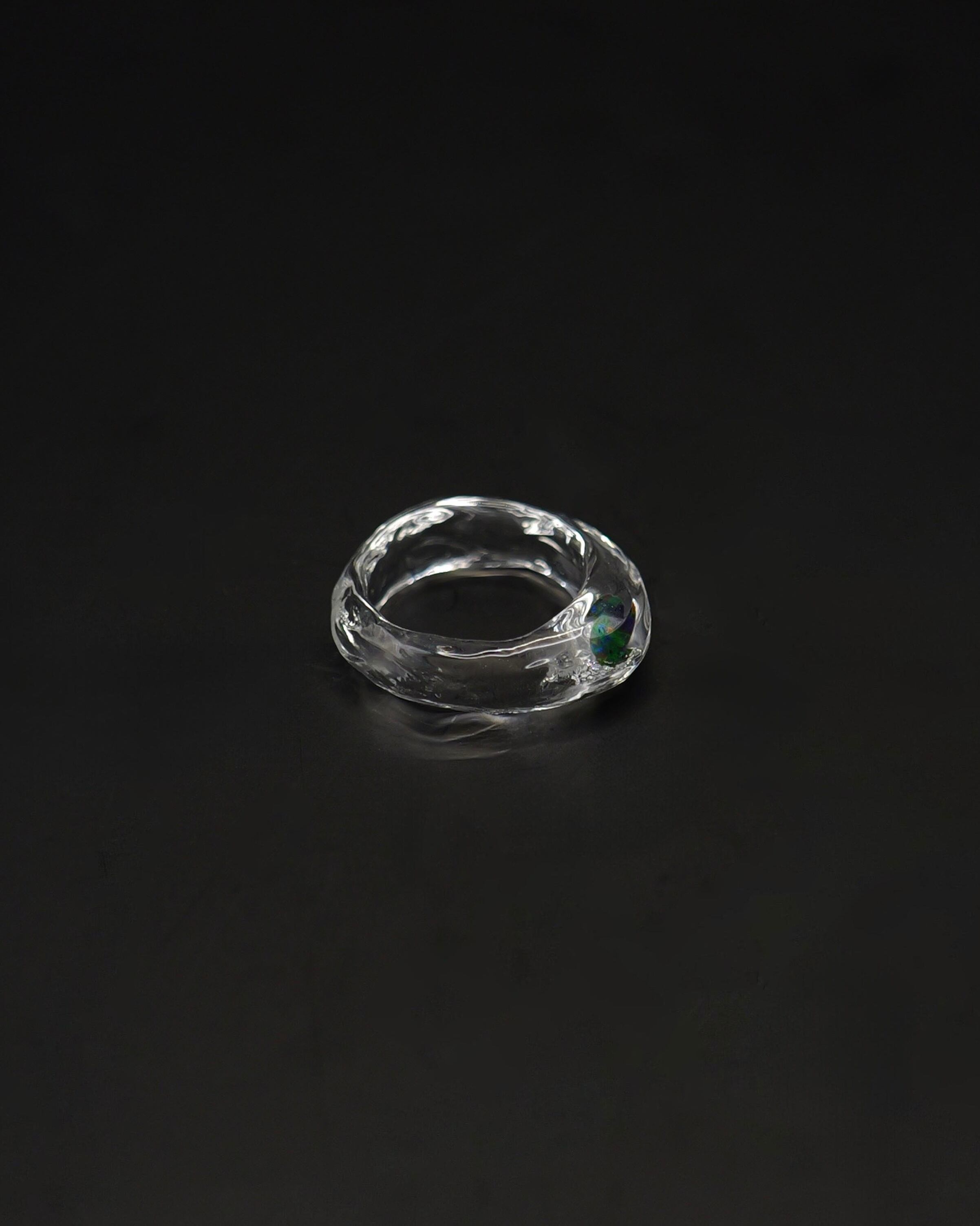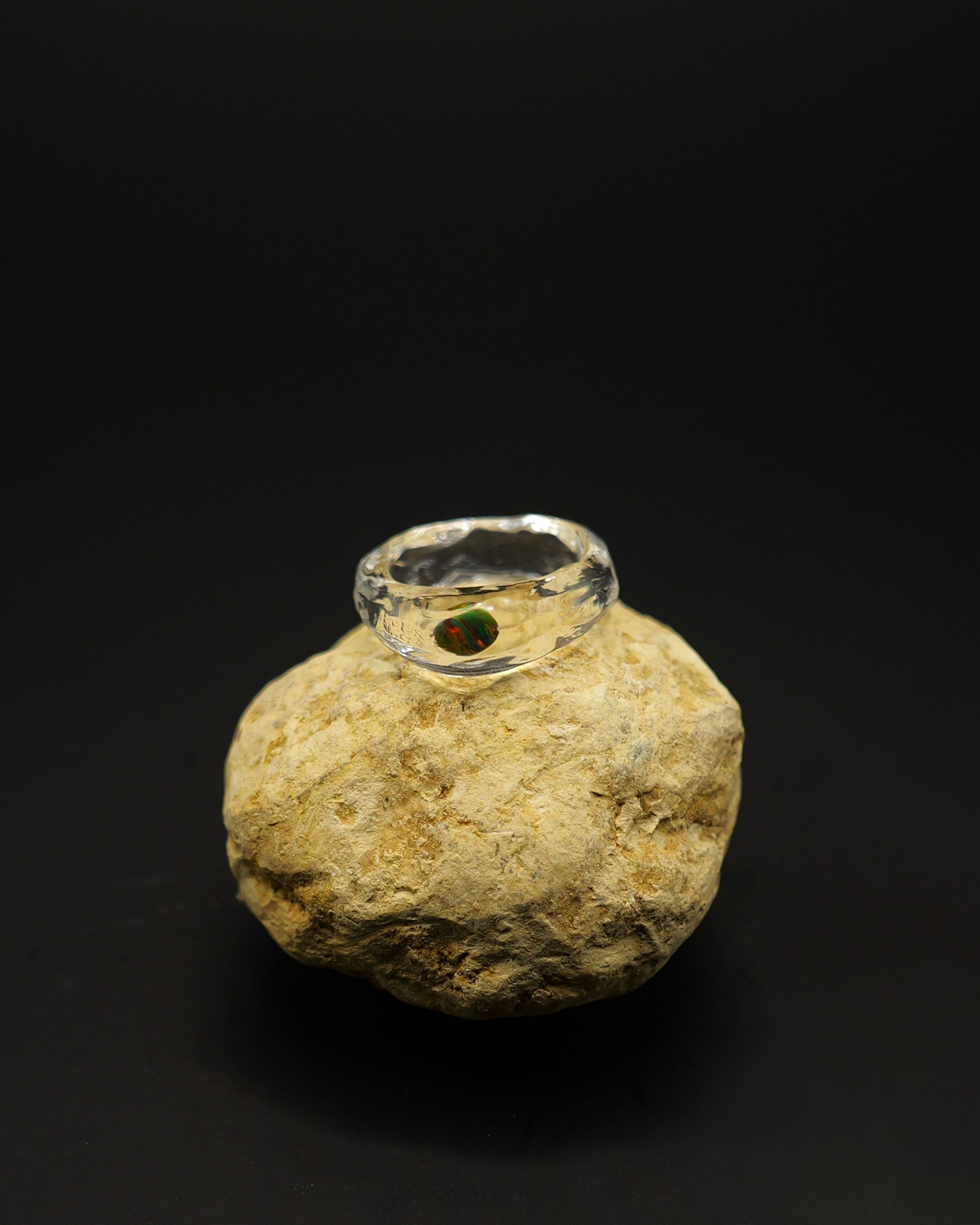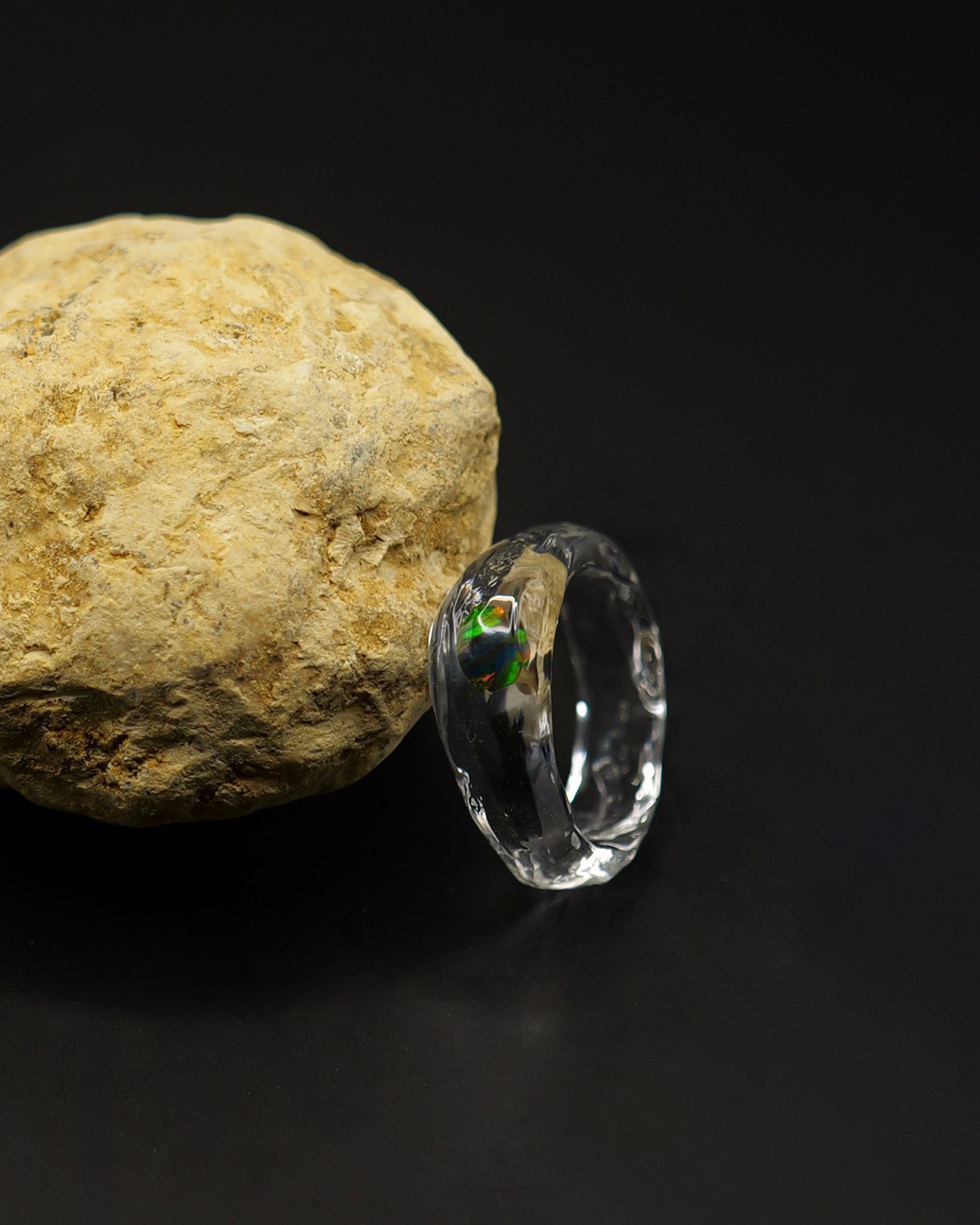 オパールは、光の角度や種類によって7色に変化する“遊色効果”を持つ特別な宝石。このリングでは、その魅力を最大限に活かすため、透明なガラスの中にオパールを封じ込める構造を採用。
