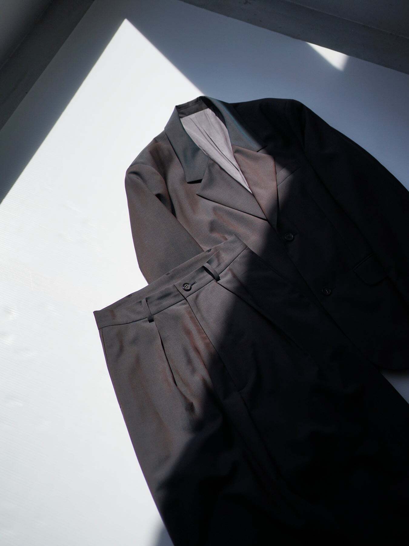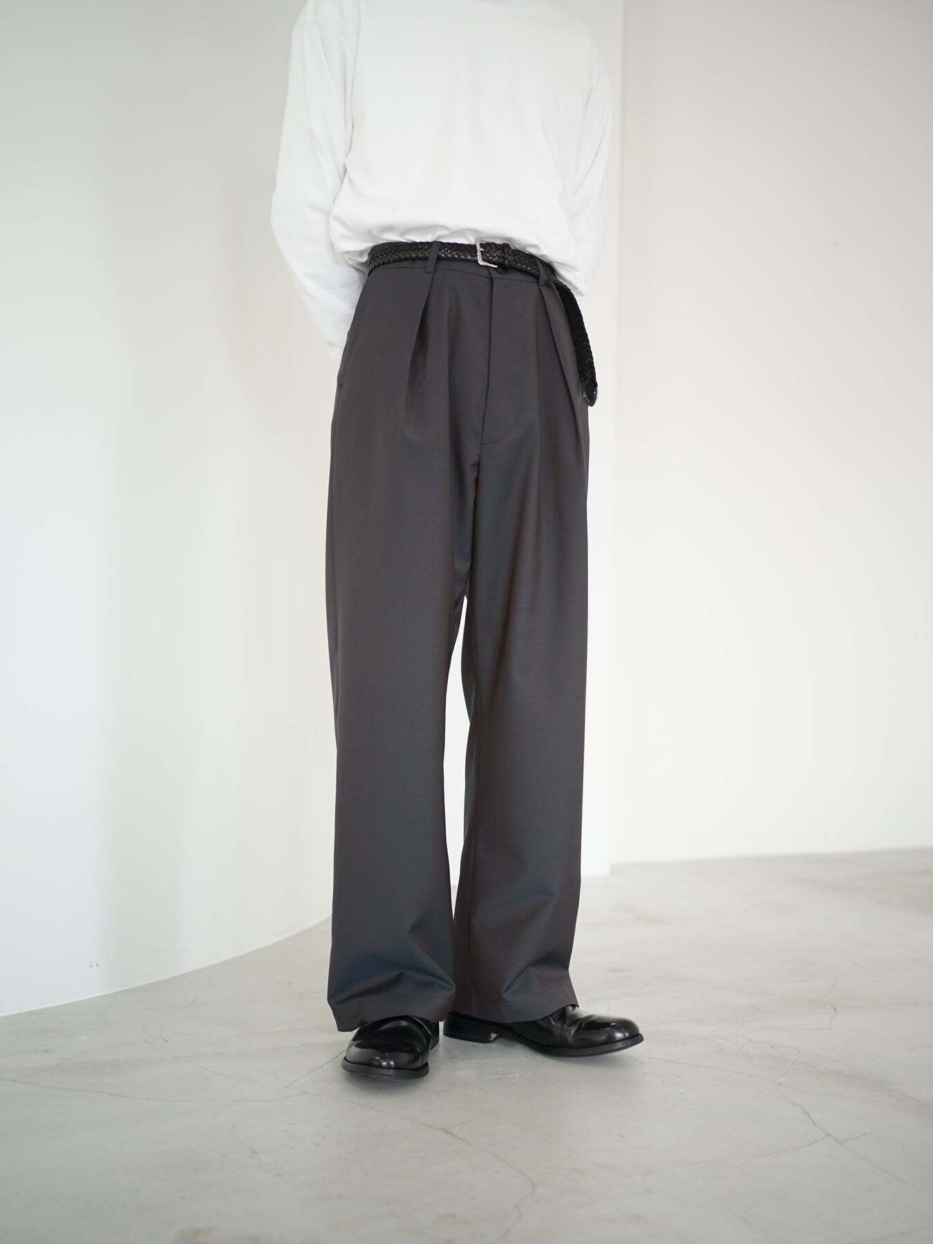 ディテールはミニマルに、深めのタックが生む可動域と落ち感の均衡で、装飾ではなく構造そのもの**の美しさを描きます。