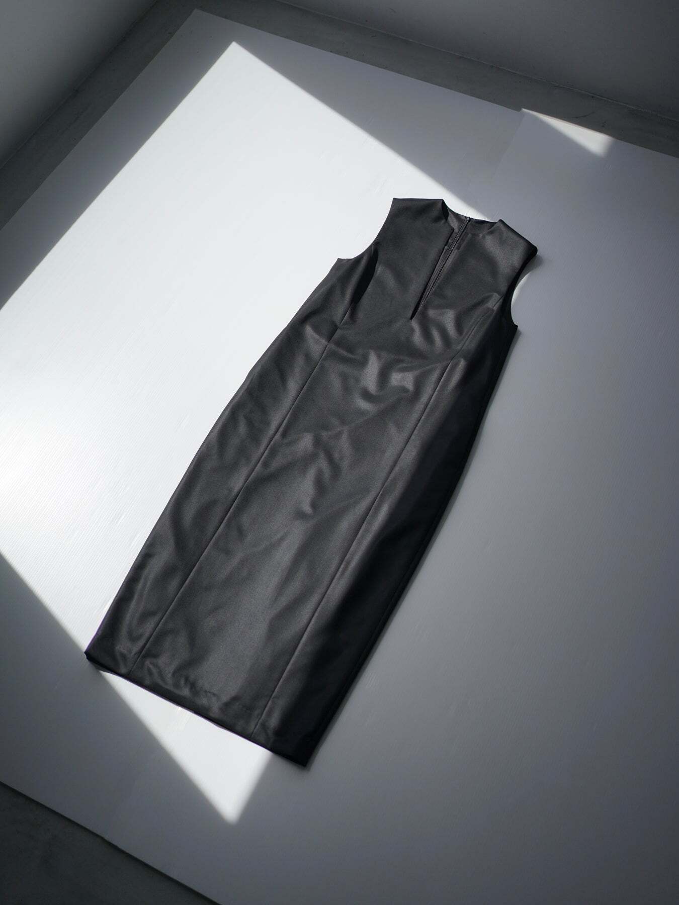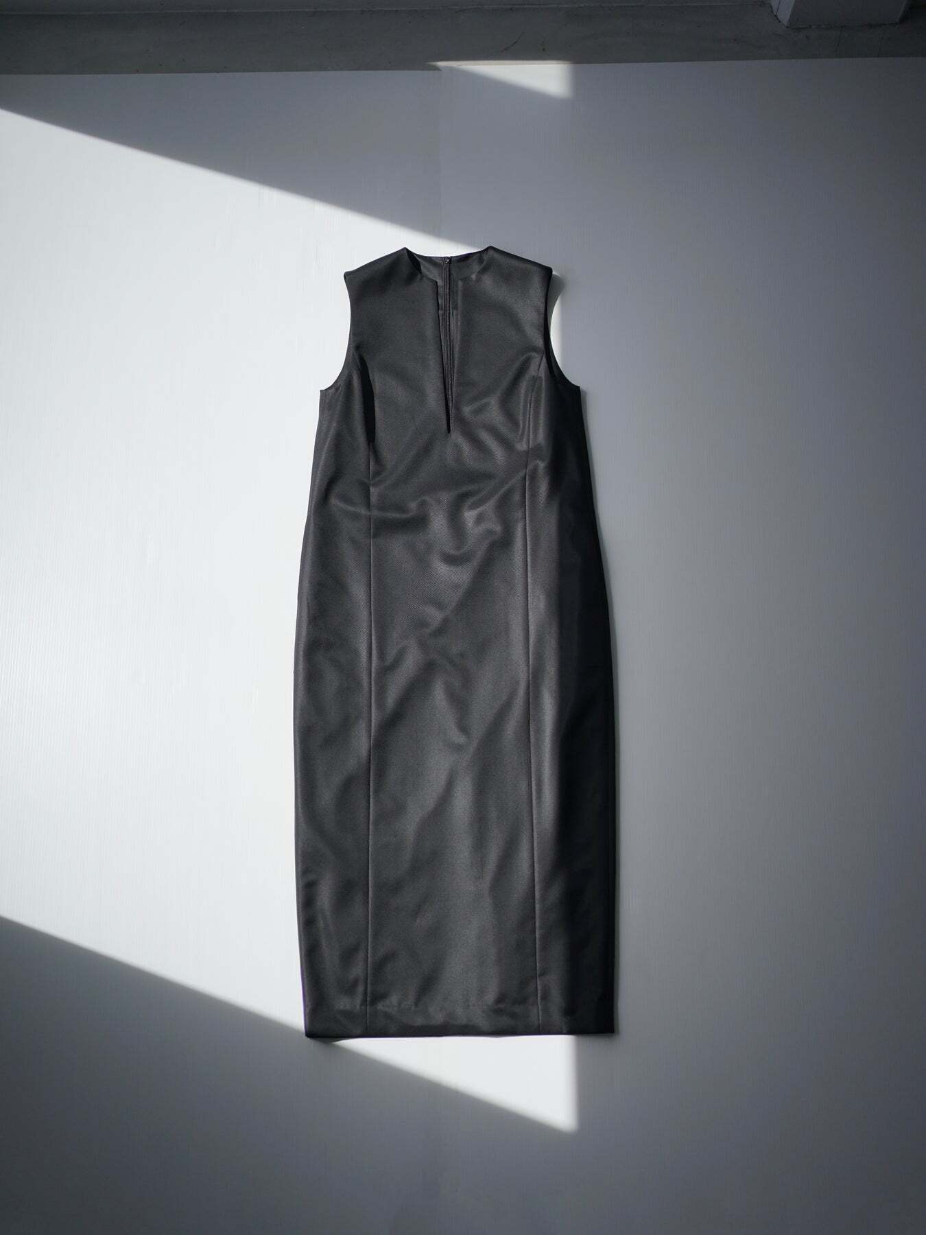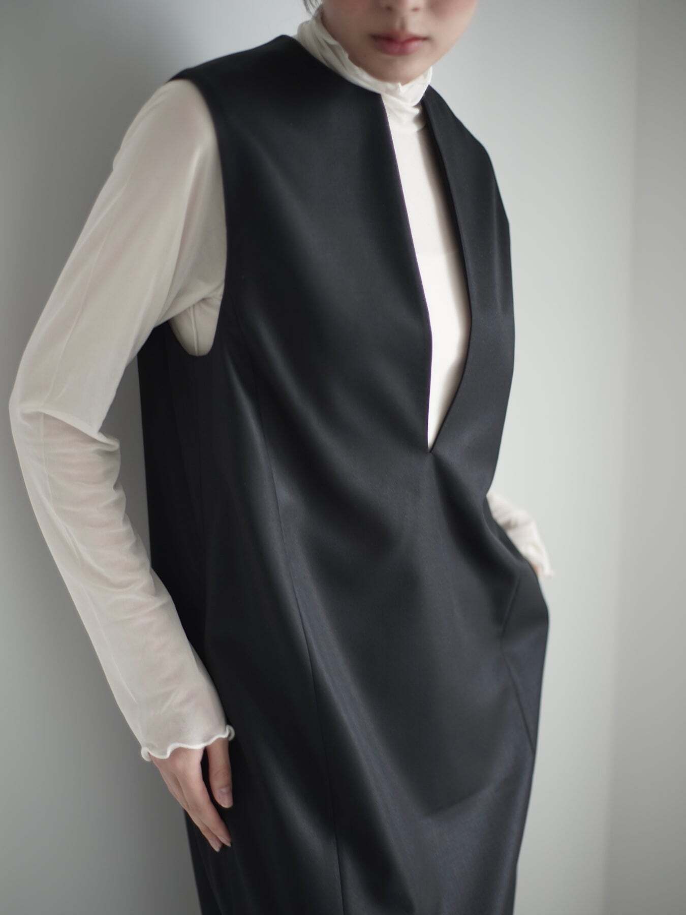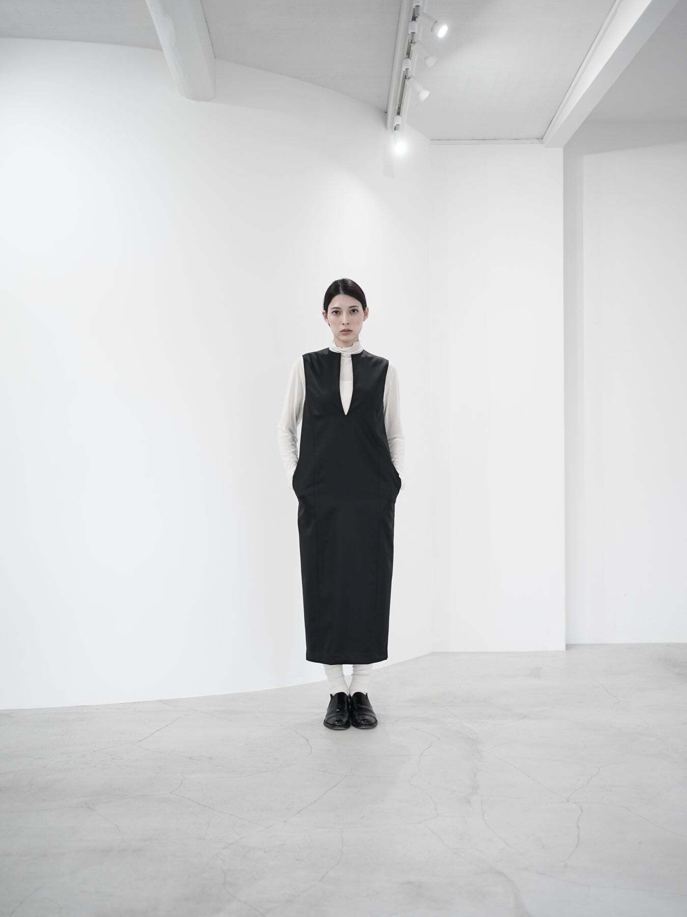 ・キーネックが顔まわりをすっきり見せる、ミニマルなジャンパースカート