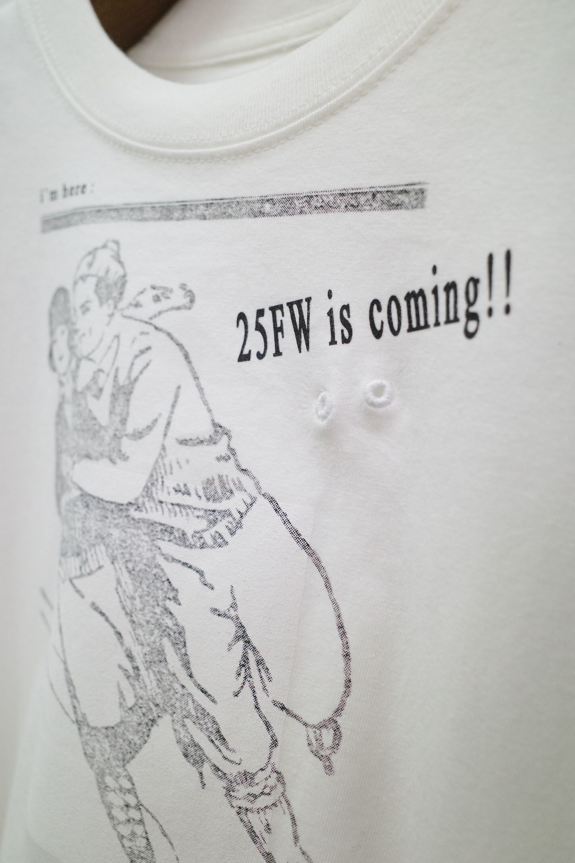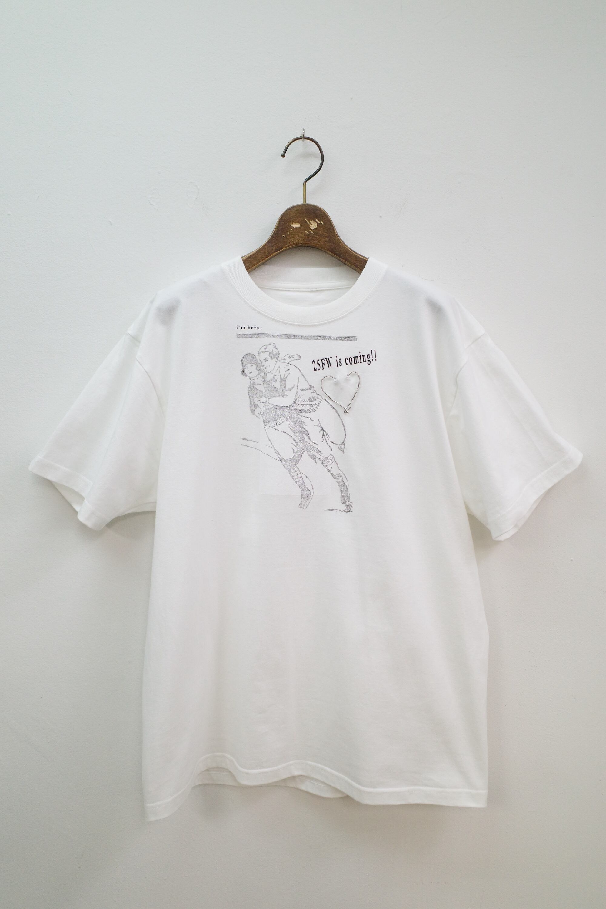 The front features a tone-on-tone square layered with a graphic skating couple motif. At the left chest, two embroidered eyelets let you attach a brass heart charm, each one hand-bent by an artisan (detachable). No two hearts are exactly the same. In Black, the motif blends with the body so it appears and disappears with the light; in White, the contrast is crisp so the graphic takes center stage. It works both as a clean, plain tee and as an accent piece—perfect for the FW kickoff.