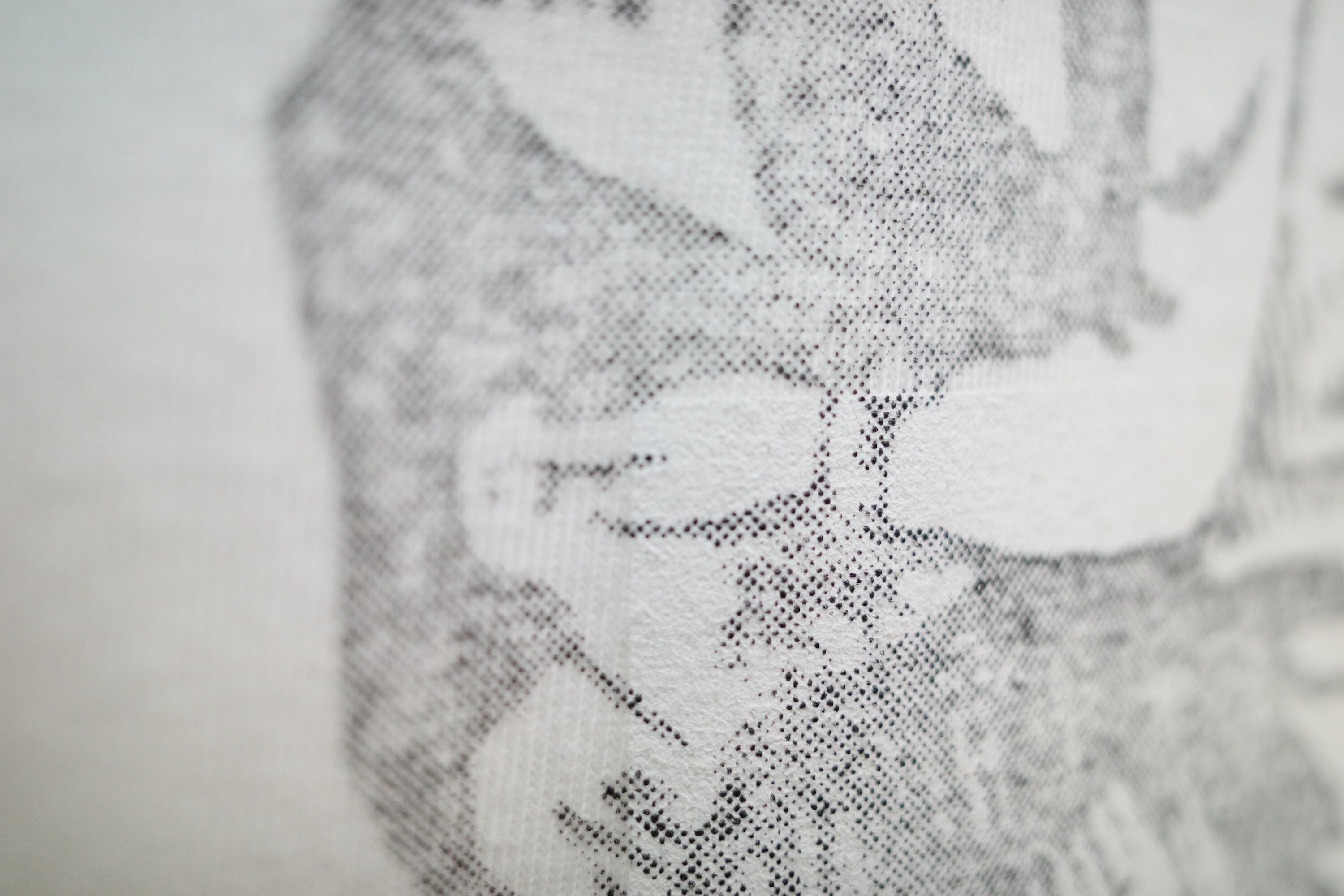 同じ形は二つとない非対称フォルムがさりげない個性に。Blackはトーン・オン・トーンで光の加減で柄が見え隠れ、Whiteはコントラストが立って主役に。プレーンTとしても、アクセントTとしても活躍する、FW立ち上がりにちょうどいい一枚です。