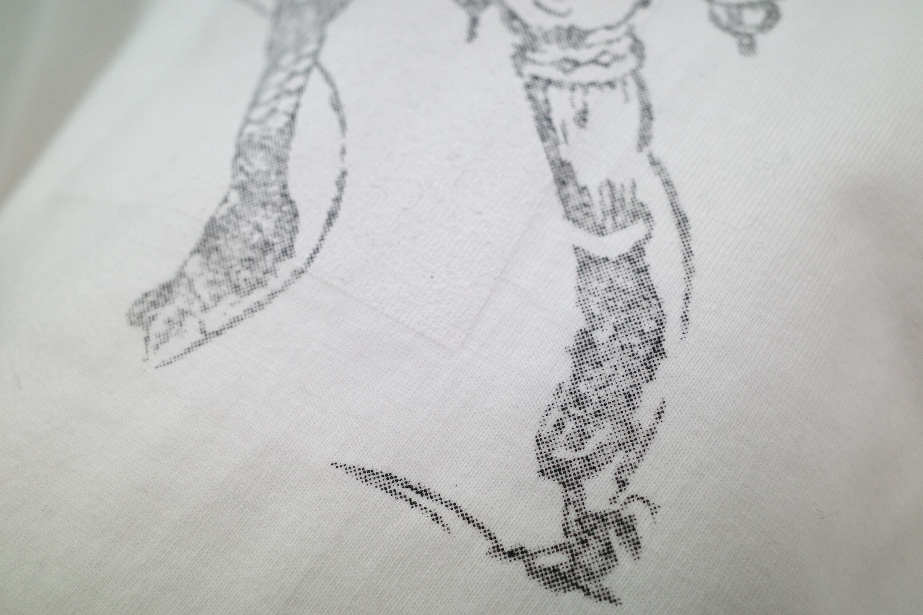 ・A. 生地は**コットン天竺(中肉)**で、White(白)は透け感少なめ。一応肌に近い色(ベージュ/グレージュ)のインナーやシームレスを推奨します。Black(黒)はほぼ透けません。プリントのあるフロントは視覚的に透けにくく、ユニセックスTシャツとして一枚着でも、レイヤードでも快適に着用いただけます。Made in Japan/トーン・オン・トーン/スケートモチーフの表情を活かしたい場合は、インナーの色をボディカラーに近づけるのがコツです。