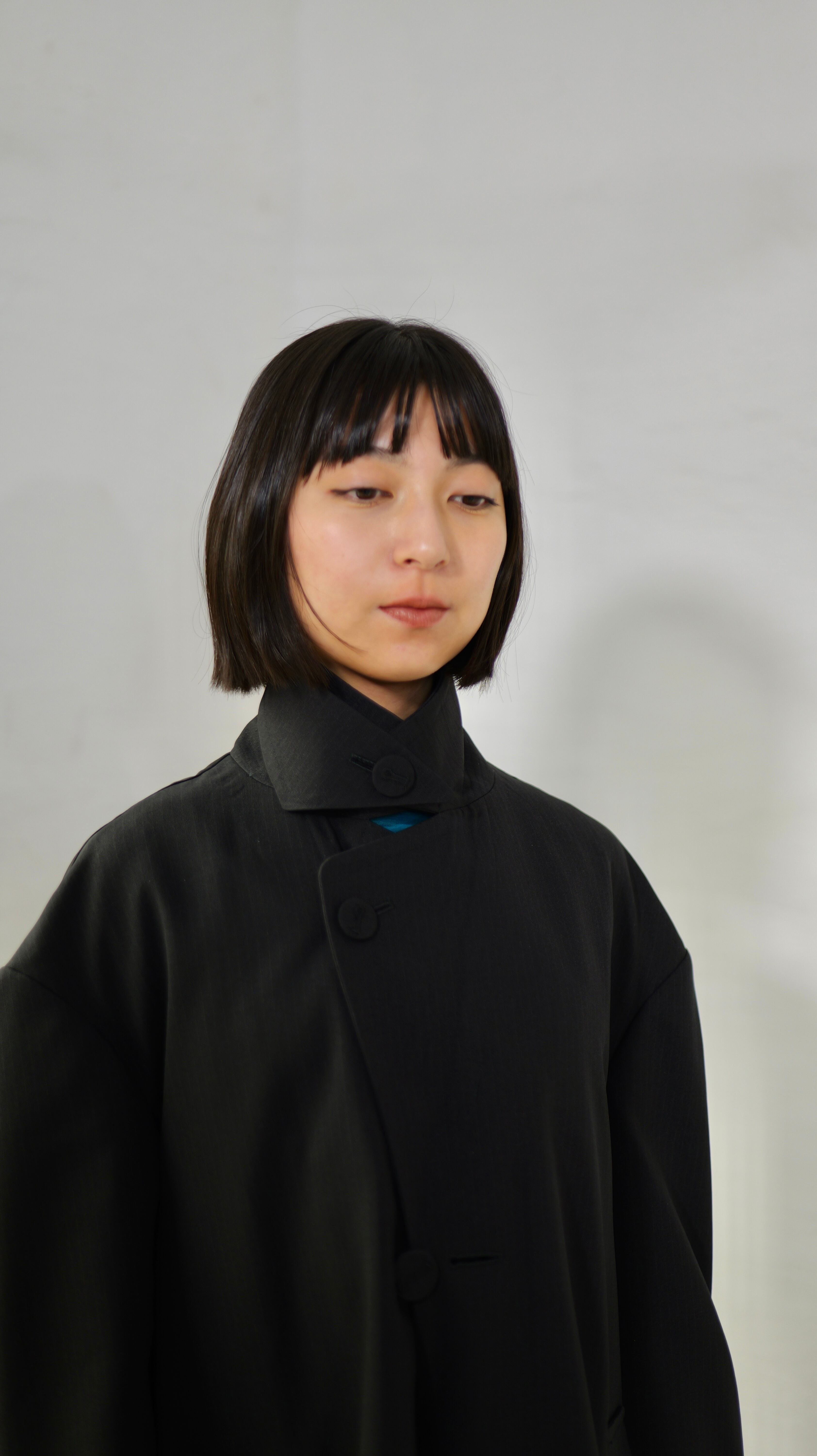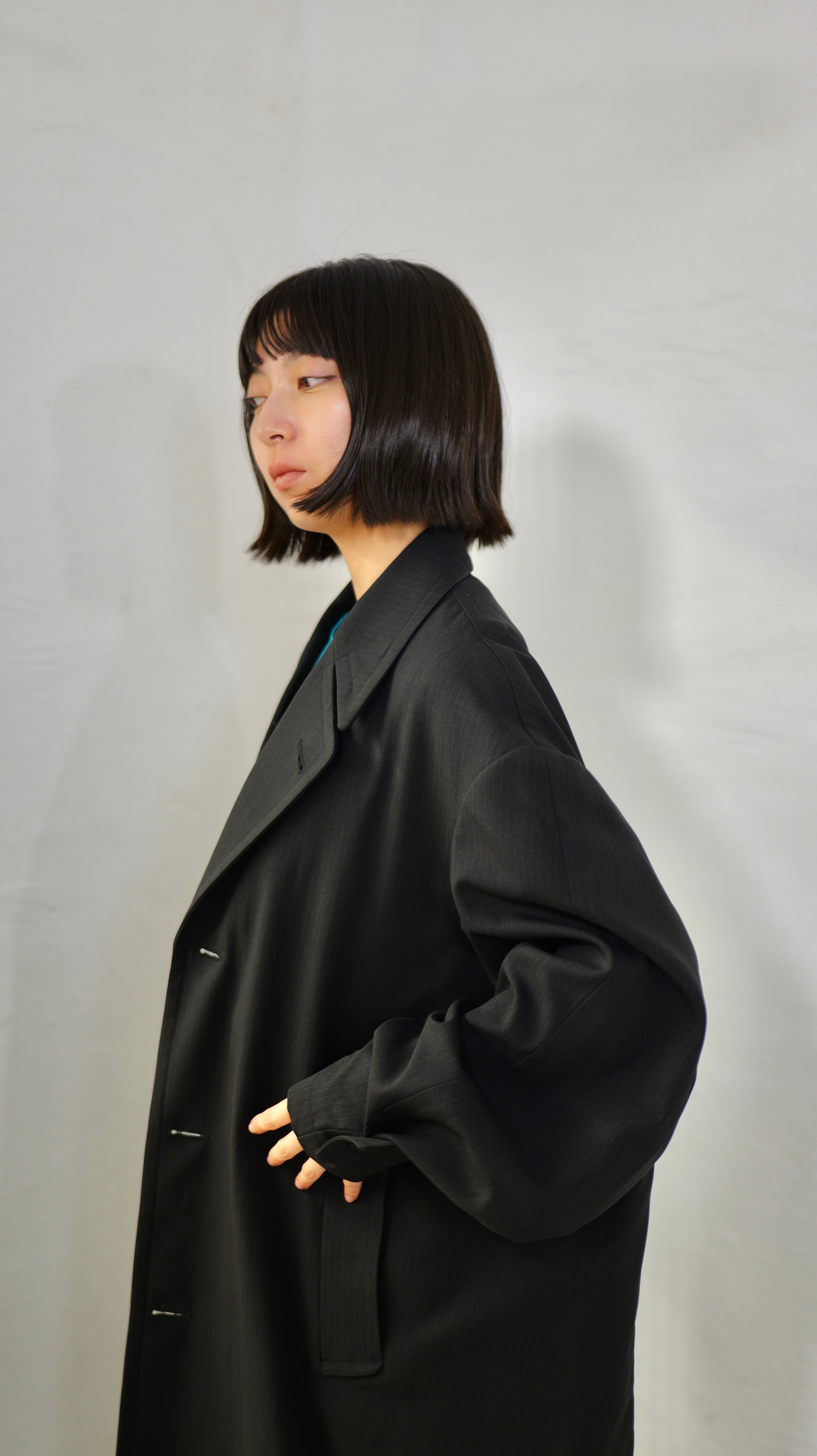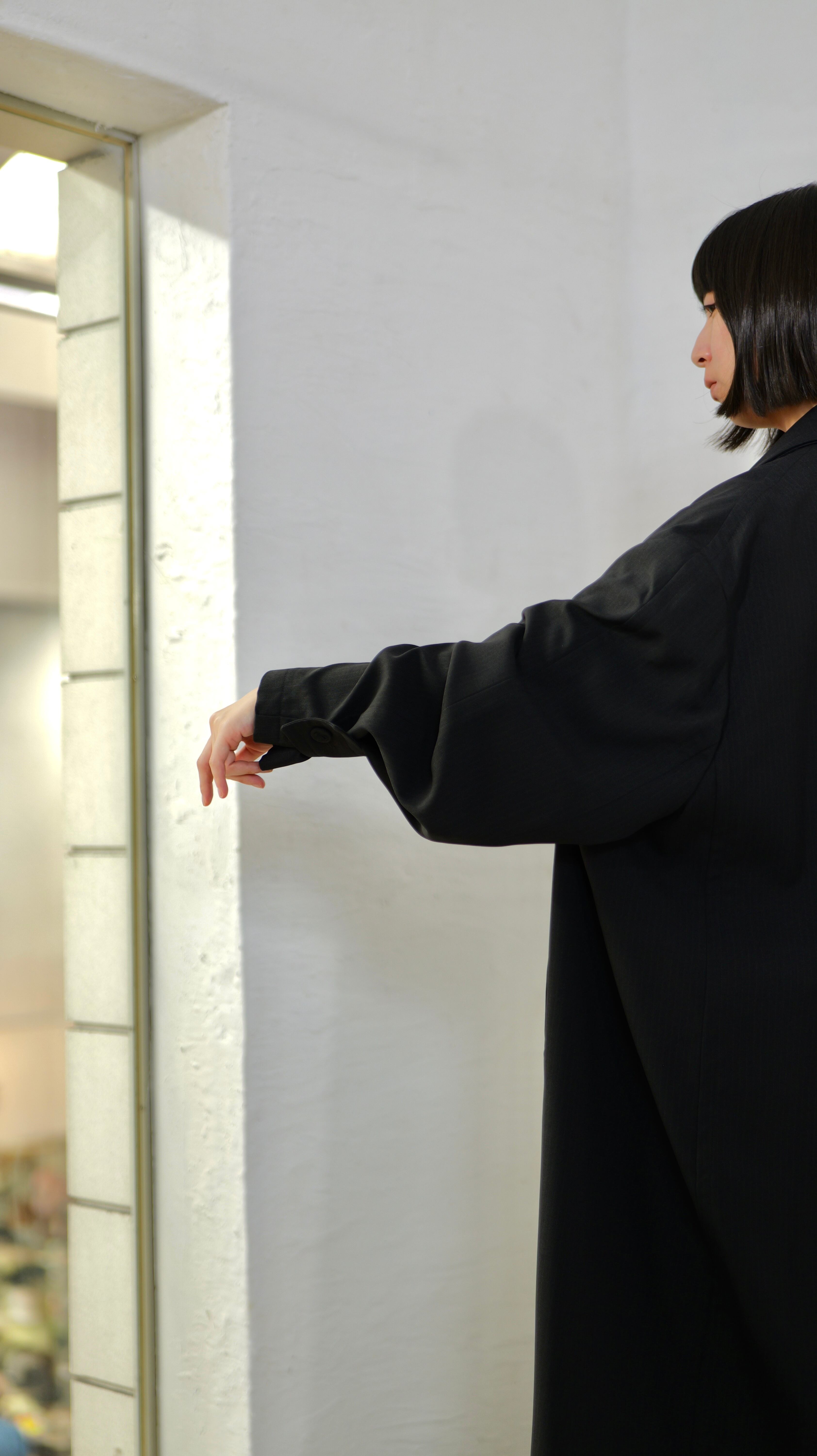 i’m here - GRANDPA COAT : 1 :Black|グランパコート/ロングコート/ユニセックス/ウールライクポリエステル(ストライプ見え)/トロンプルイユ刺繍