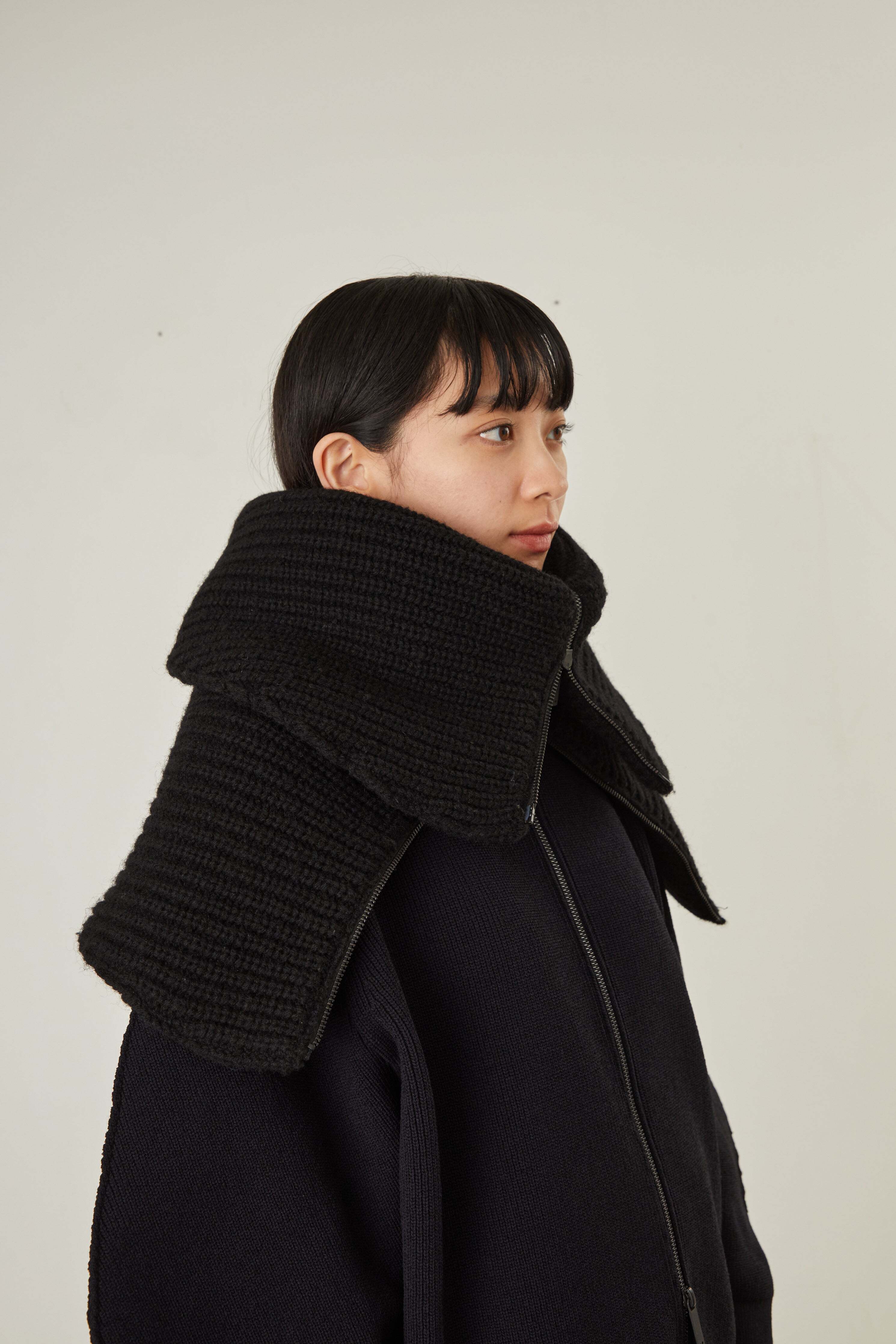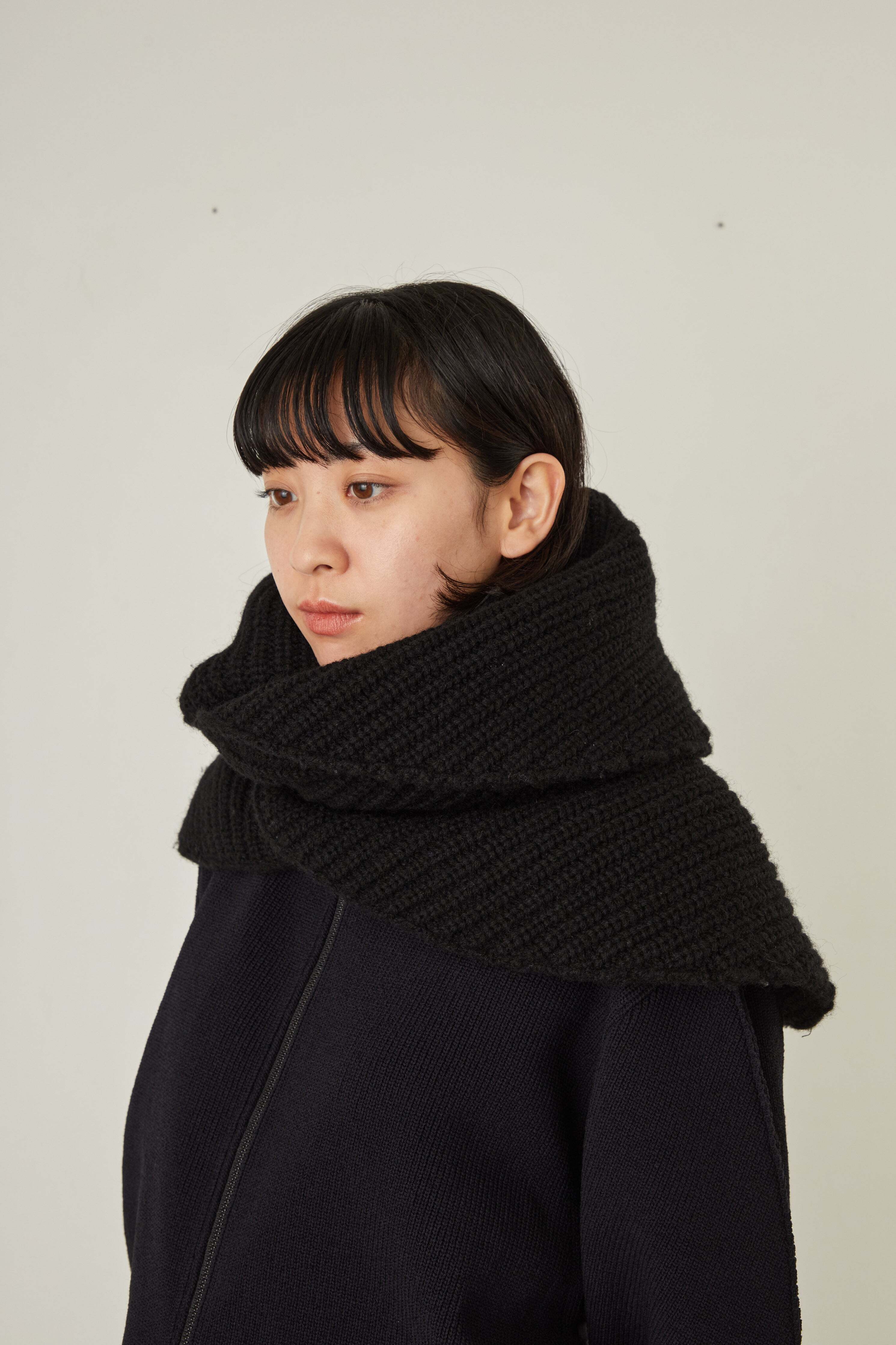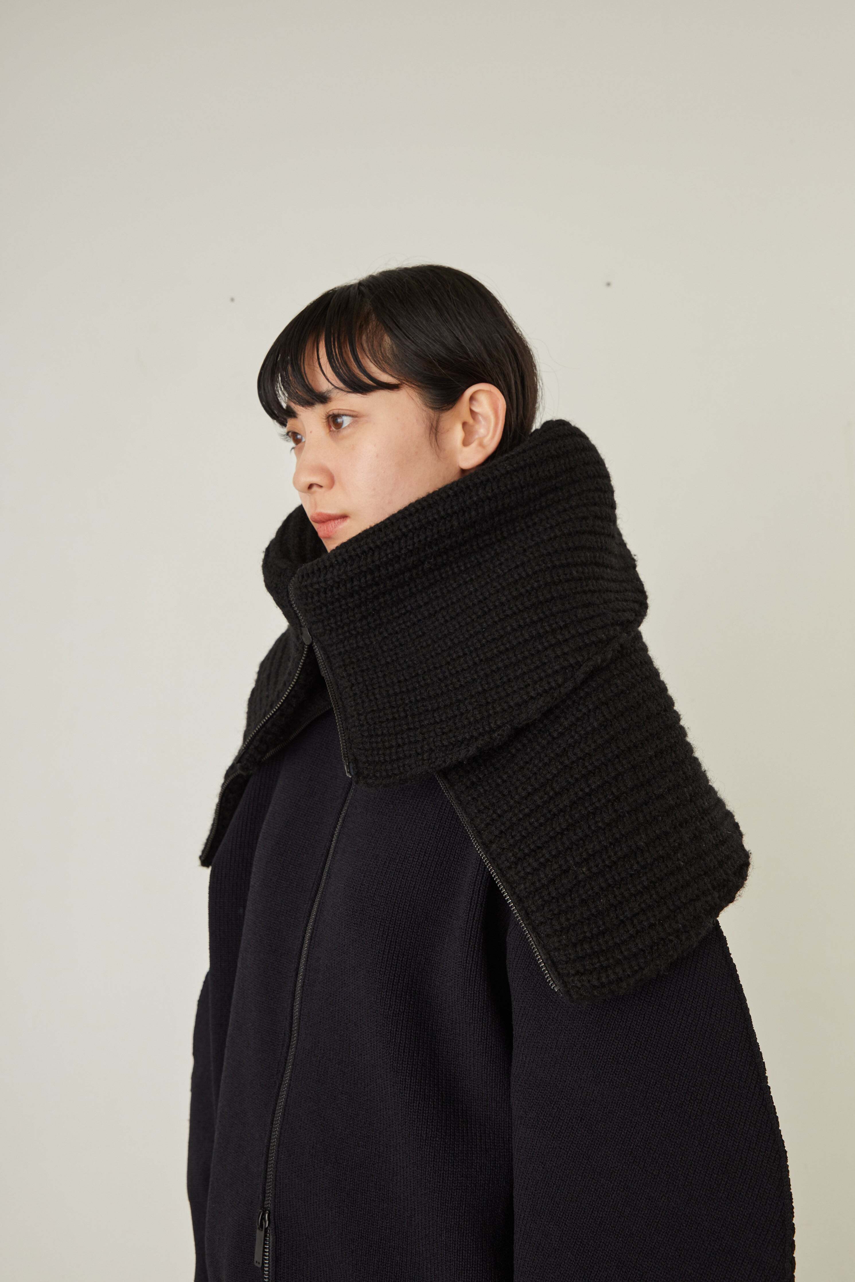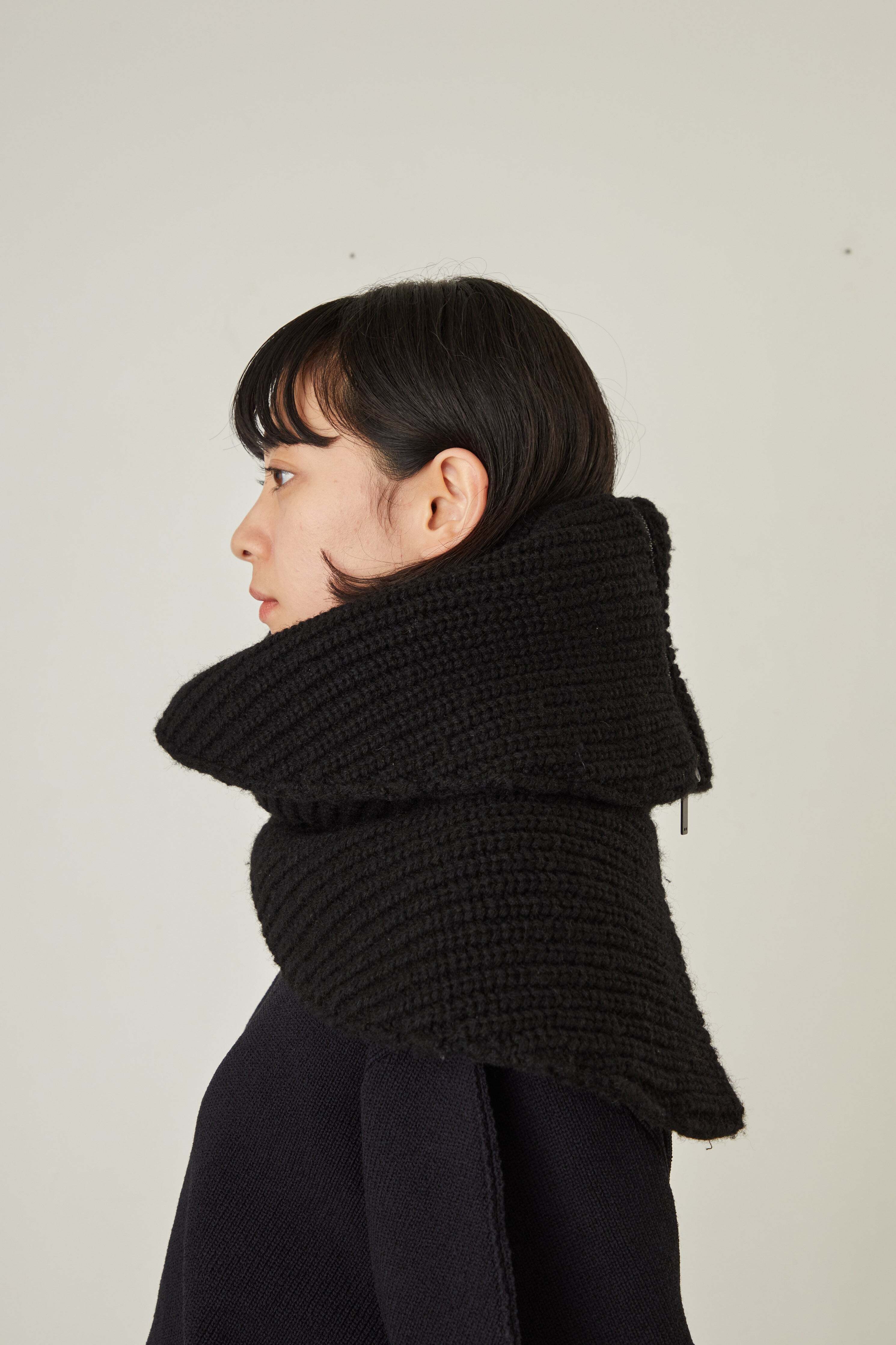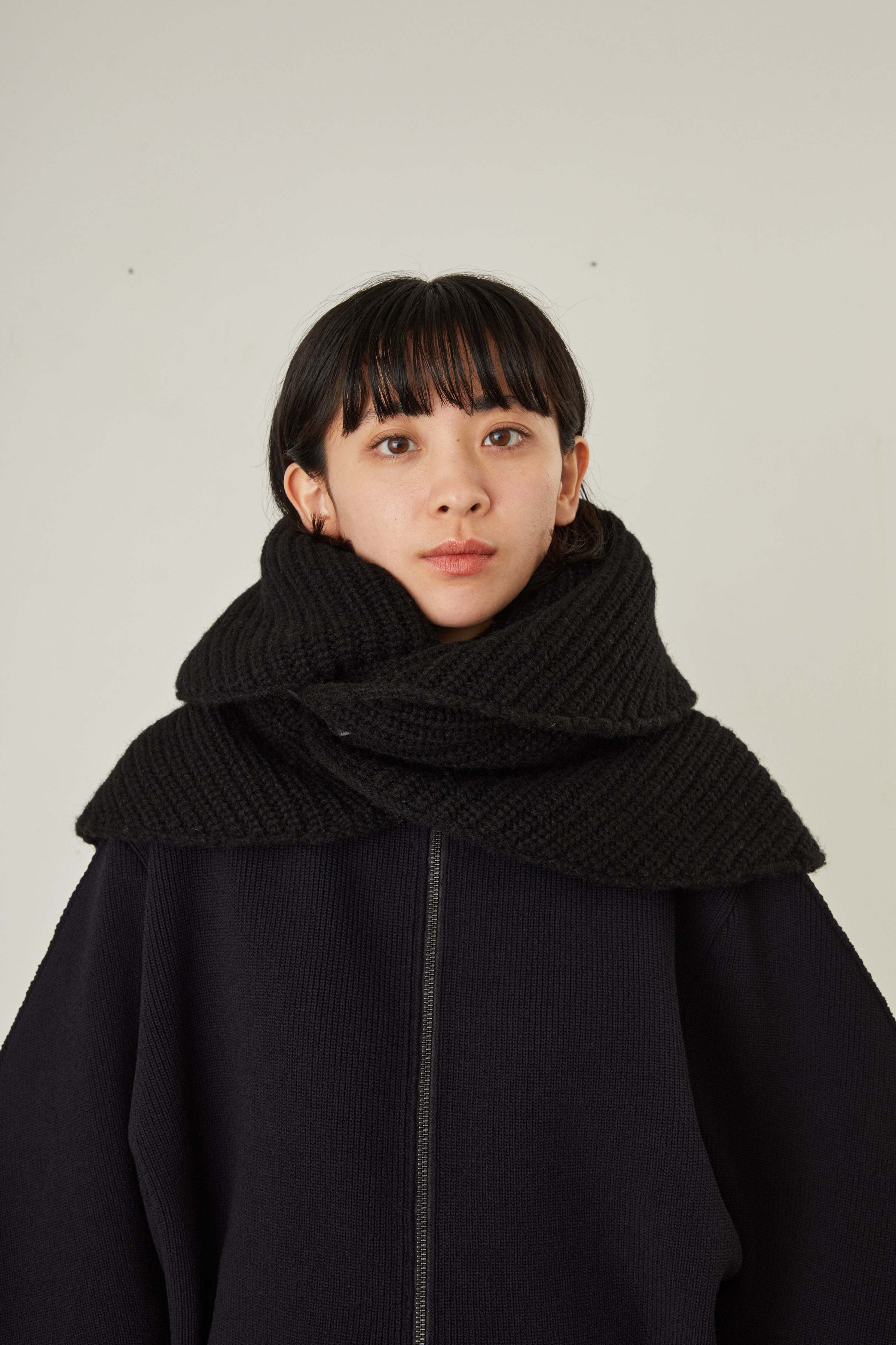 i’m here - Knit Snood(Crepe Wool-like) :Black|サークル状/片畦編み/ダブルジップ/ホーン・トグル/レザーパーツ