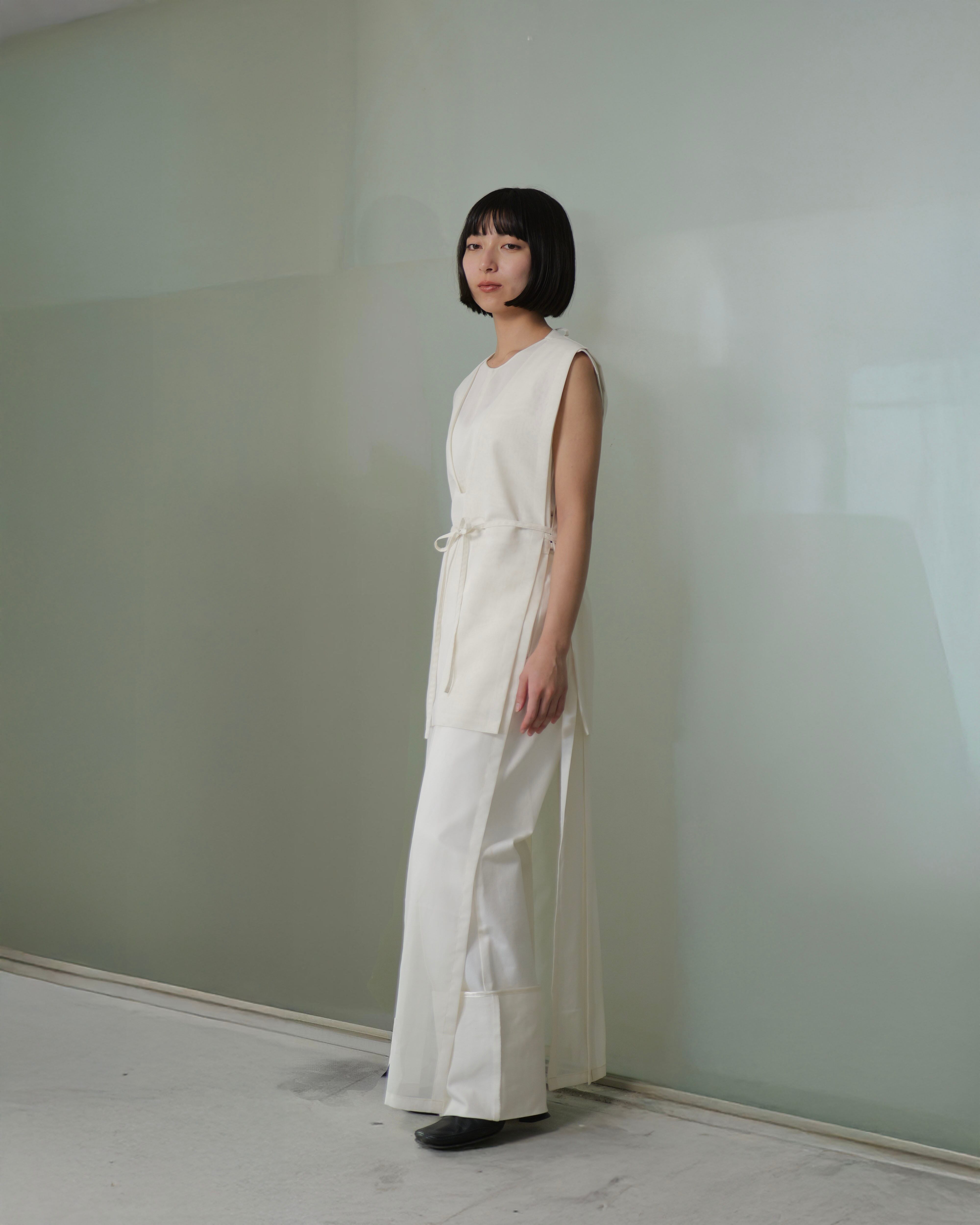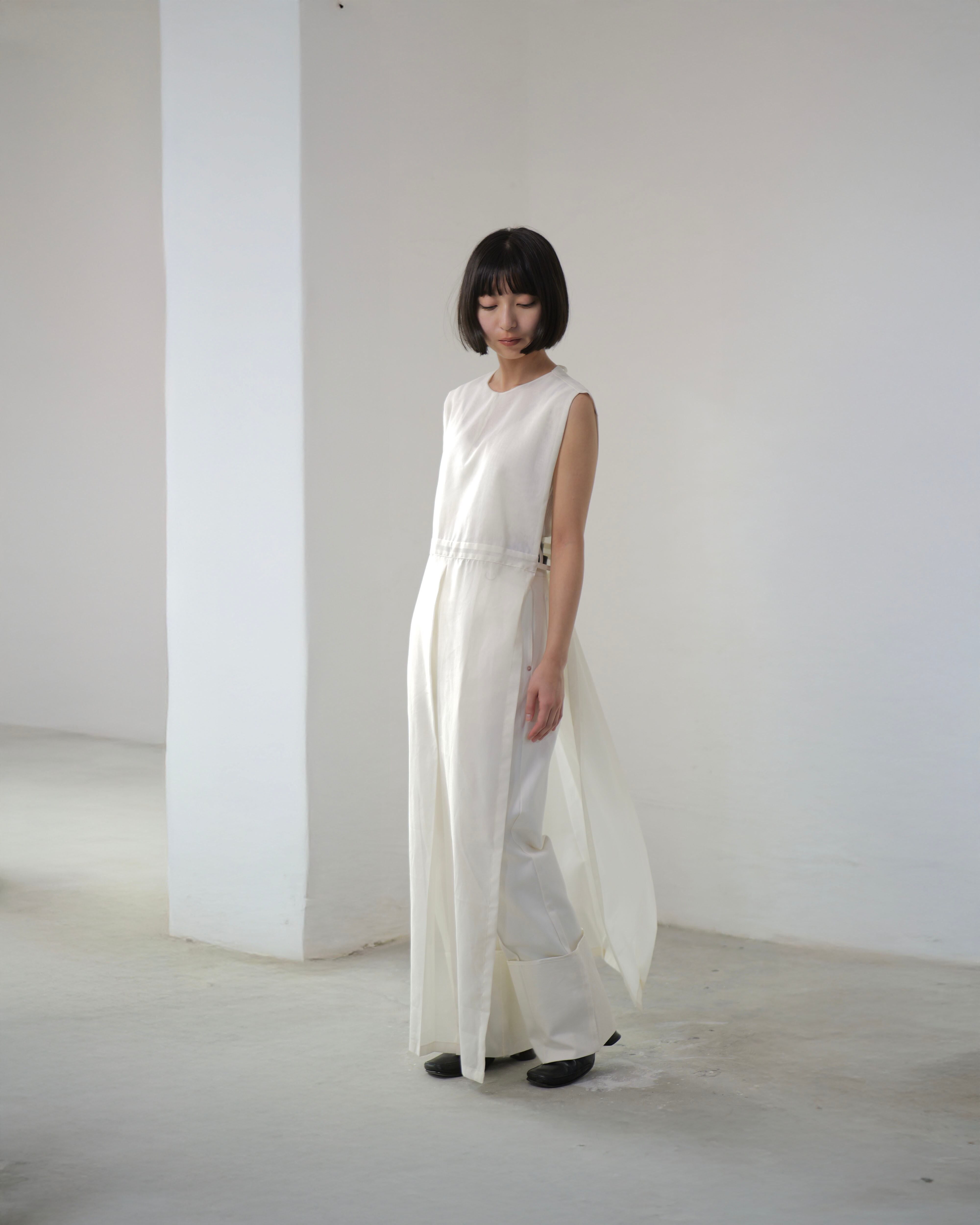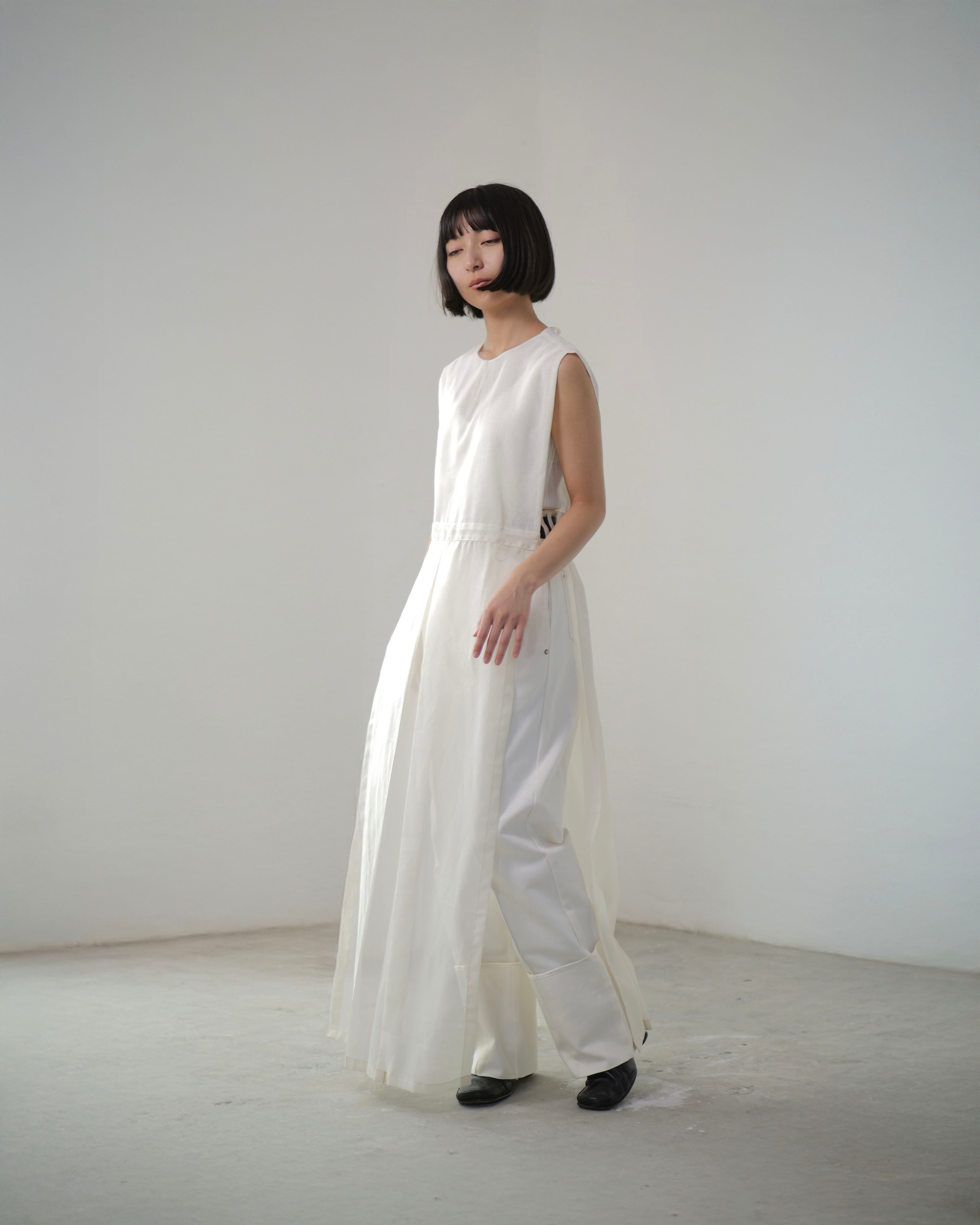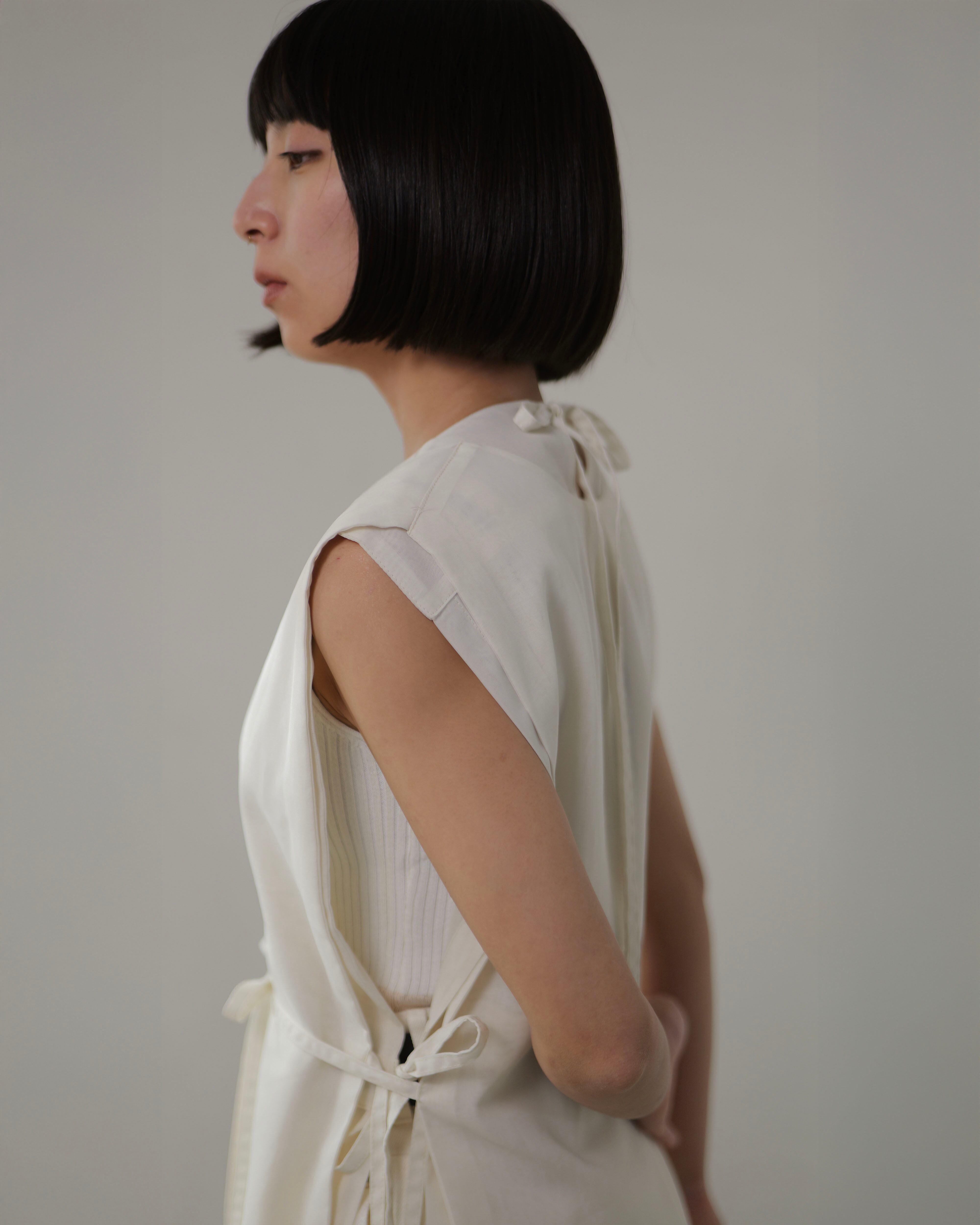 ワンピースはサイドを縫い合わせない、紐(ドローコード)で結ぶ設計で、脇は必ず見える仕様。下に重ねるアイテムとのコントラストで表情が変化します。