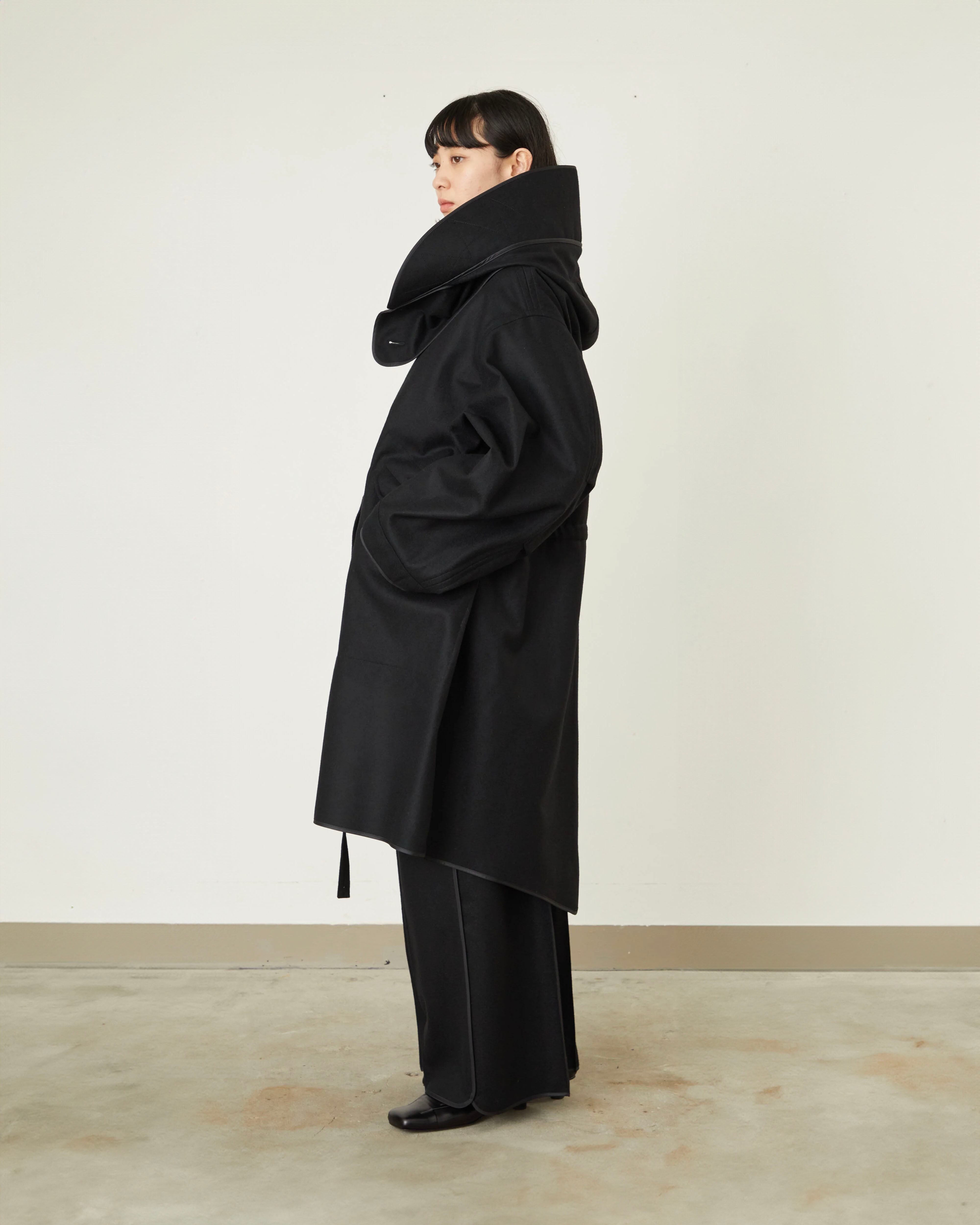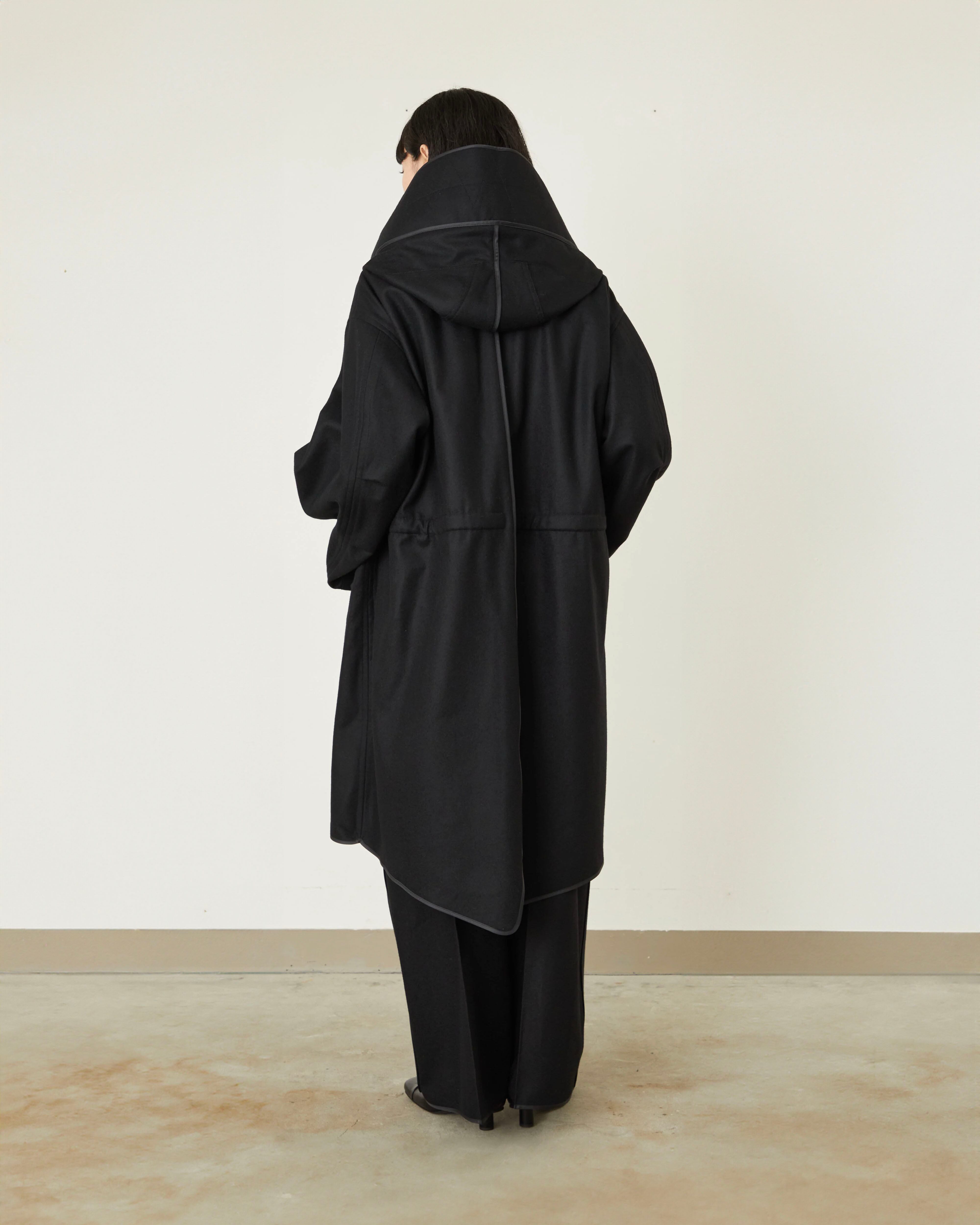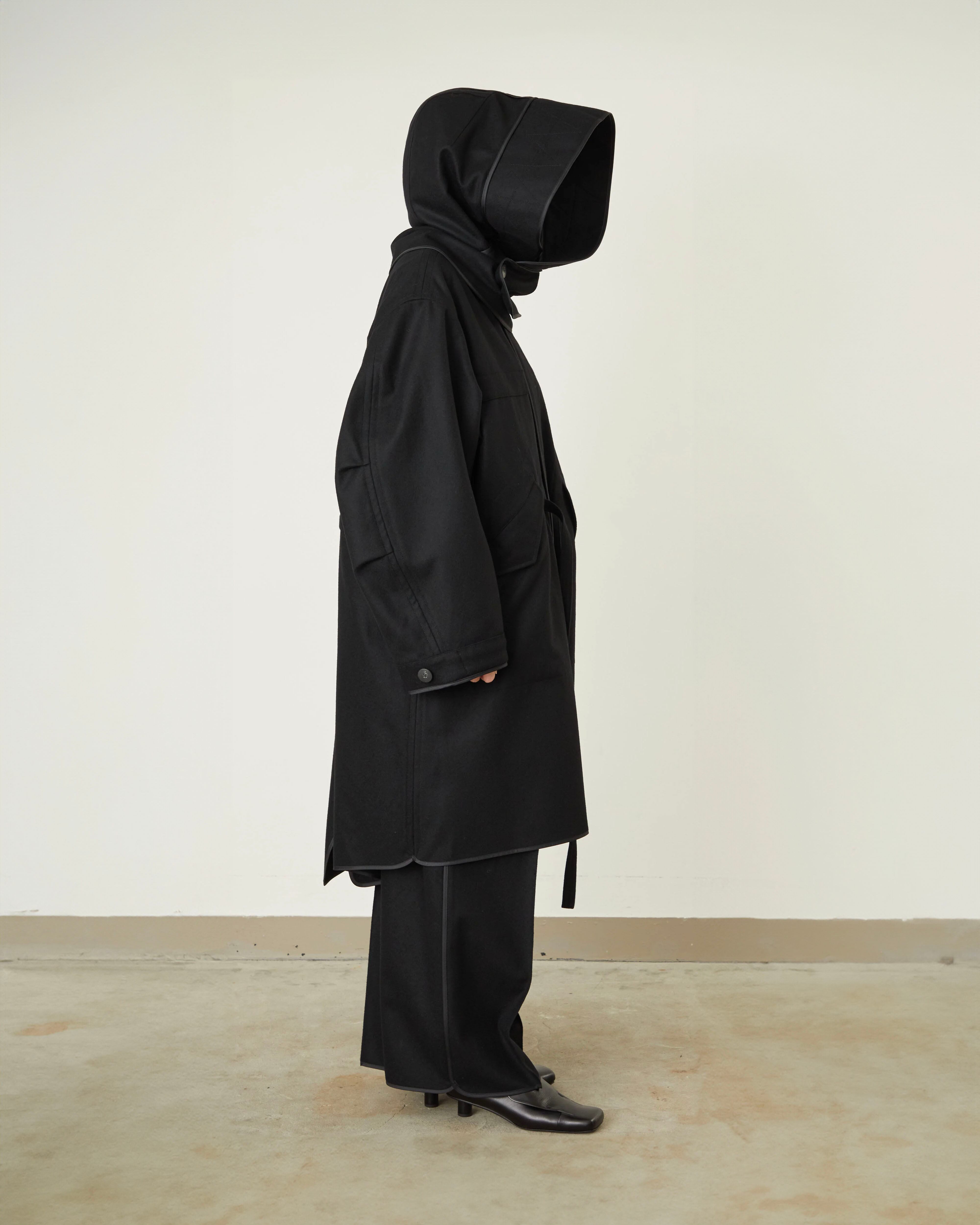 上品な光沢のウール・ライトメルトンに、光沢裏地の異素材パイピングを配し、アウトラインを際立たせました。