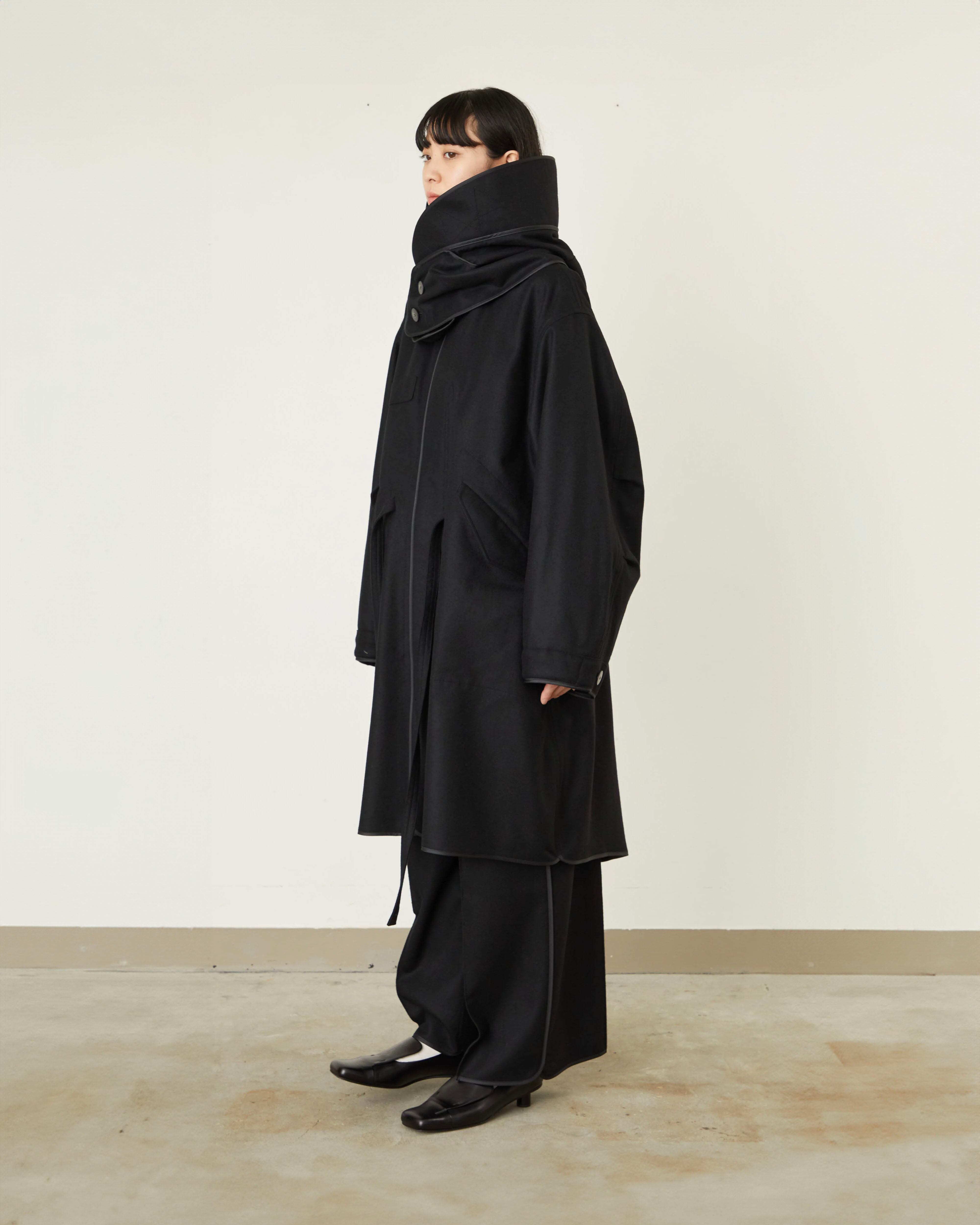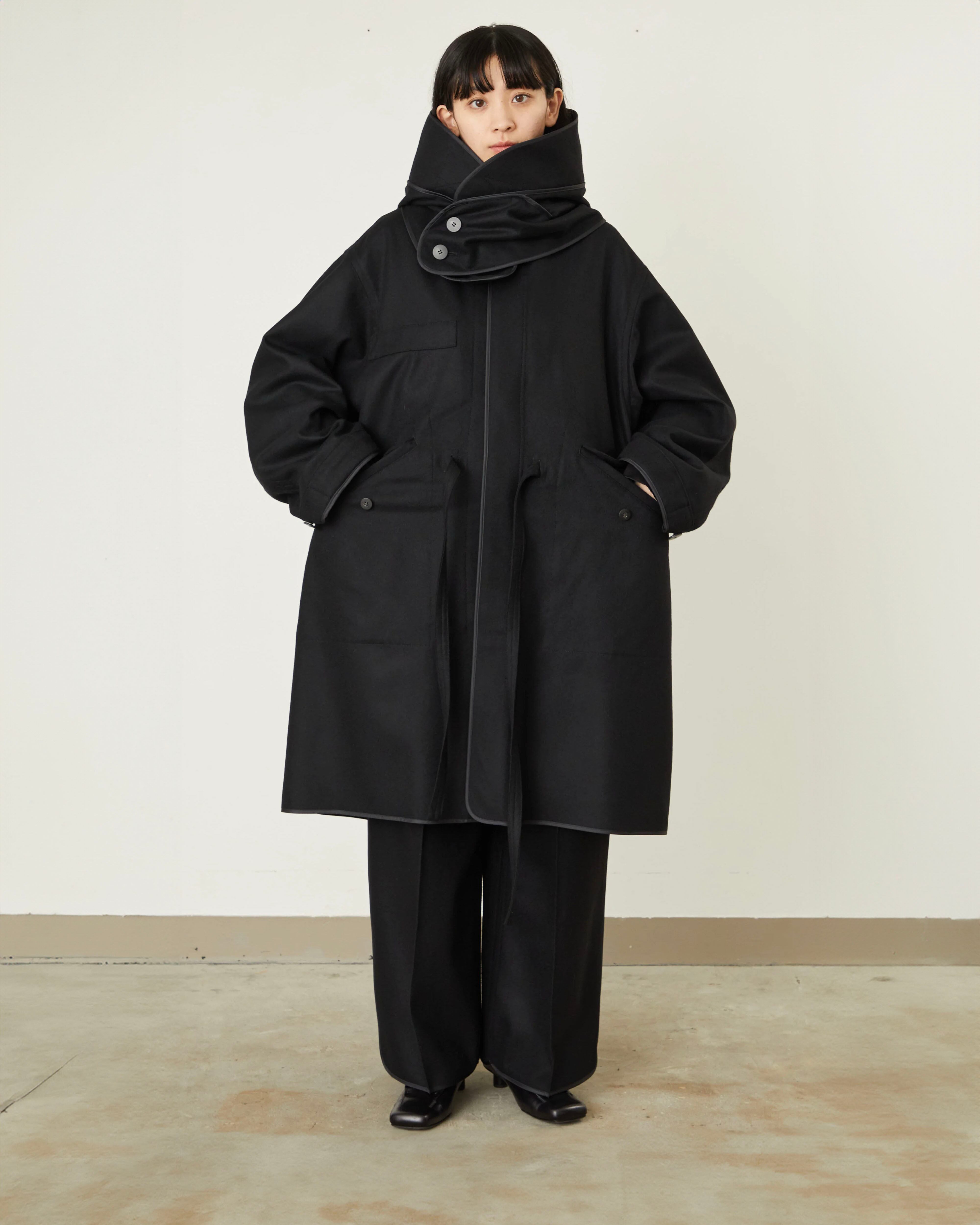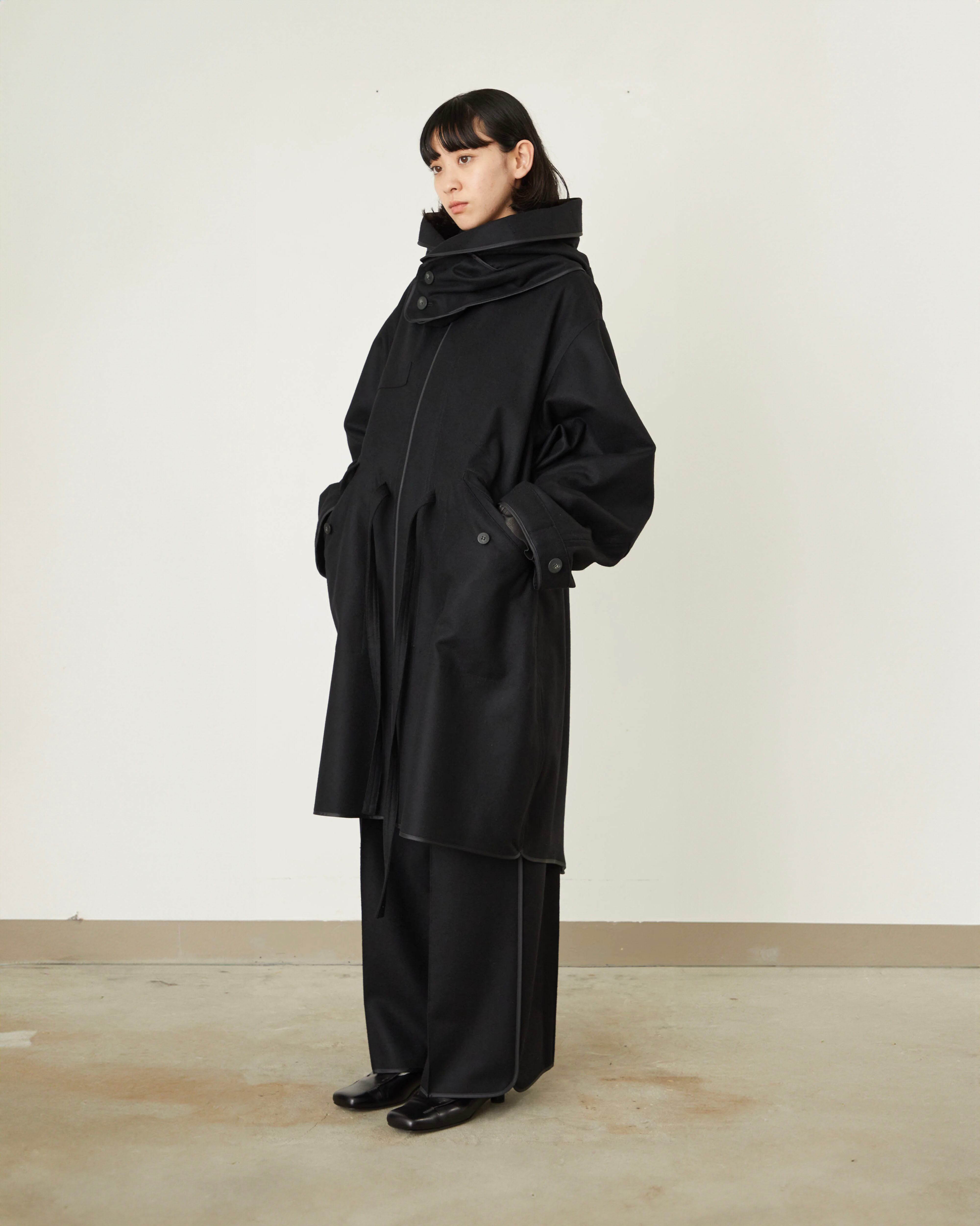 上品な光沢のウール・ライトメルトンに、光沢裏地の異素材パイピングを配し、アウトラインを際立たせました。