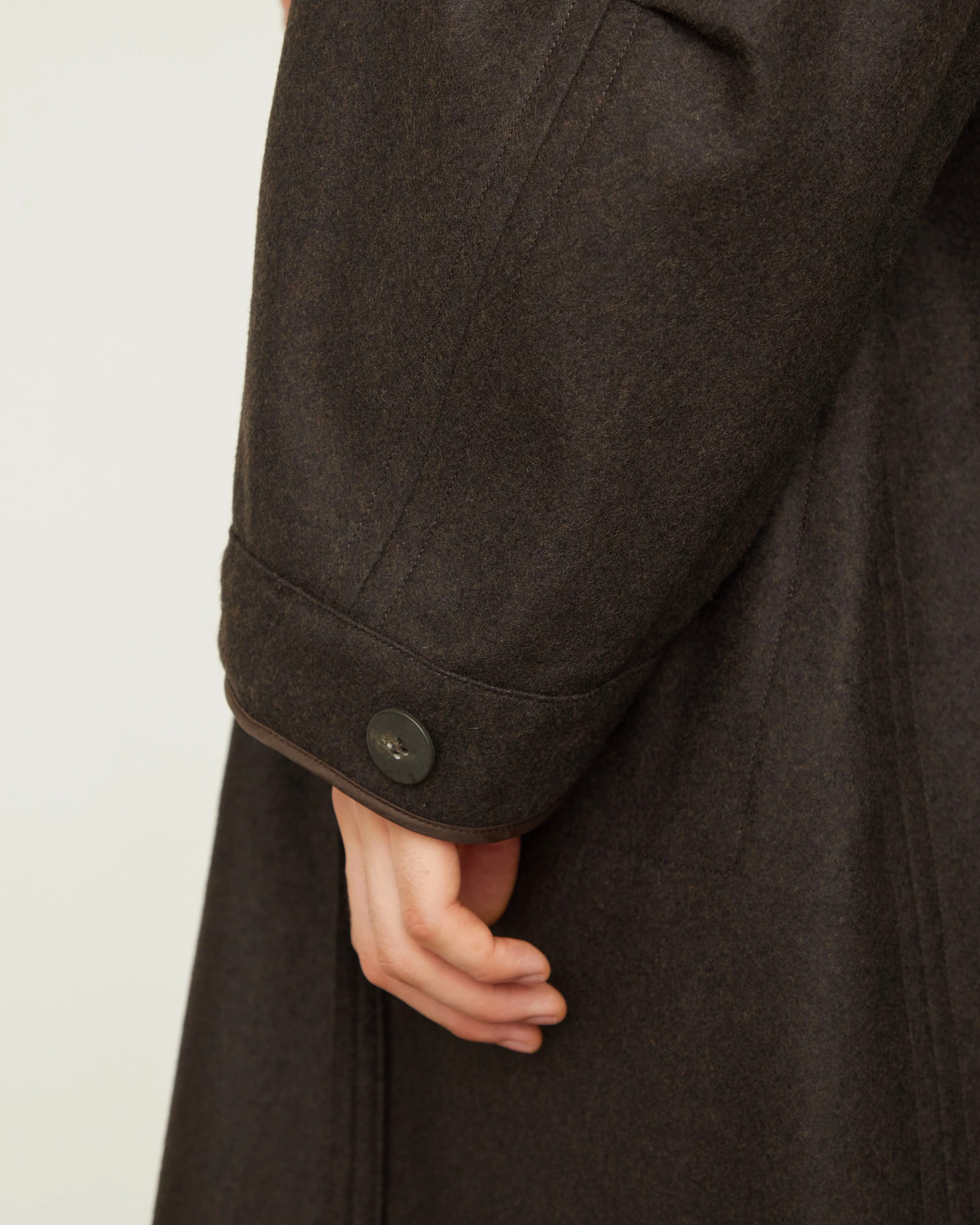 A wool light-melton with refined luster is traced by glossy-lined piping, sharpening the coat’s outline.