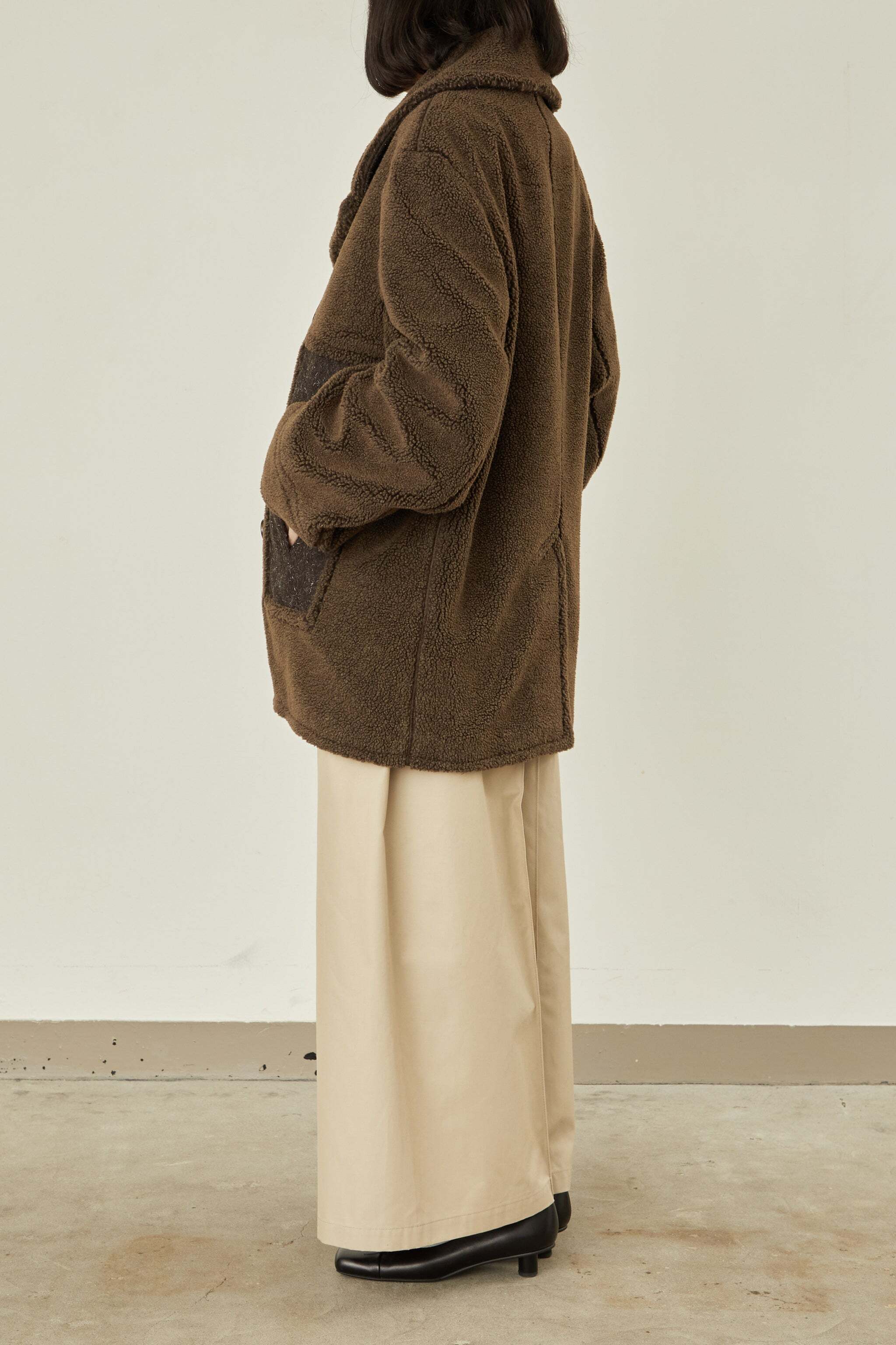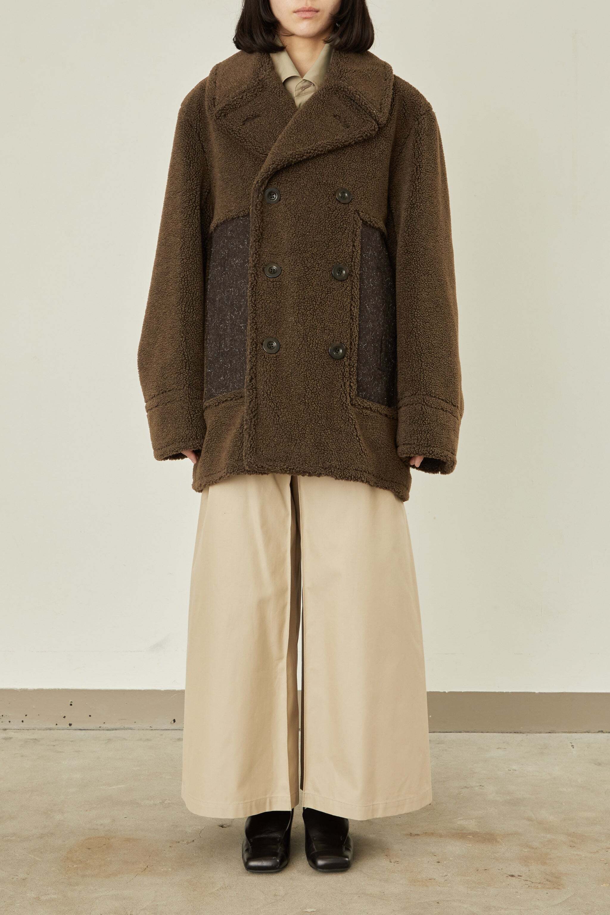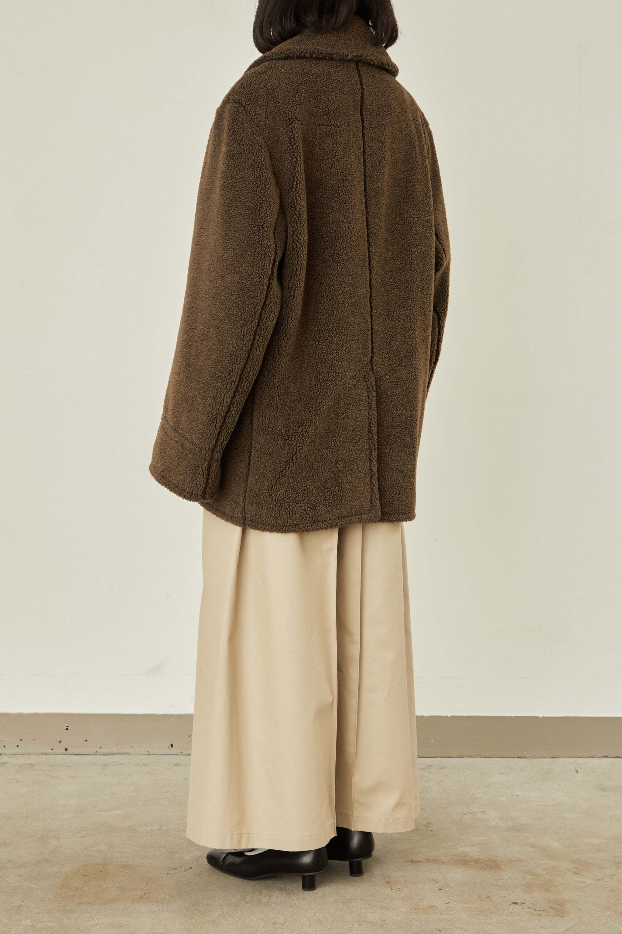 素材の厚みに頼らず、設計と仕立てでフォルムを立ち上げたボアPコートです。