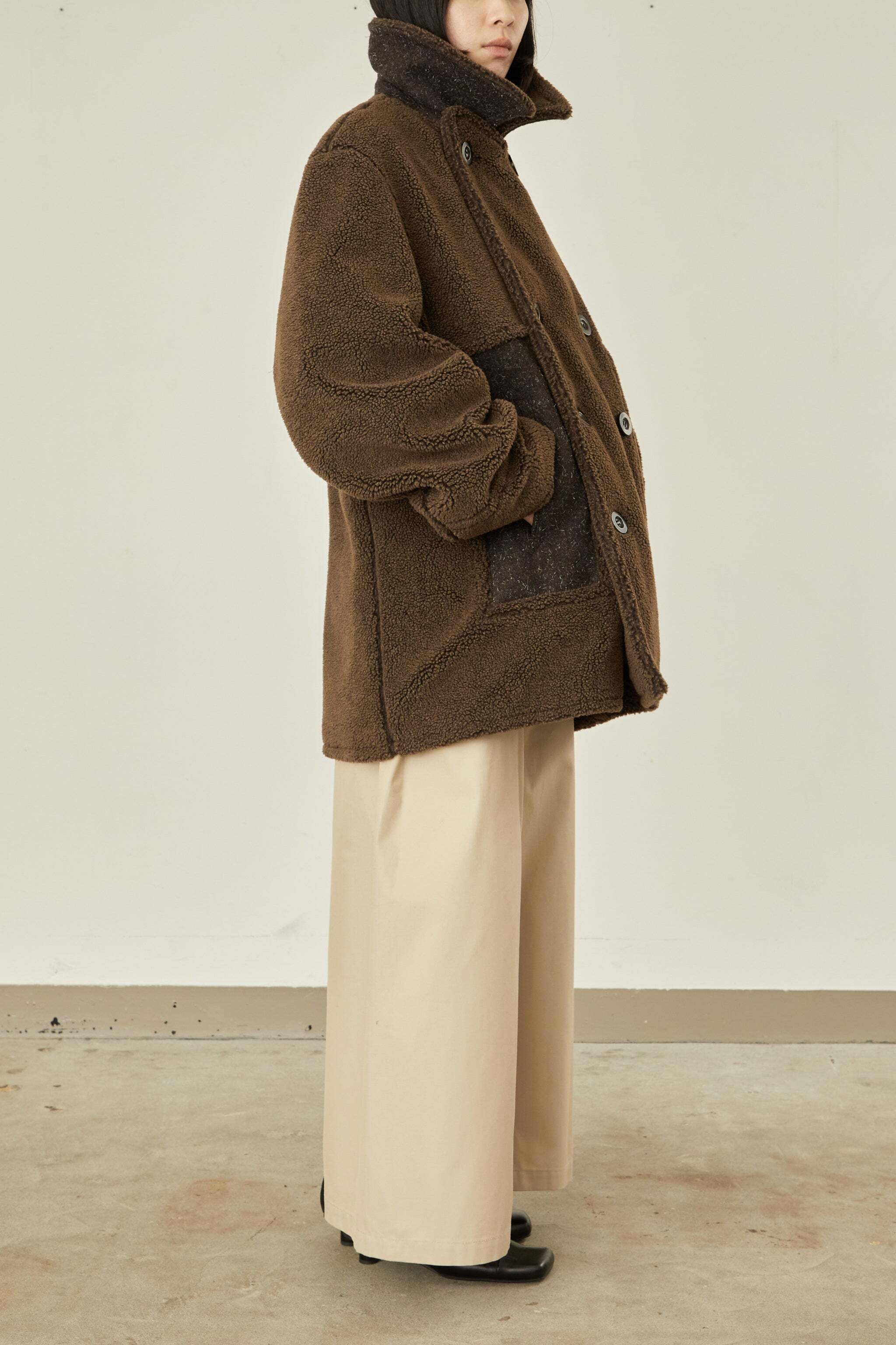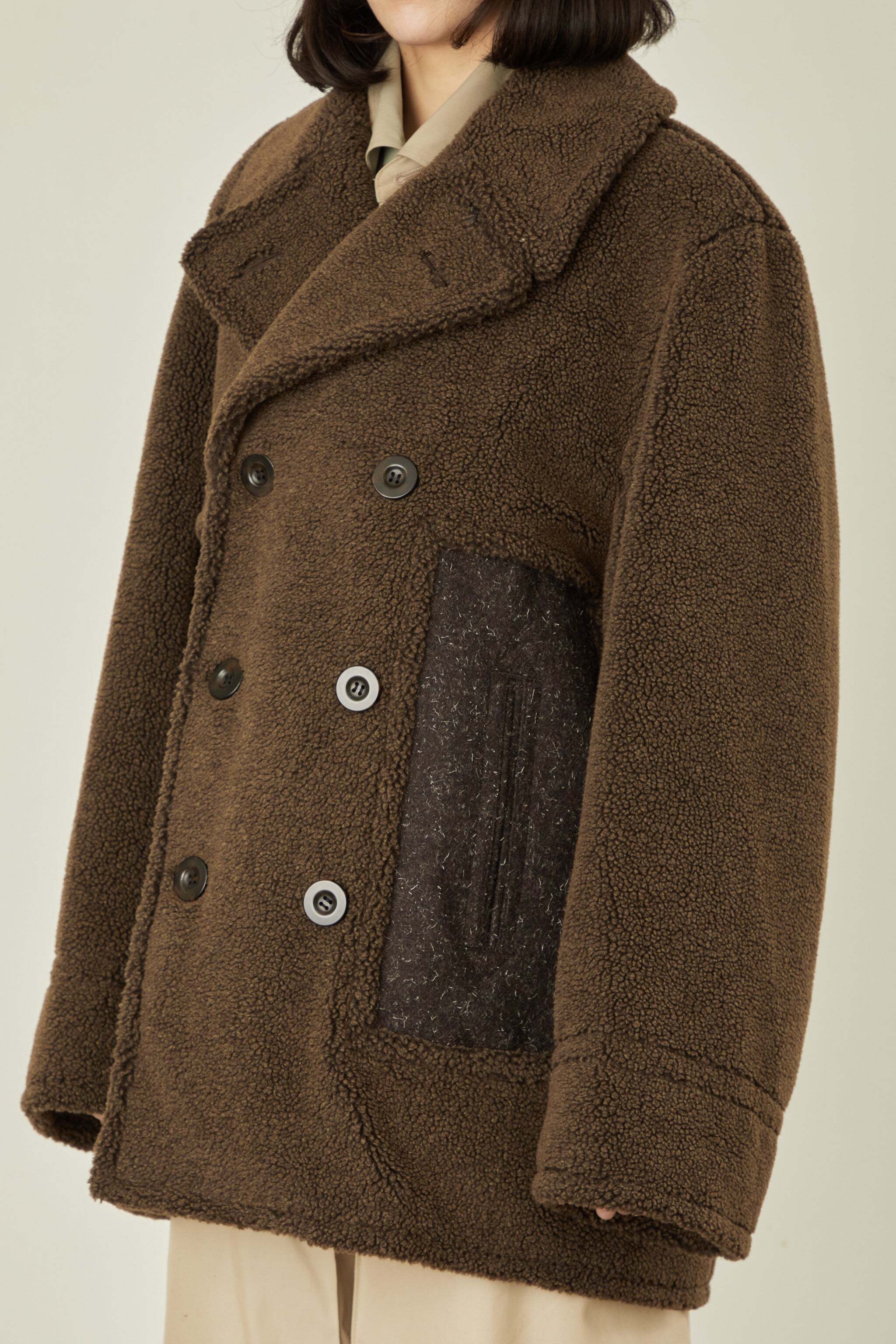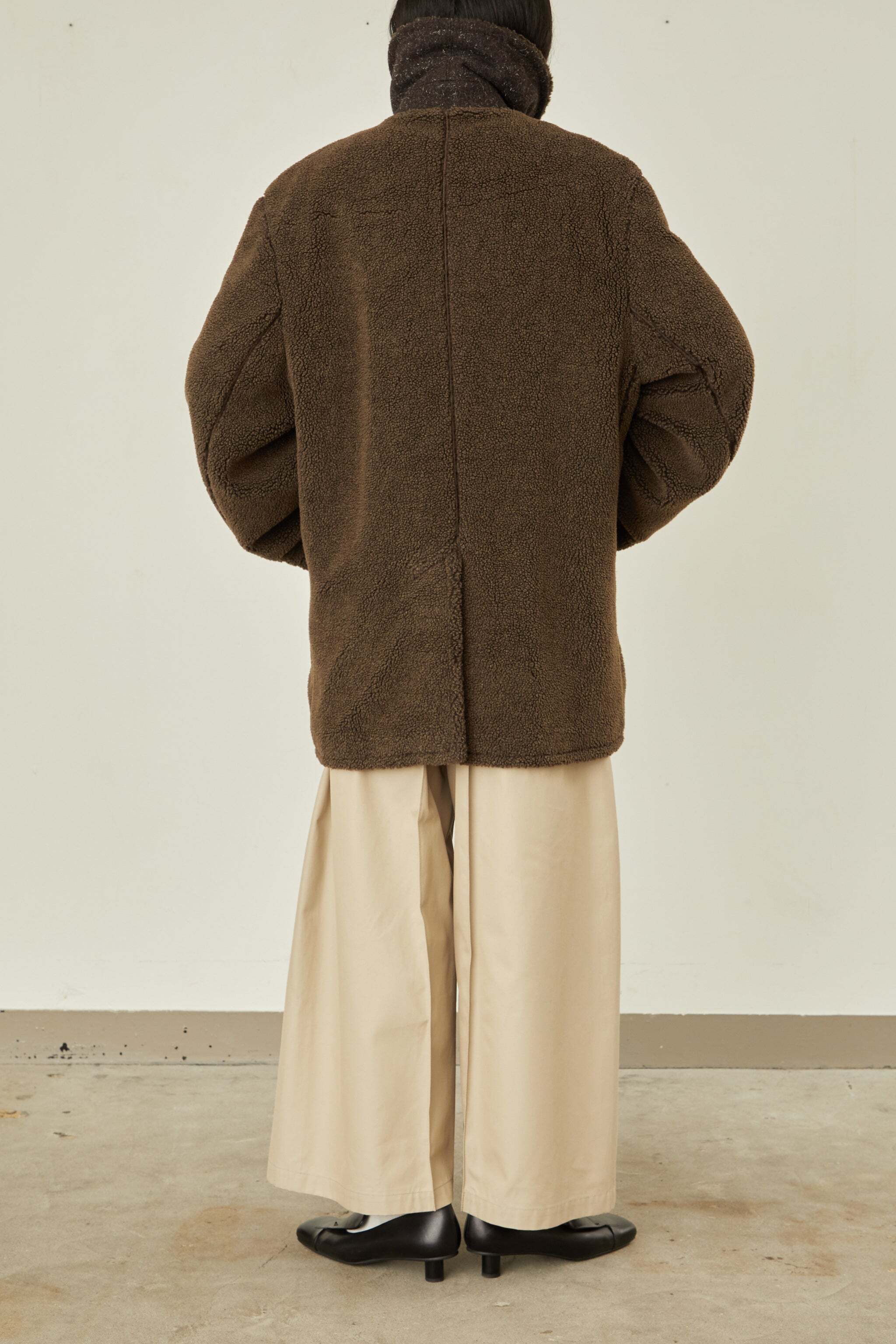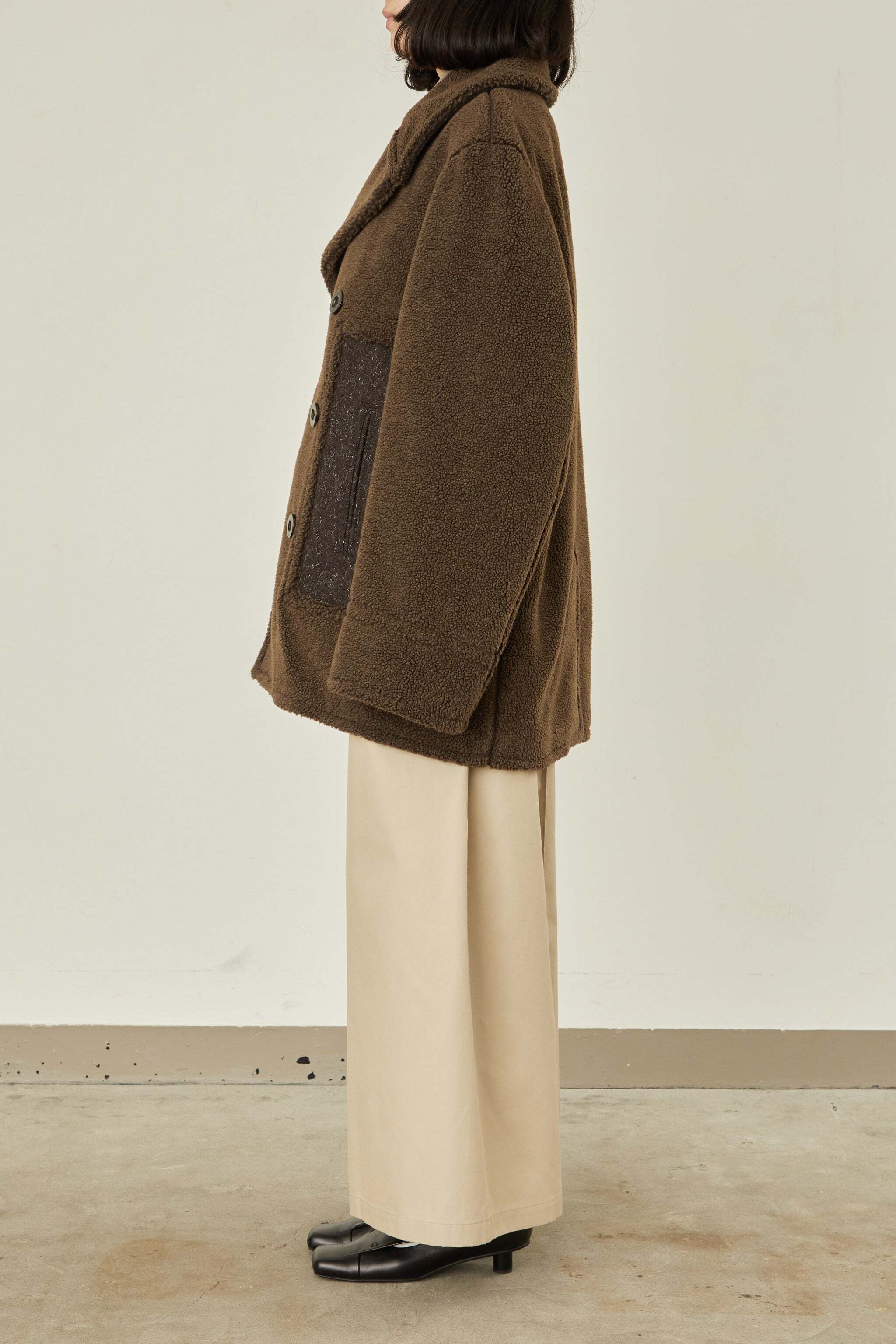 素材の厚みに頼らず、設計と仕立てでフォルムを立ち上げたボアPコートです。