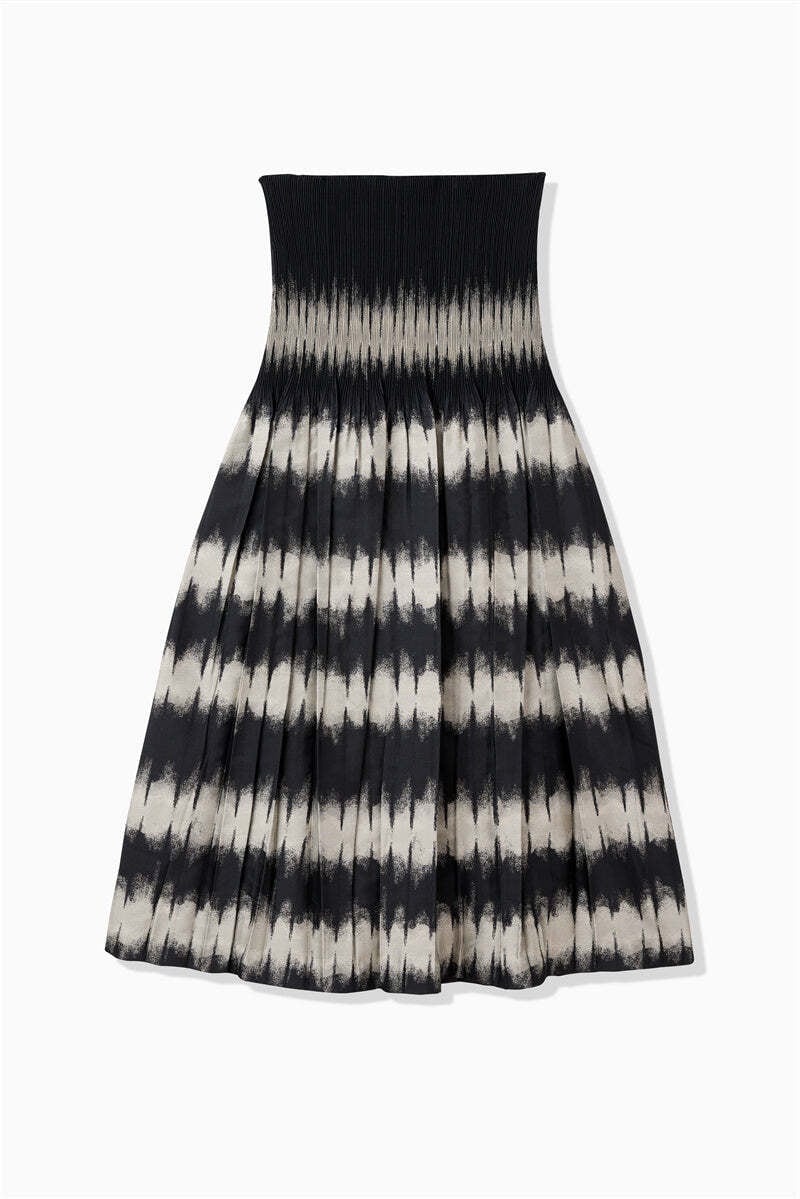 裾に向かって広がるボリュームと、ランダムに走るプリーツが生む陰影。