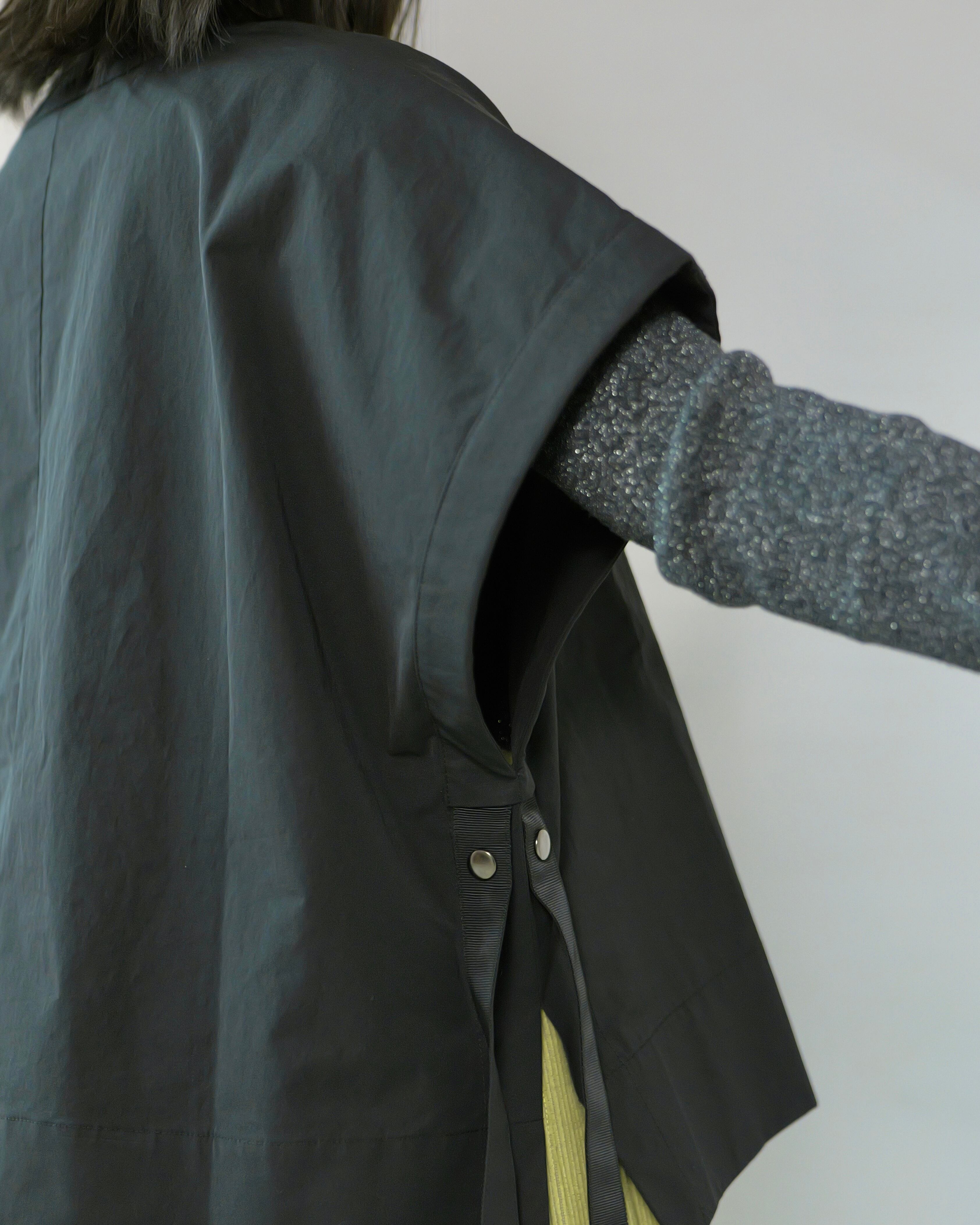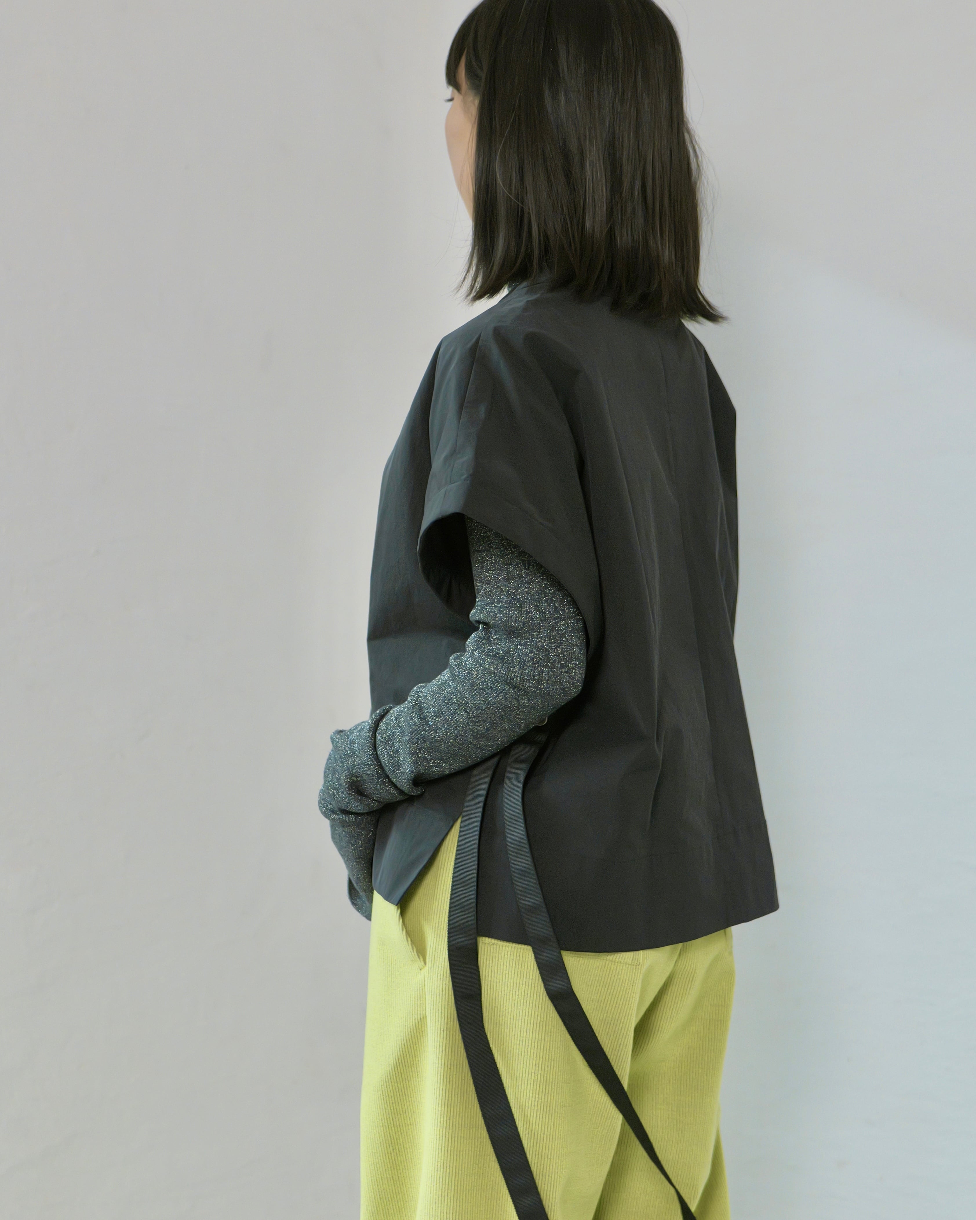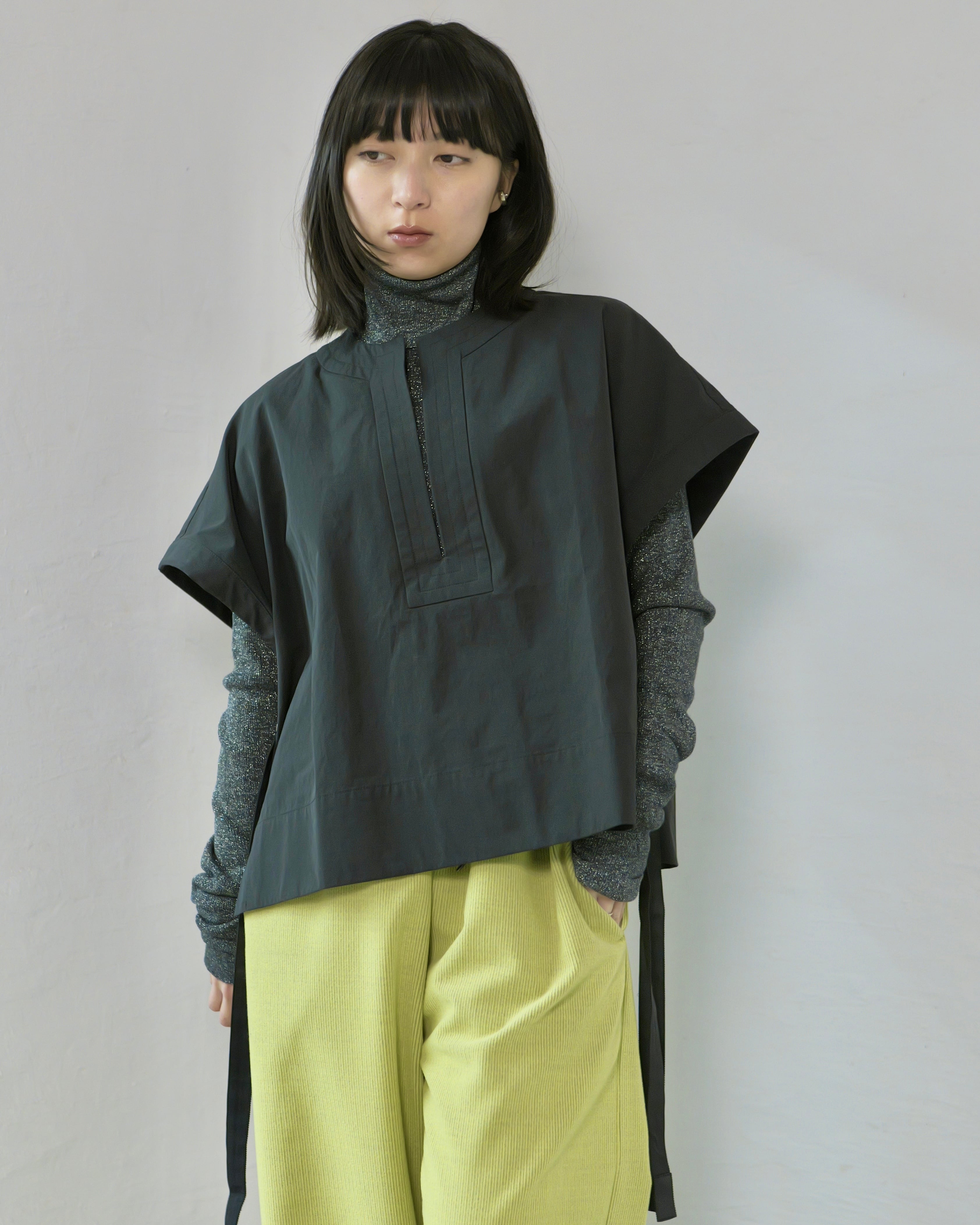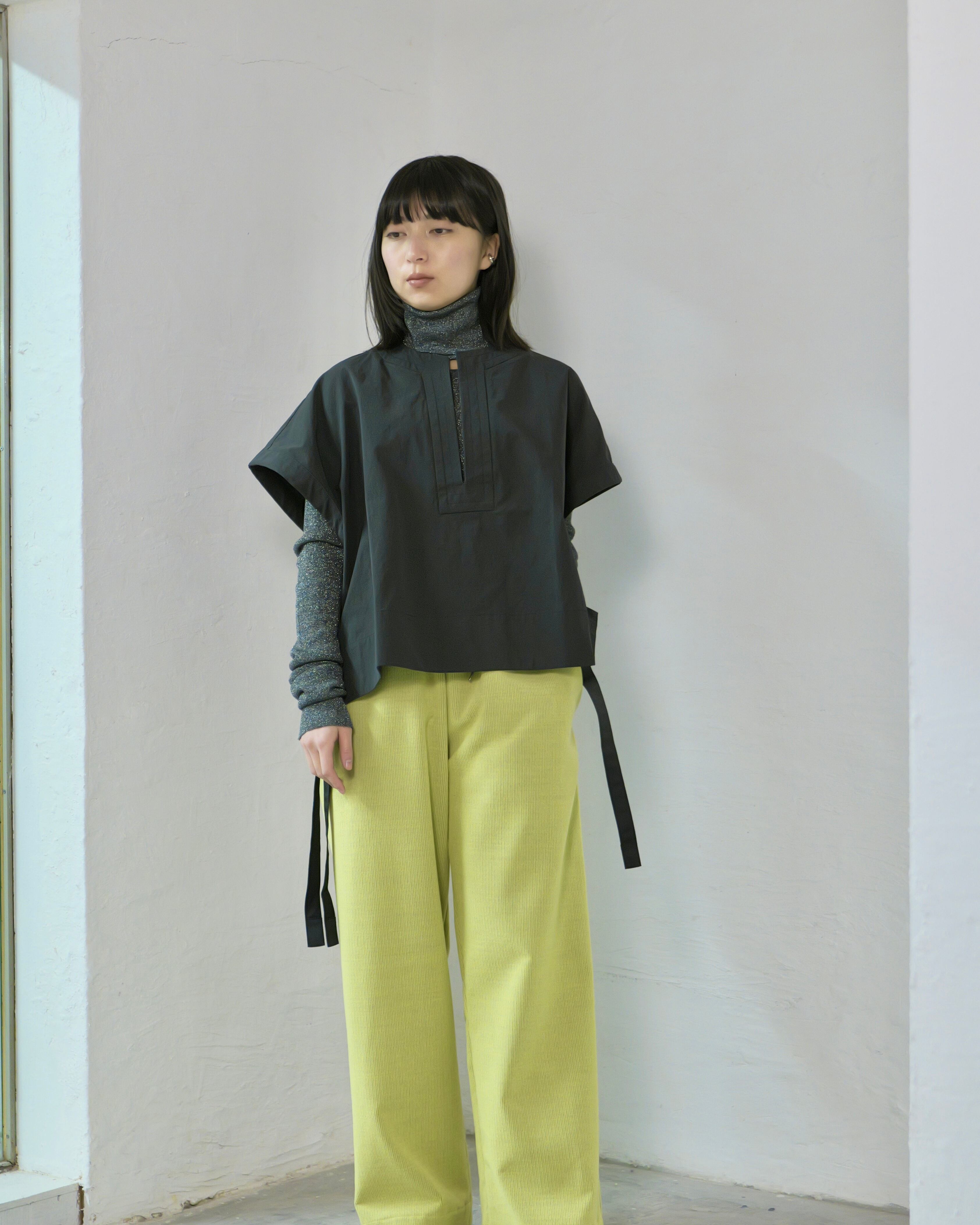 直線断ちのカフタンパターンをベースに、肩を落とした短丈のバランス。