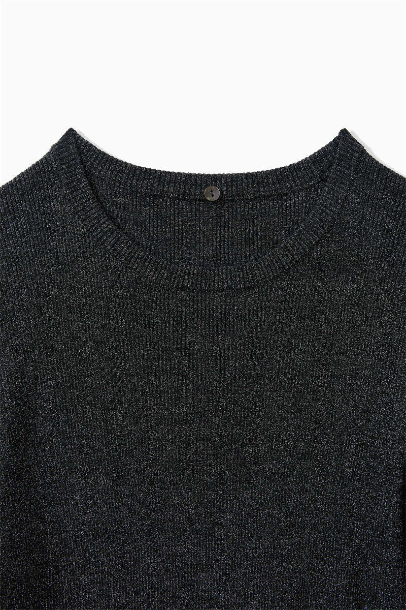 ほどよい透け感と繊細なラメ。上品な光が“面”ではなくニュアンスで立ち上がるリブニットです。