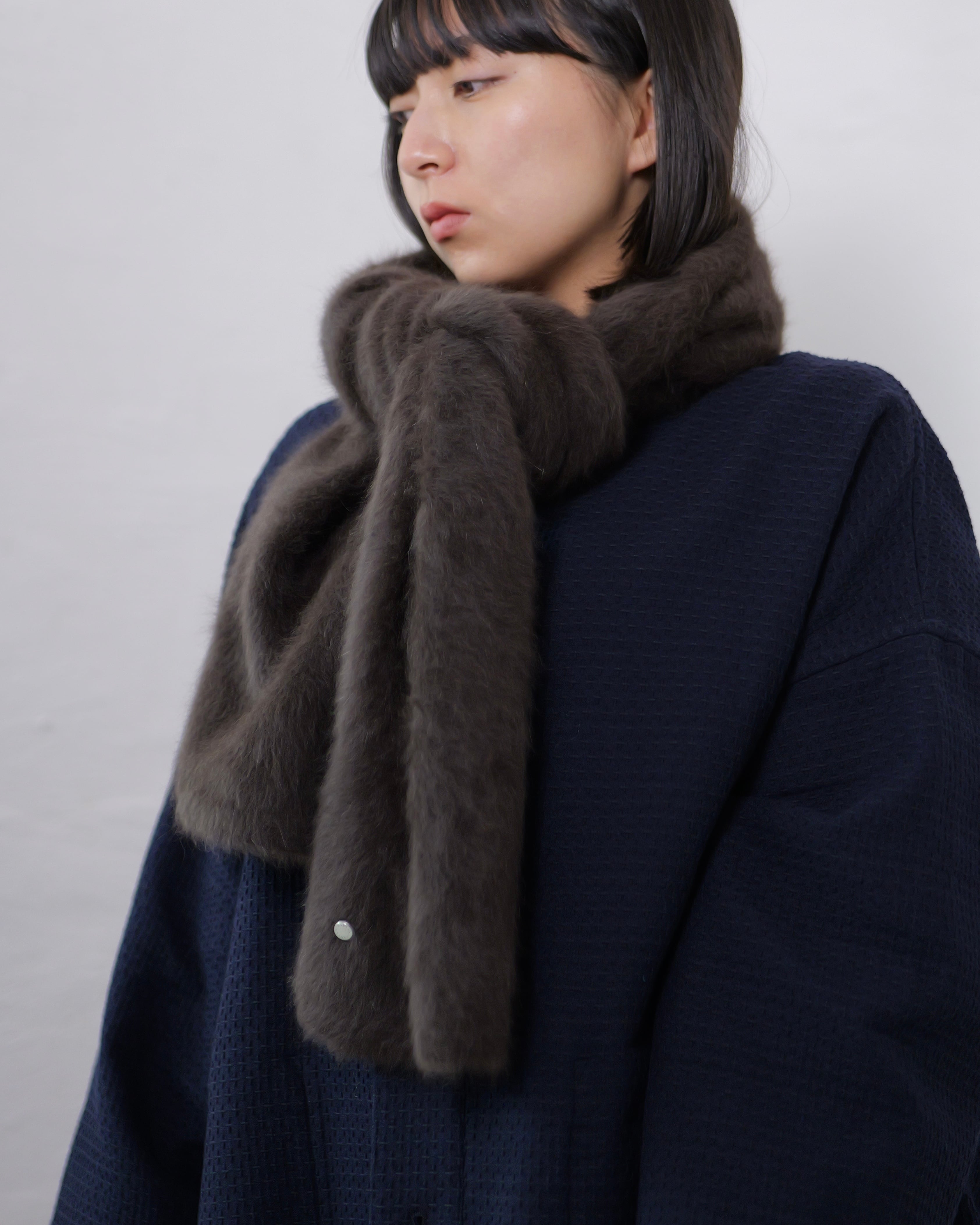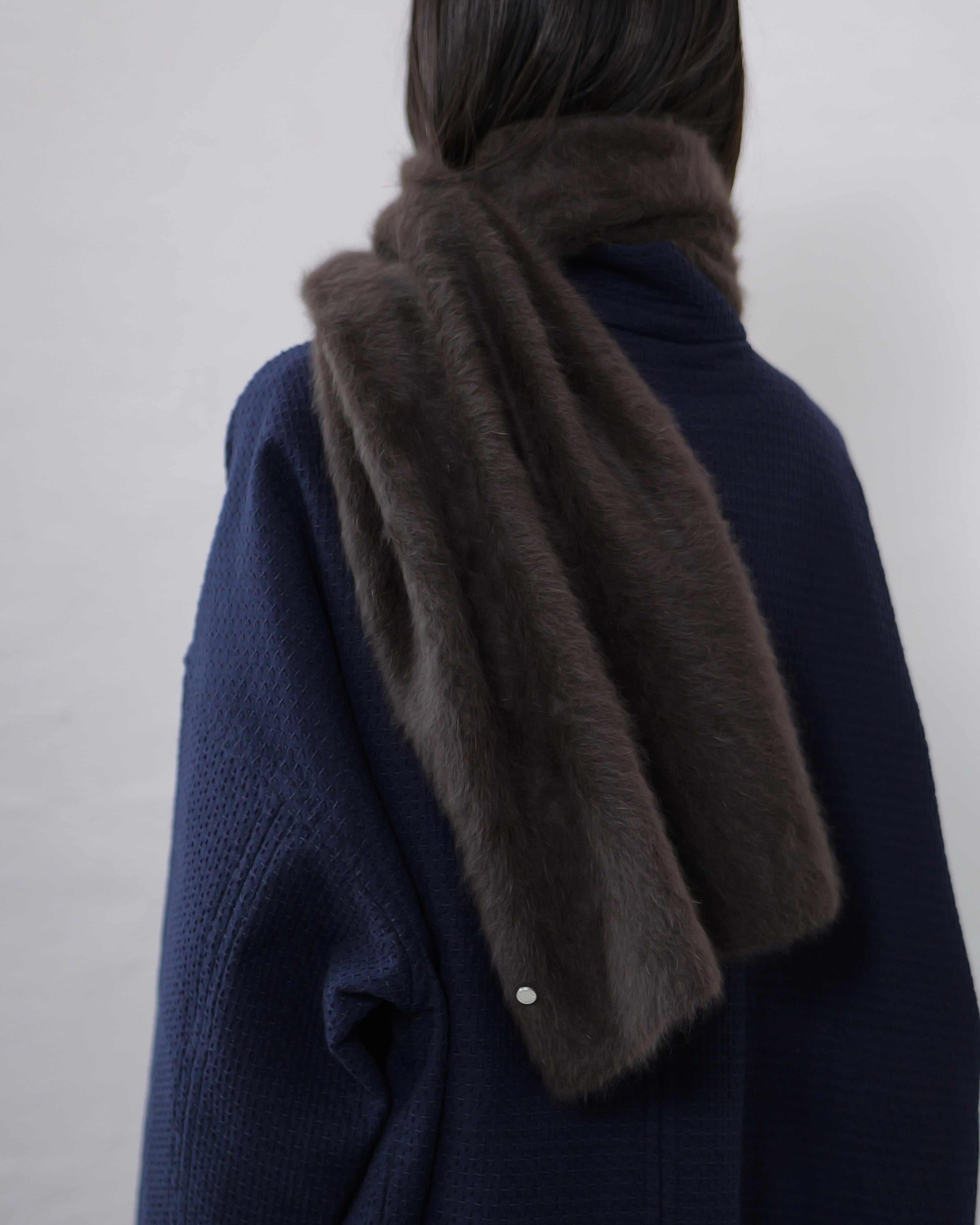 固定位置のシルバーのピンブローチがアクセントのマフラー。