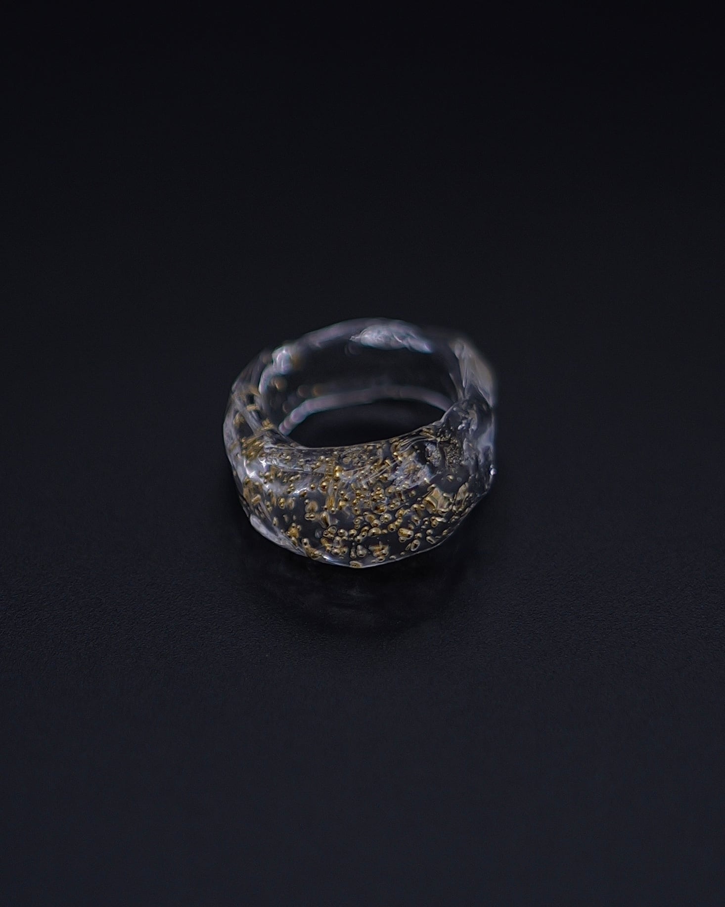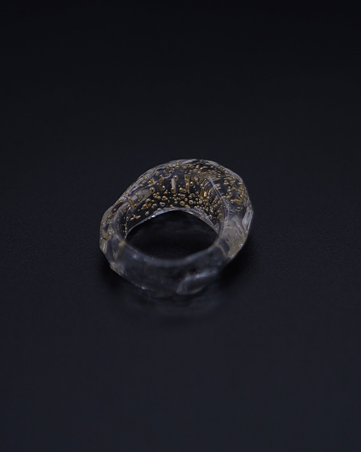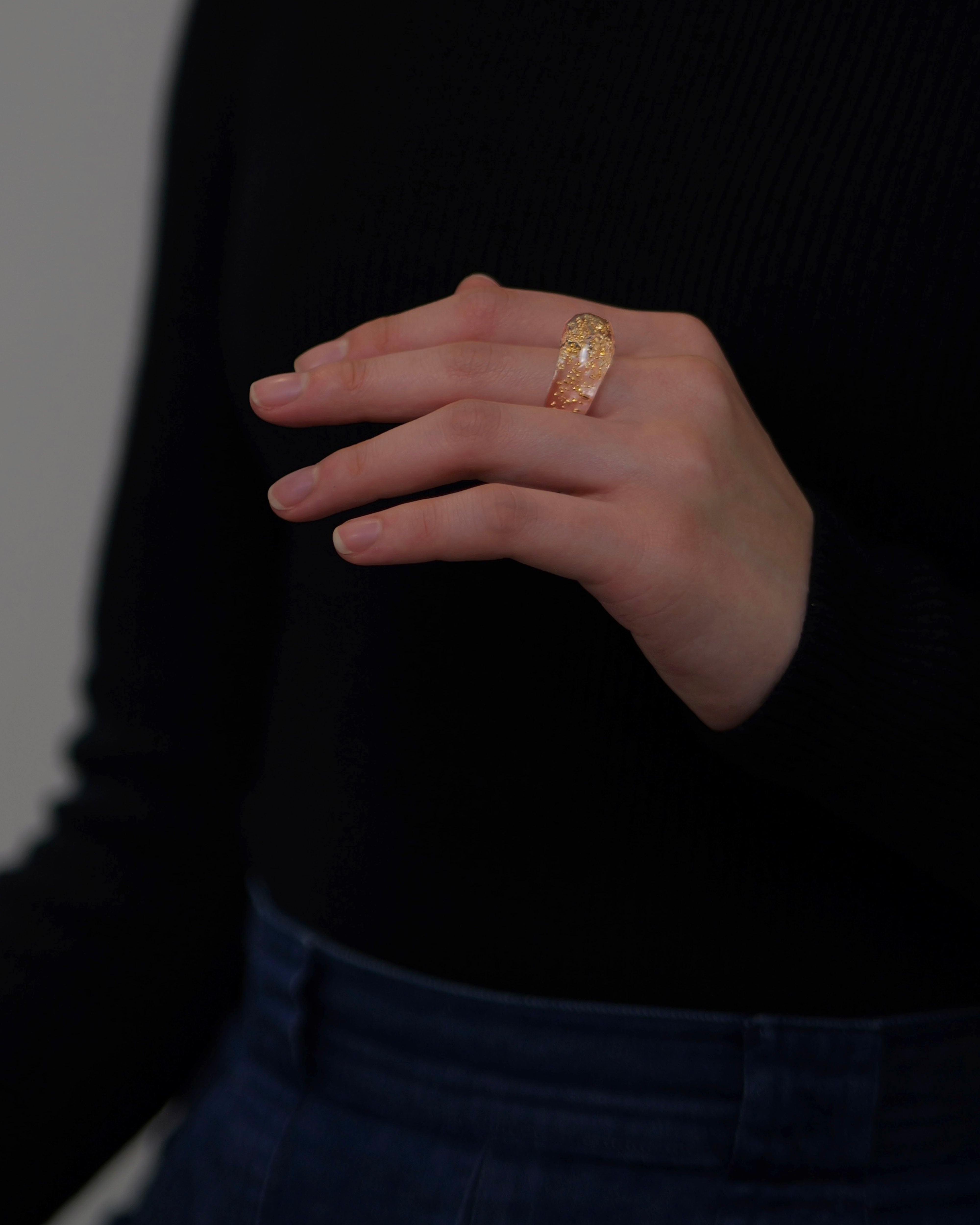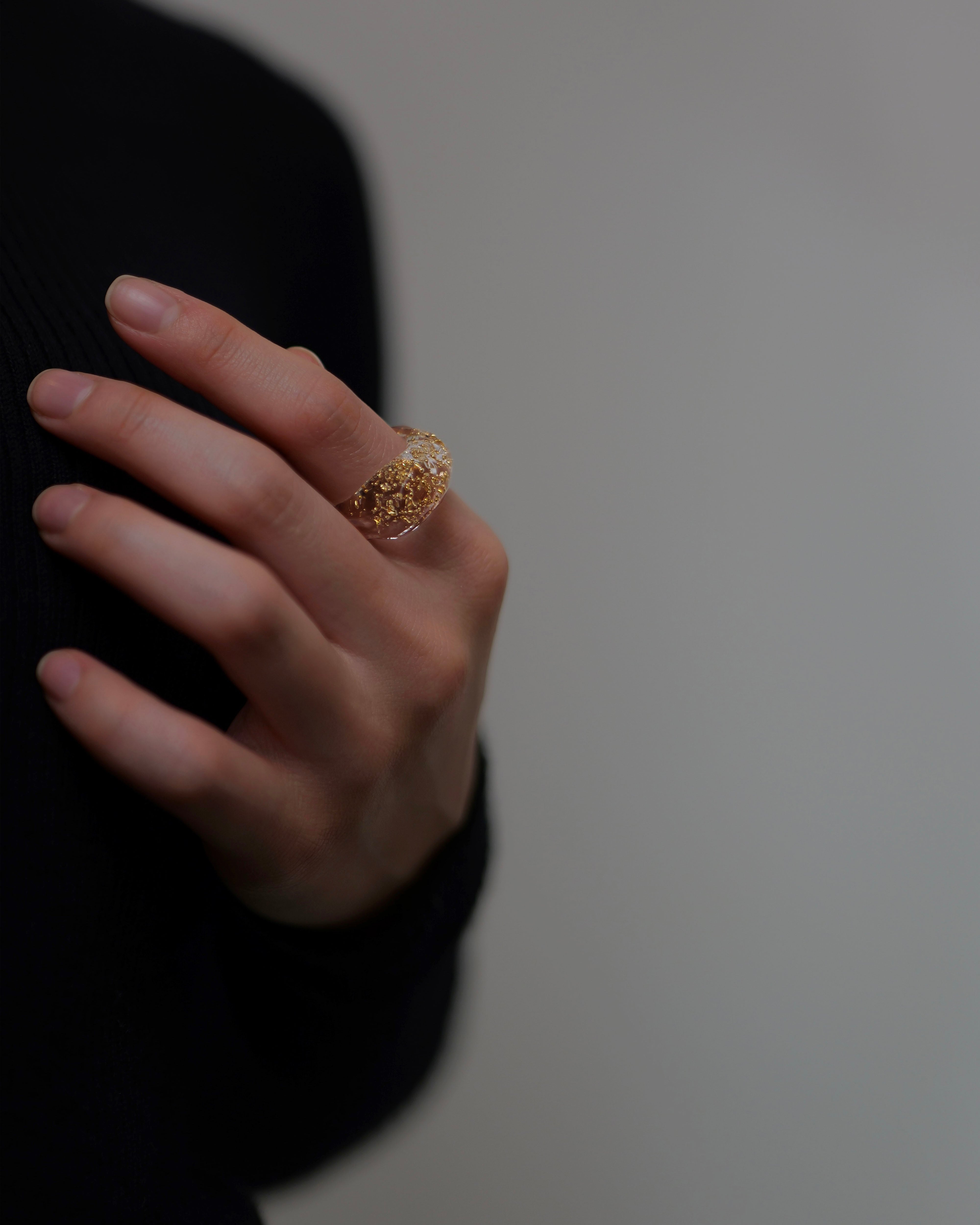 高品質な光学ガラスの中に、24金の小さな丸い粒を閉じ込めた特別なリングです。