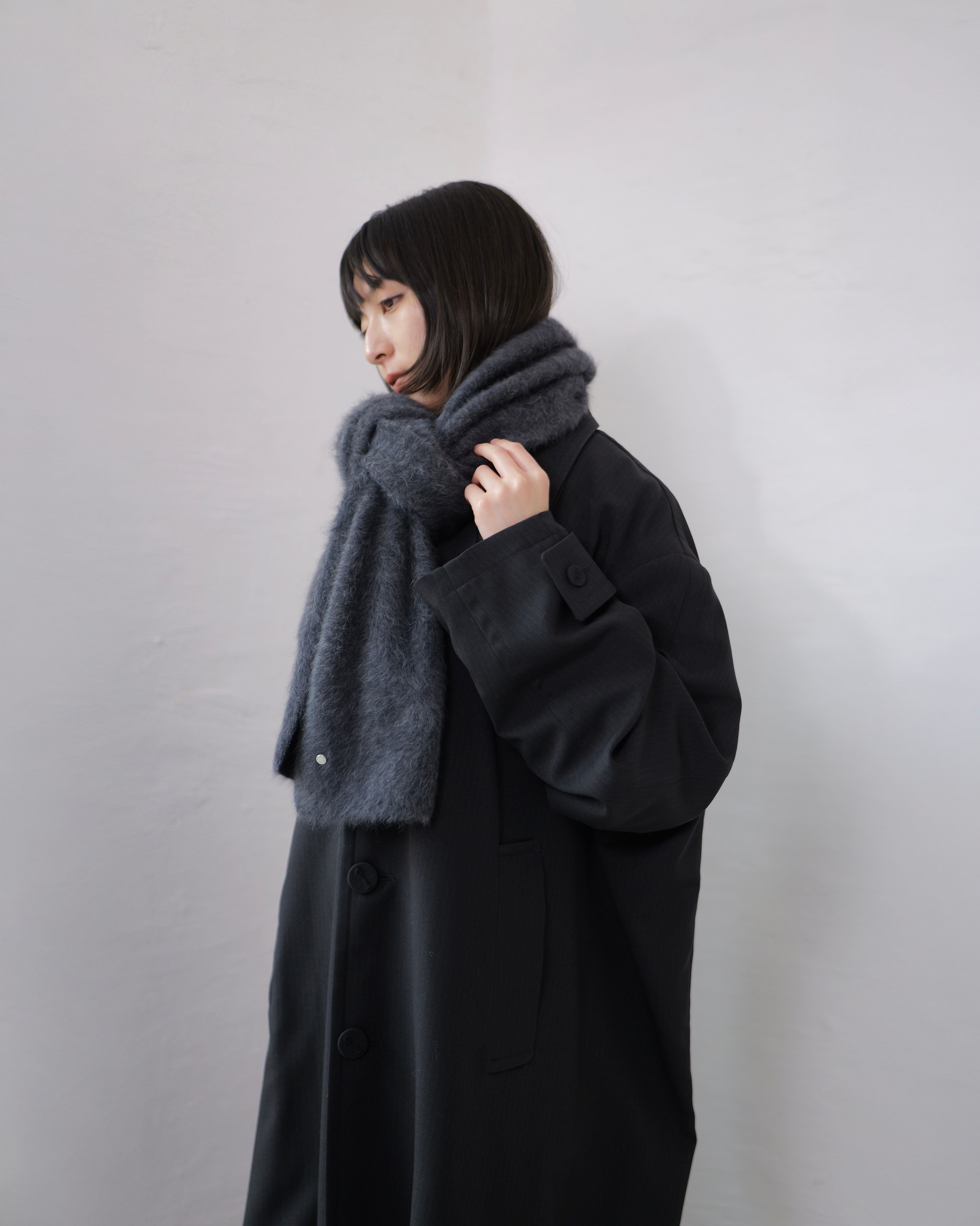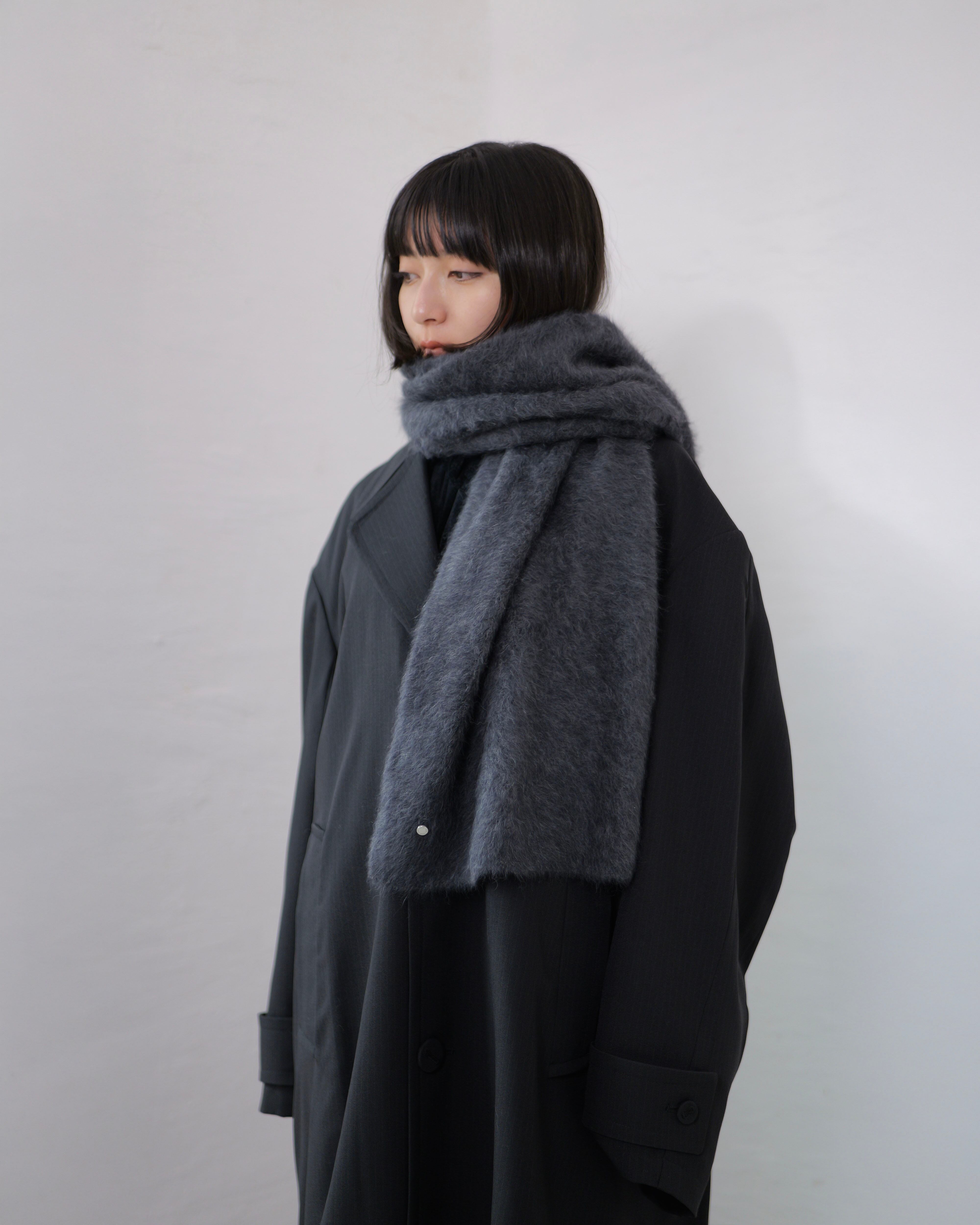 固定位置のシルバーのピンブローチがアクセントのマフラー。