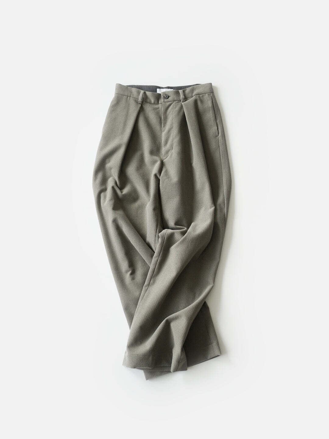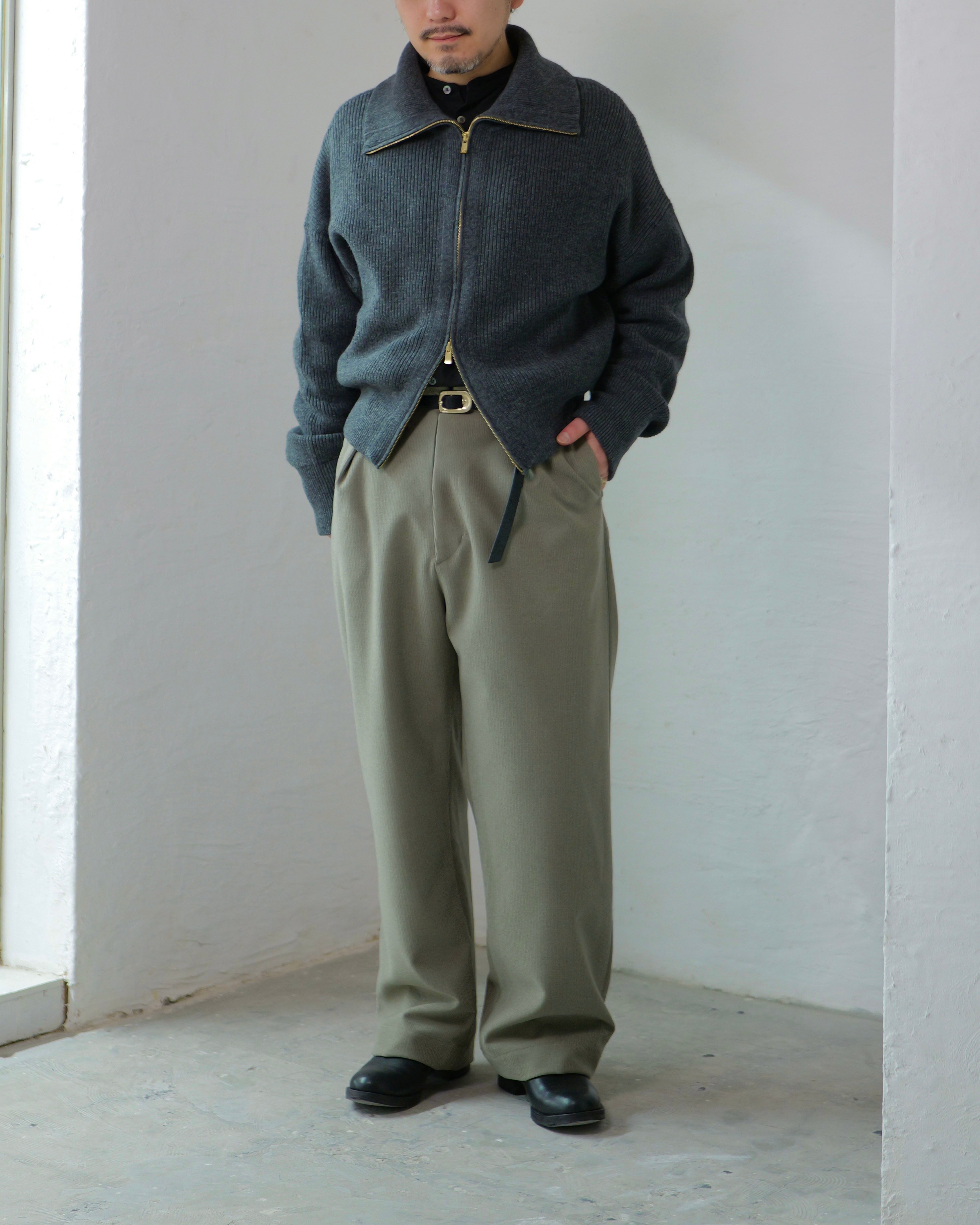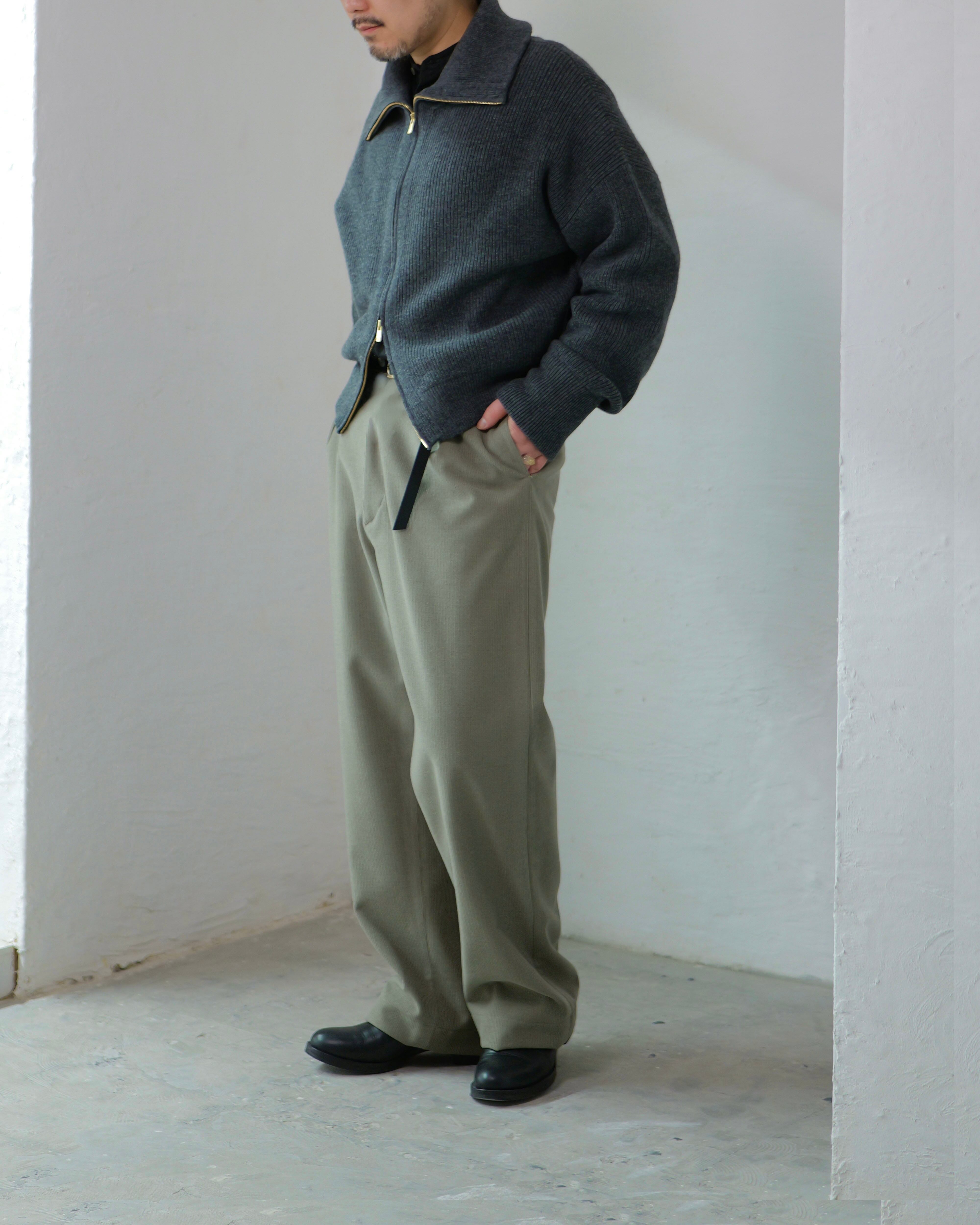 少しワイドなストレートに、深めのタックで“縦に落ちる”線をつくり、センタークリースのような印象を狙っています。
