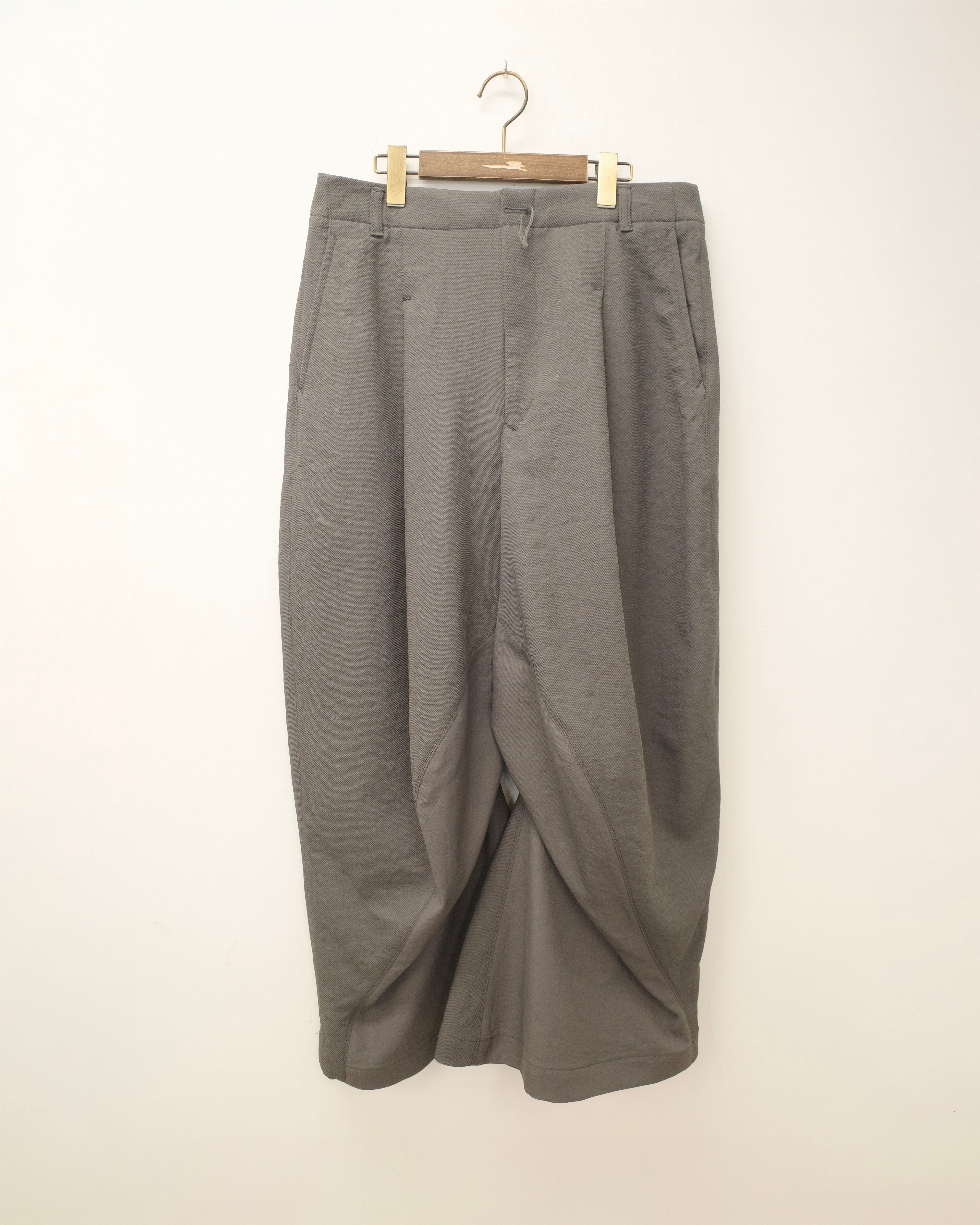 Rather than simply twisting flat fabric, the pattern is composed to create space around the legs—so the silhouette changes subtly when you stand, walk, and sit.
