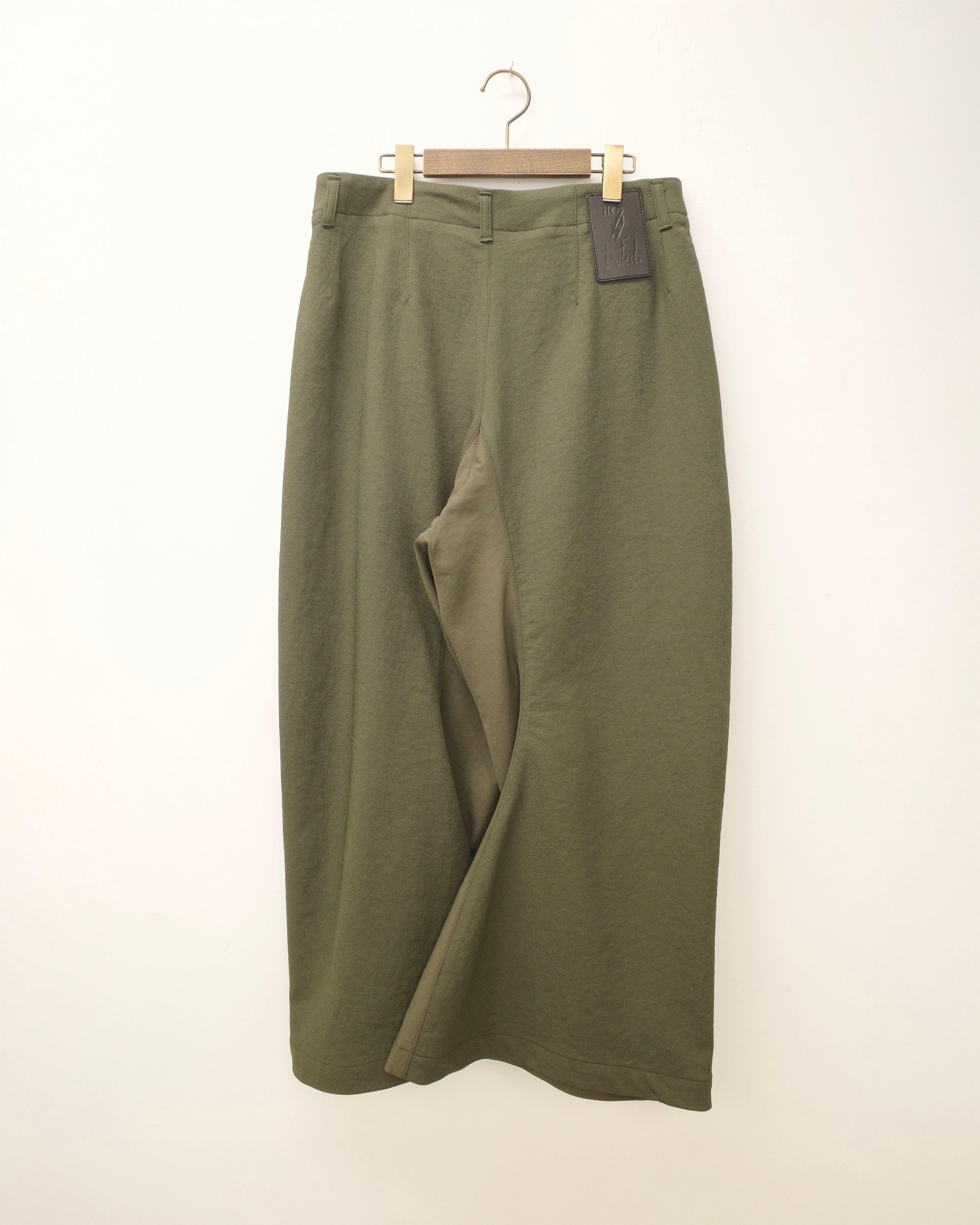 このパンツは、見た目の“ねじれ”そのものがデザインですが、
