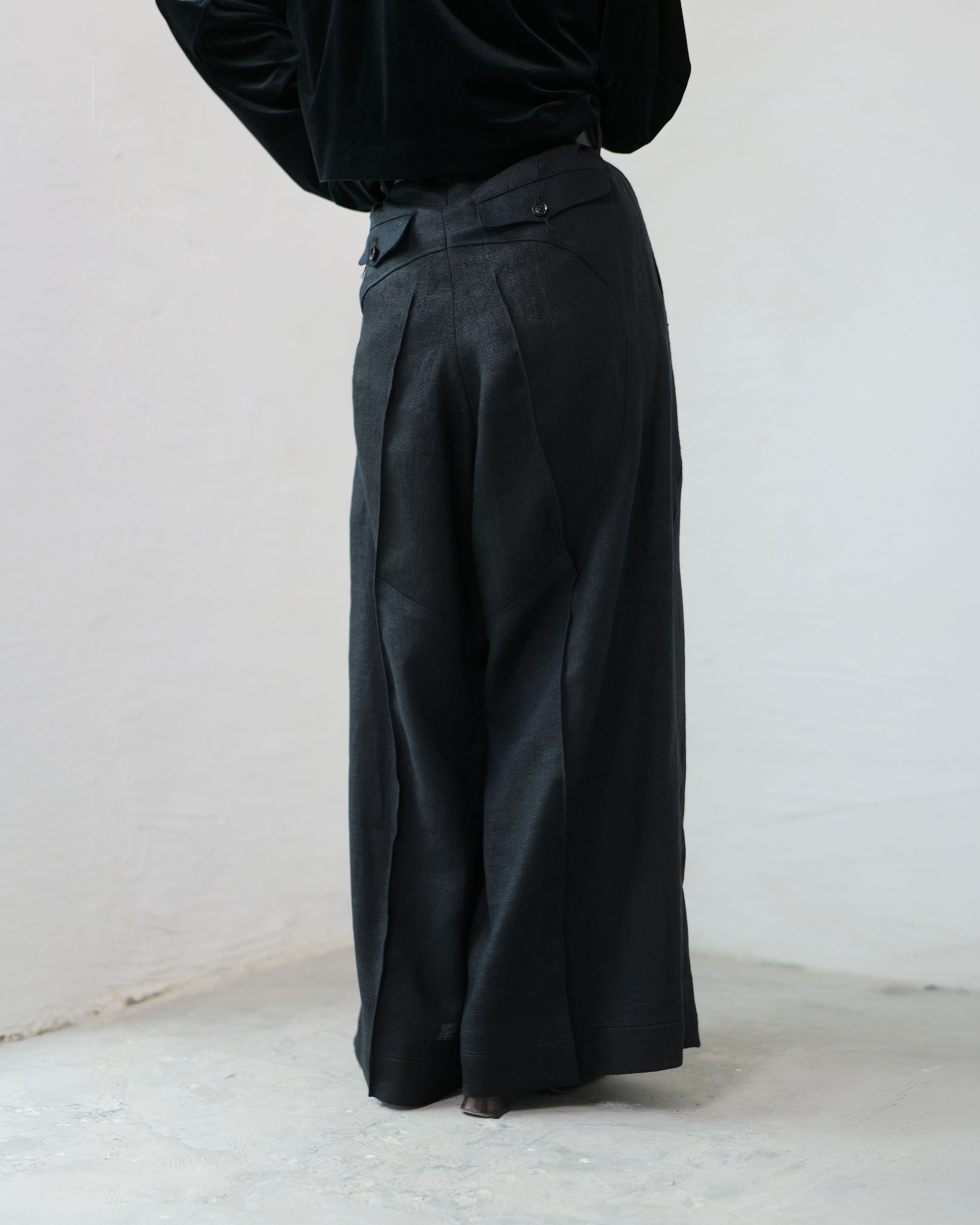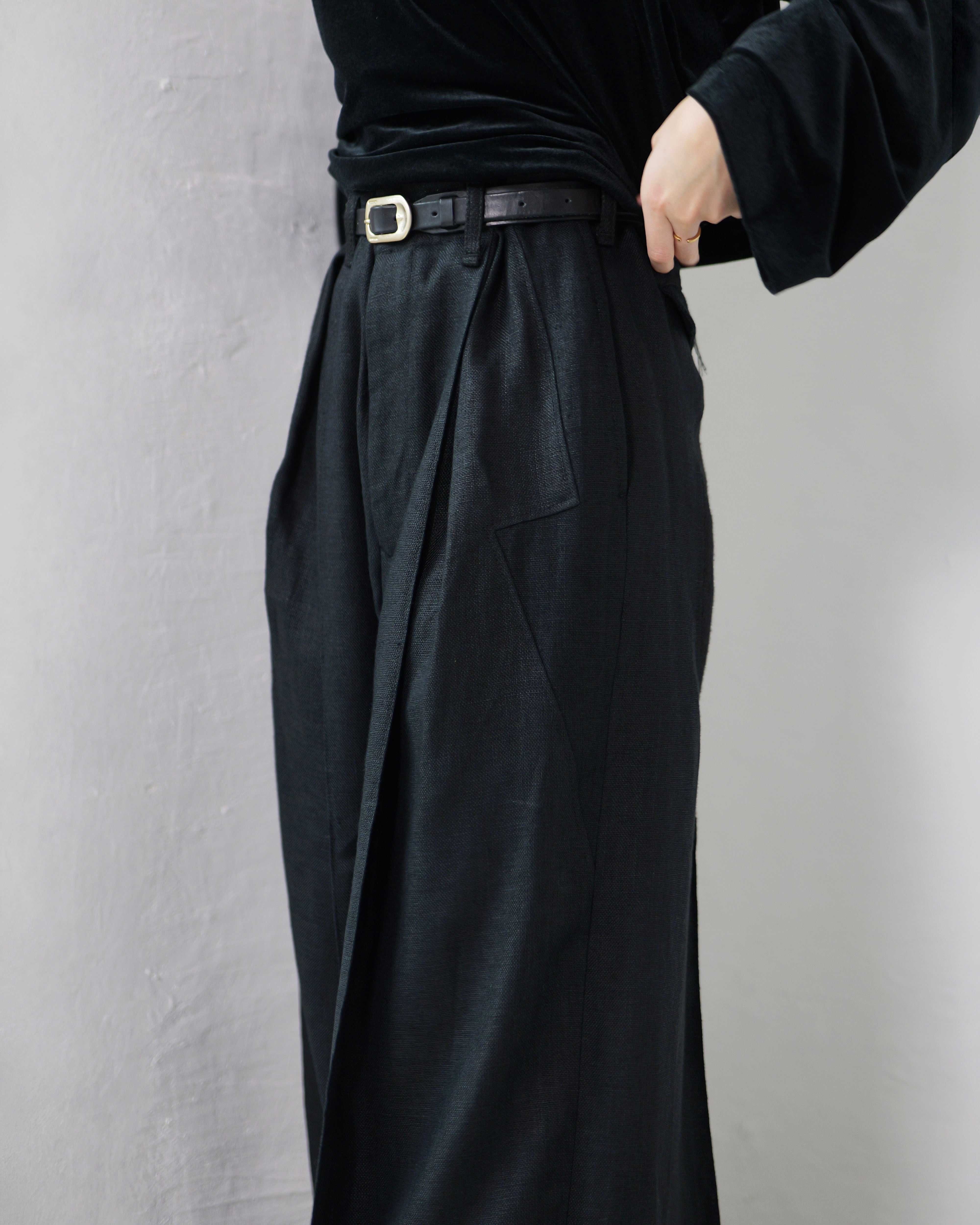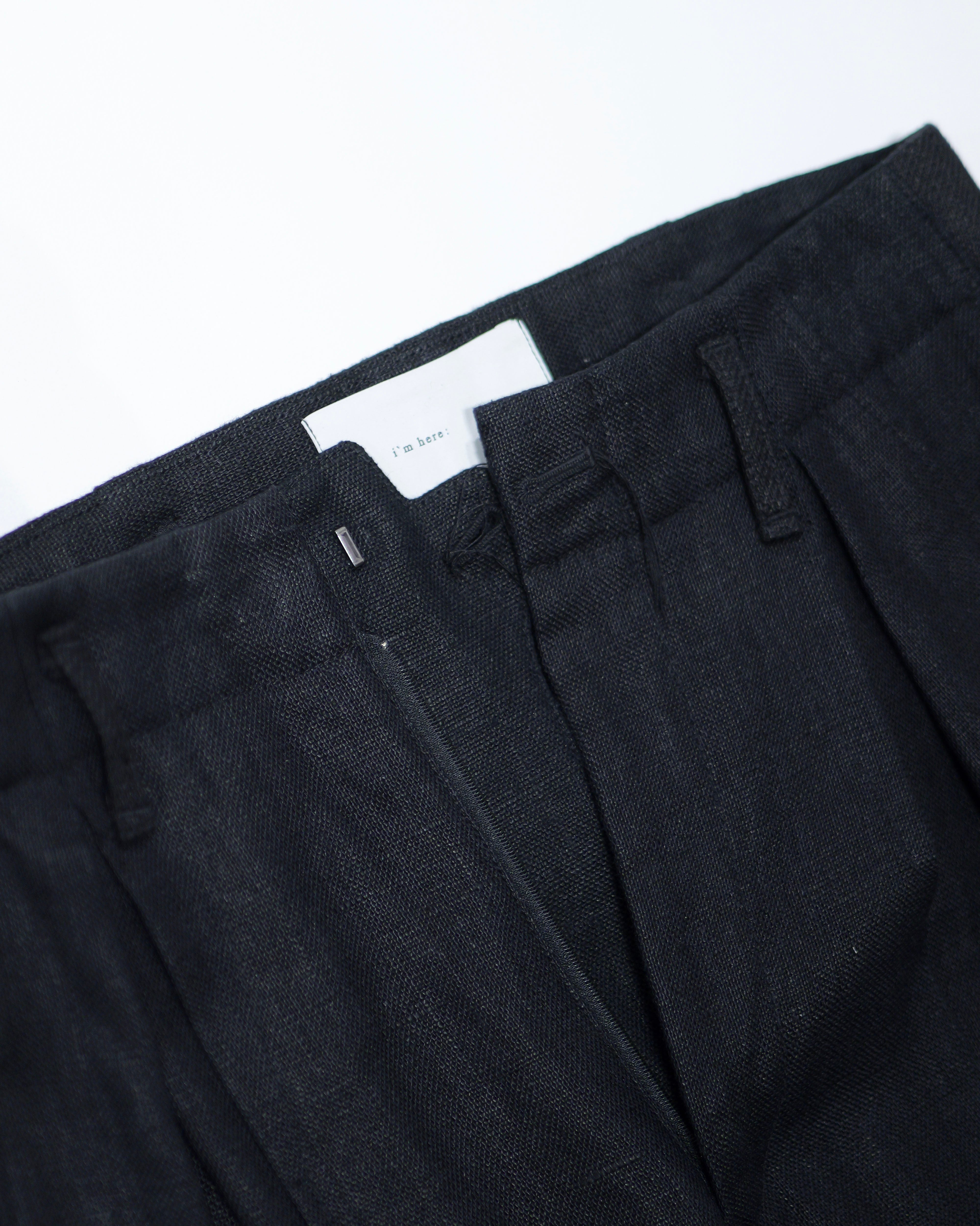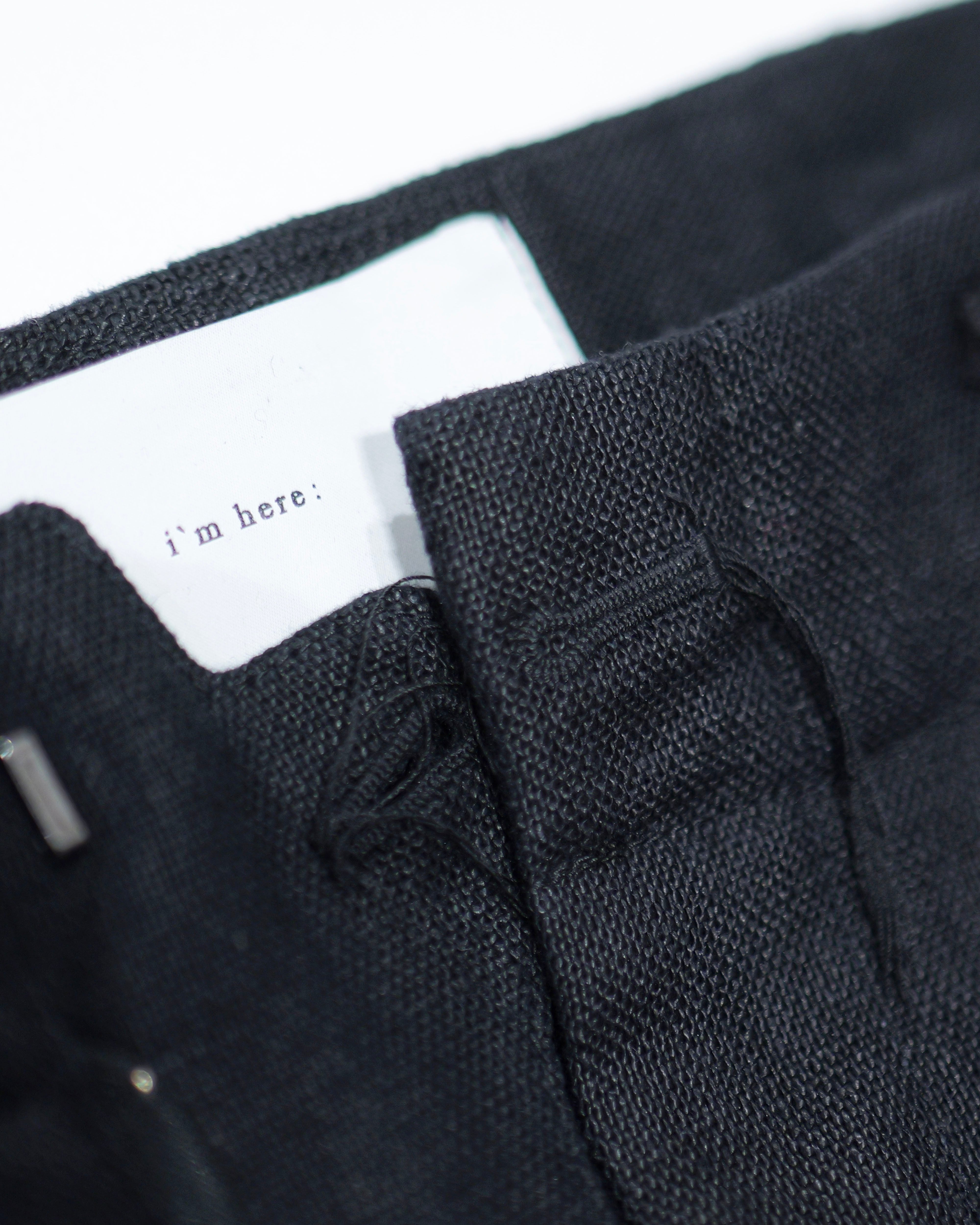 i’m here - Linen Wide Pants :Black|3種リネン切替/ワイド/“だまし絵”前立て