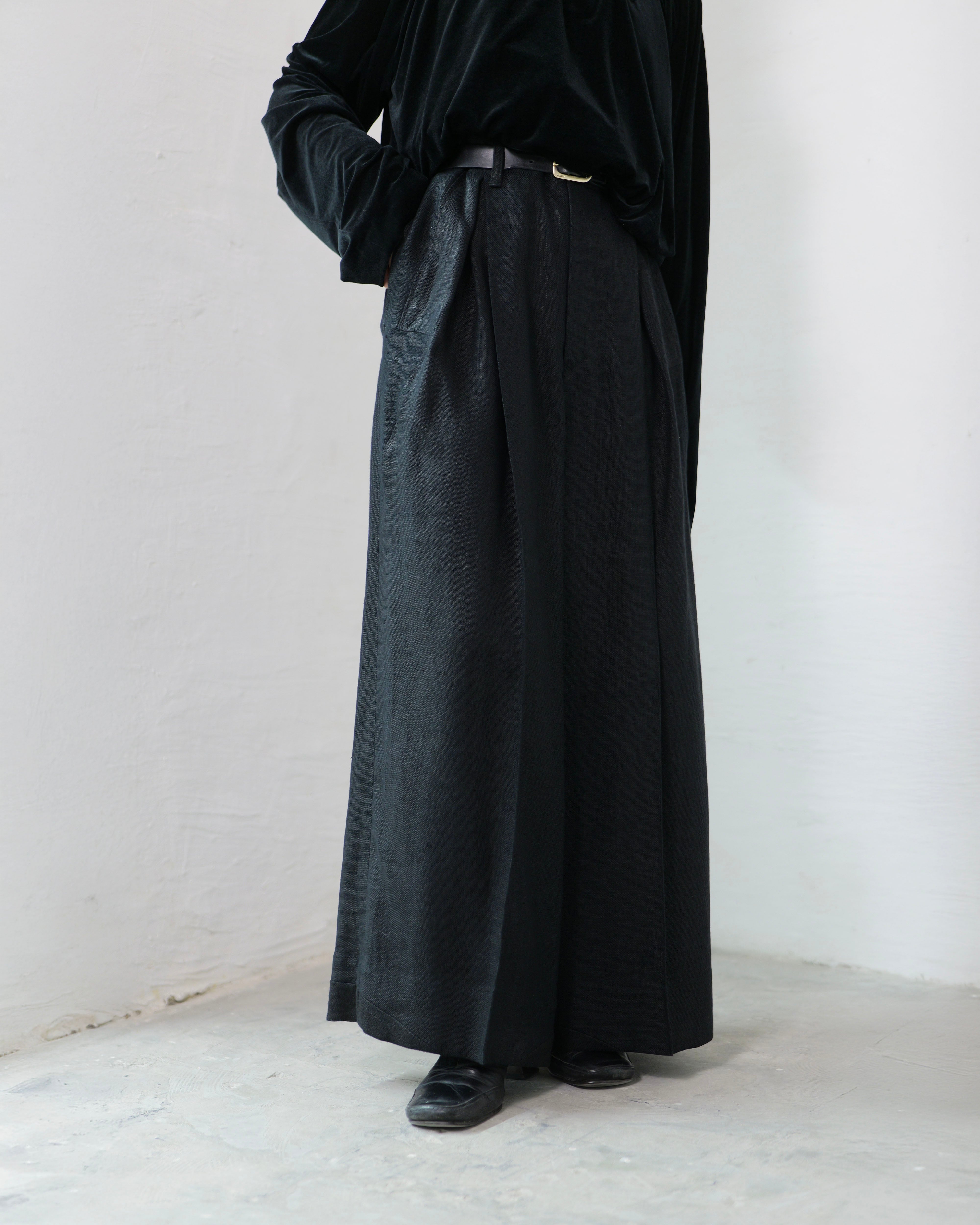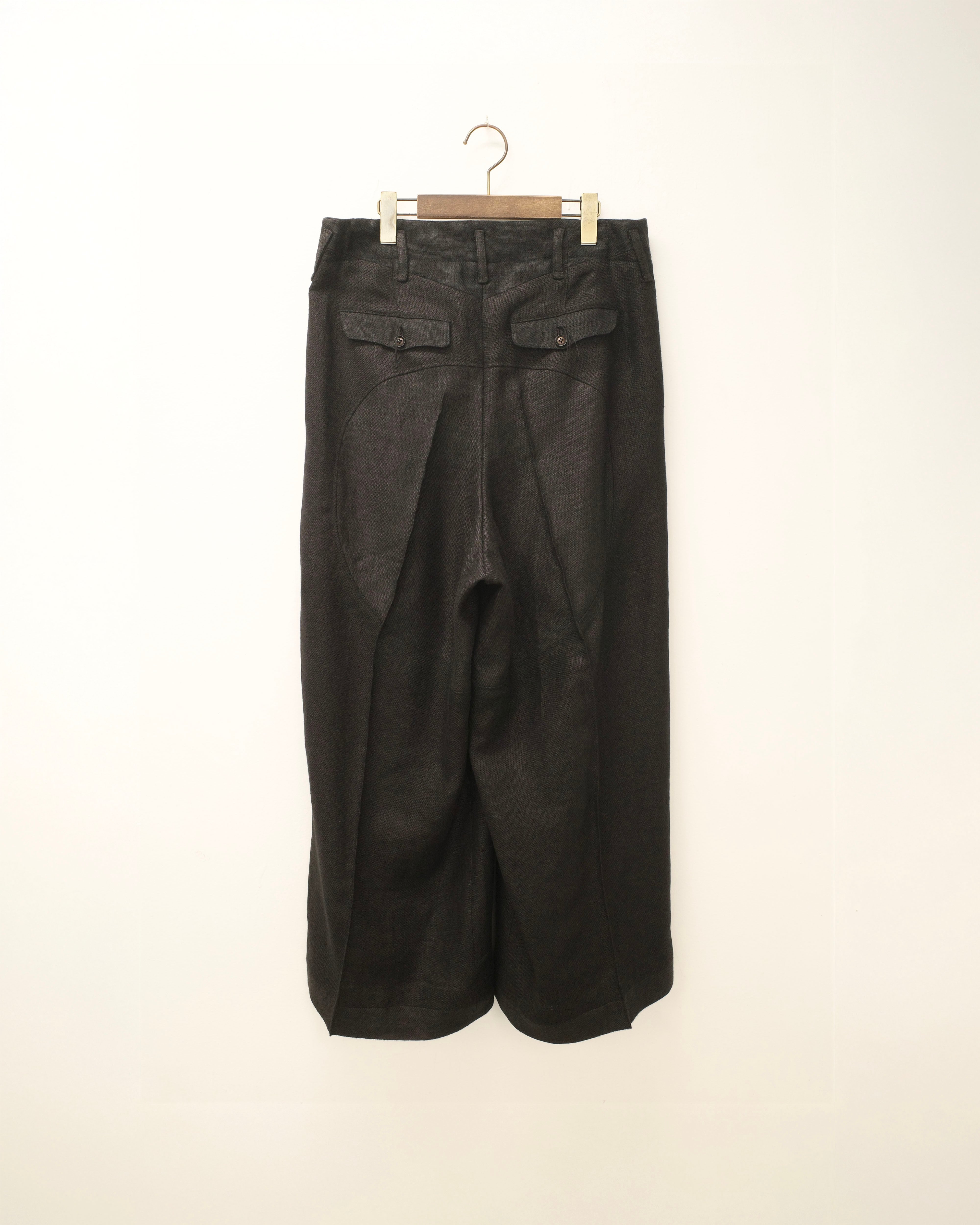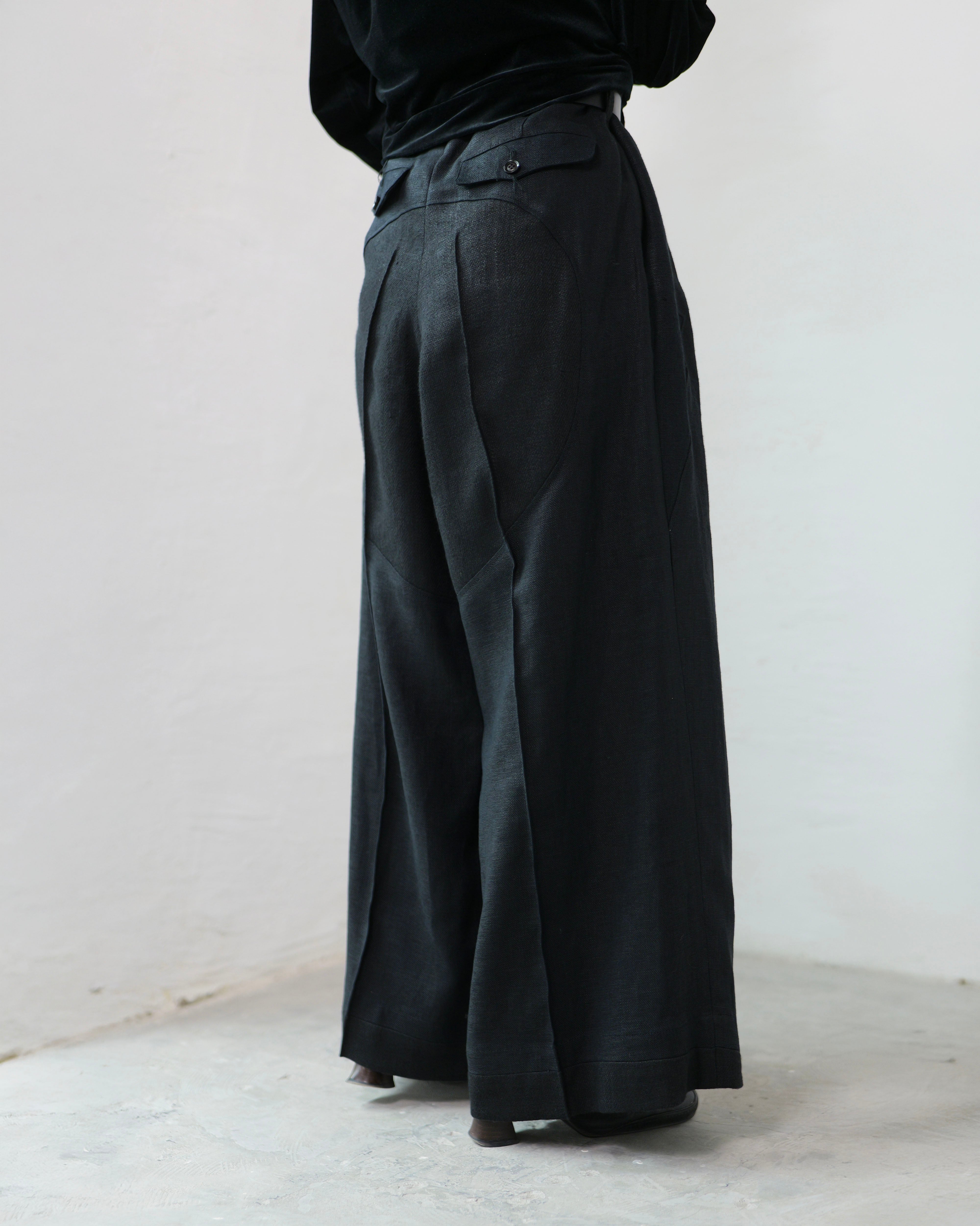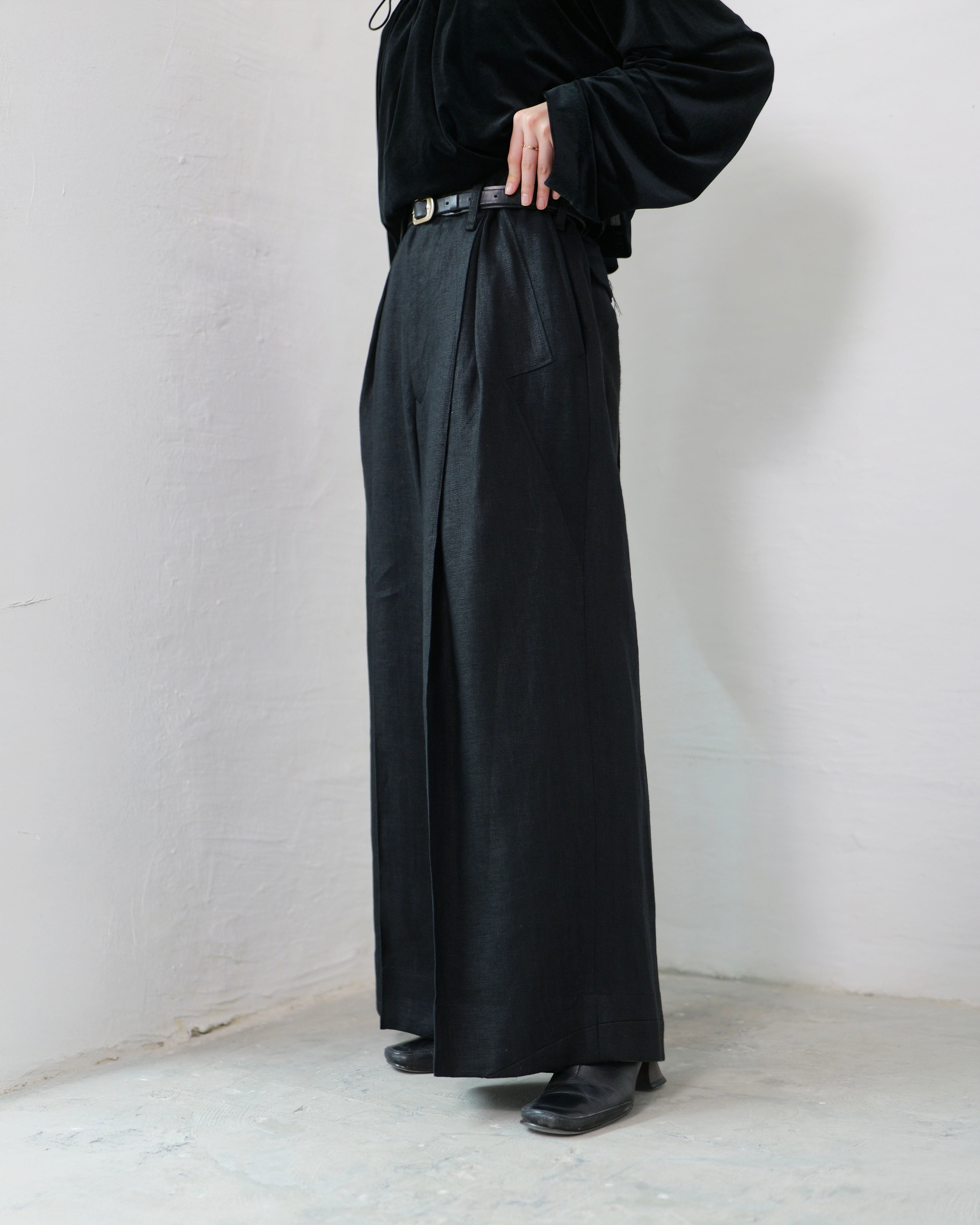 i’m here - Linen Wide Pants :Black|3種リネン切替/ワイド/“だまし絵”前立て