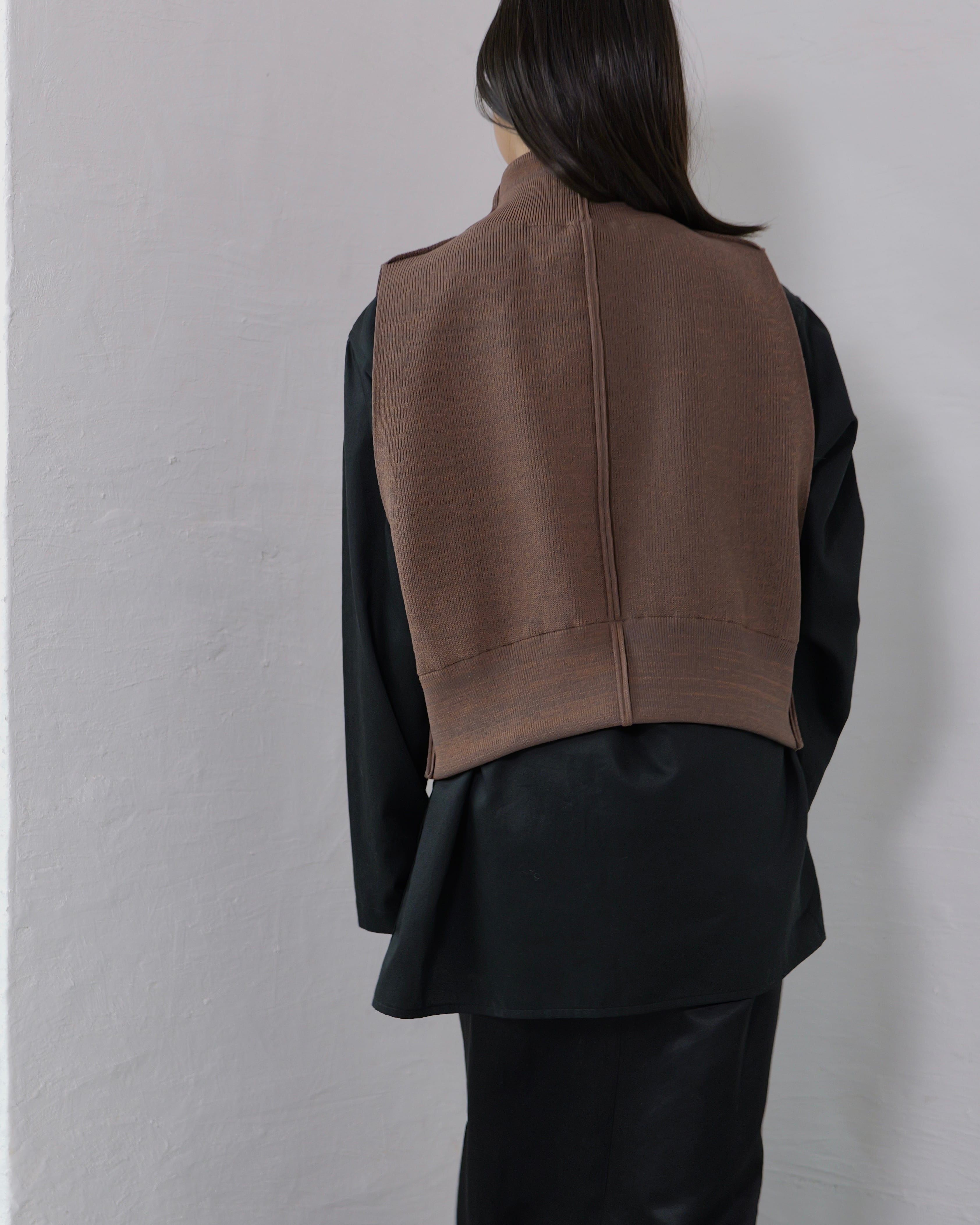 前後でアシンメトリーな輪郭になることで、ベストの“中間着”を、ひとつ先へ進めています。