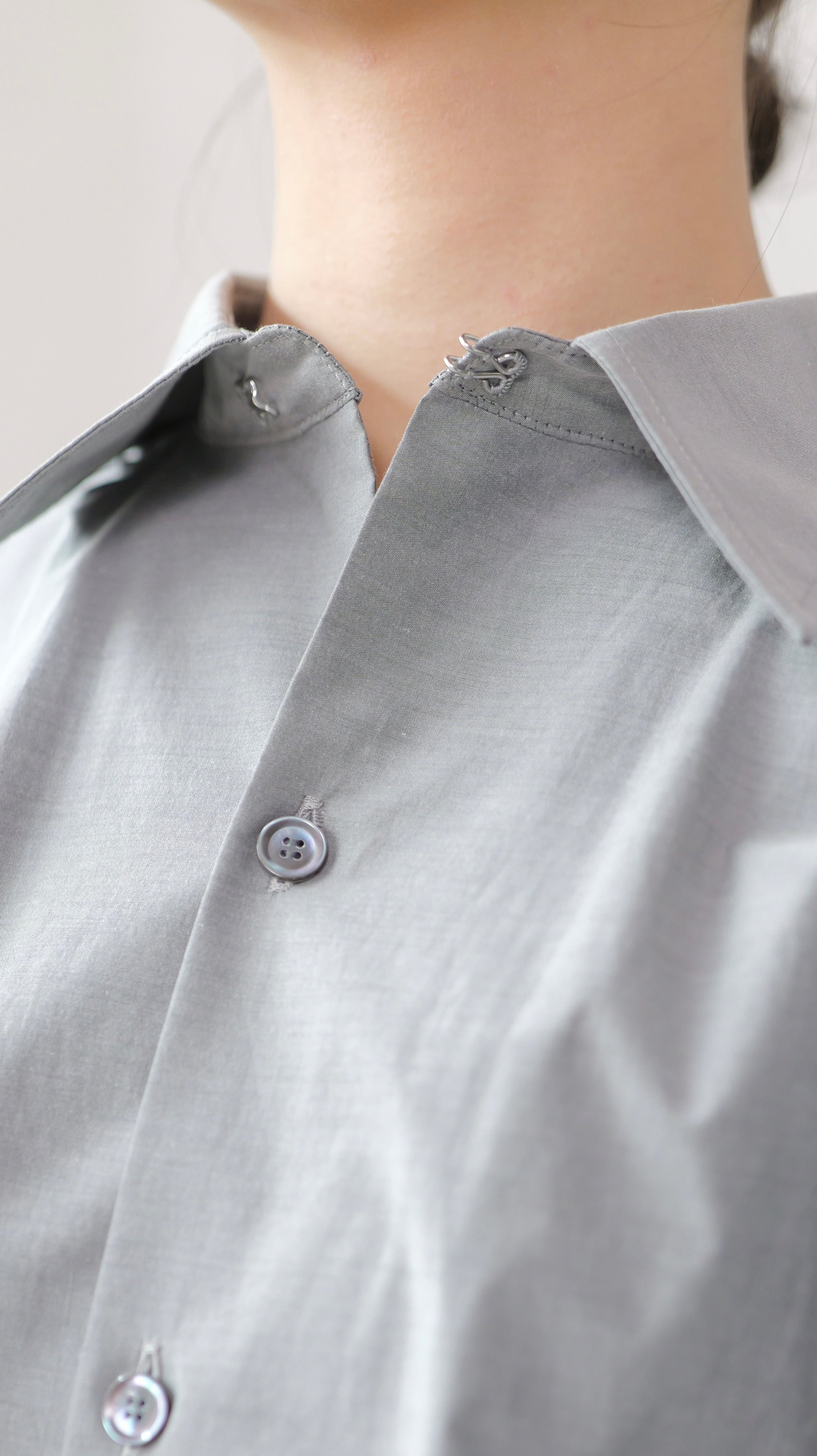 ・第一ボタンはホック仕様で、顔まわりをミニマルに