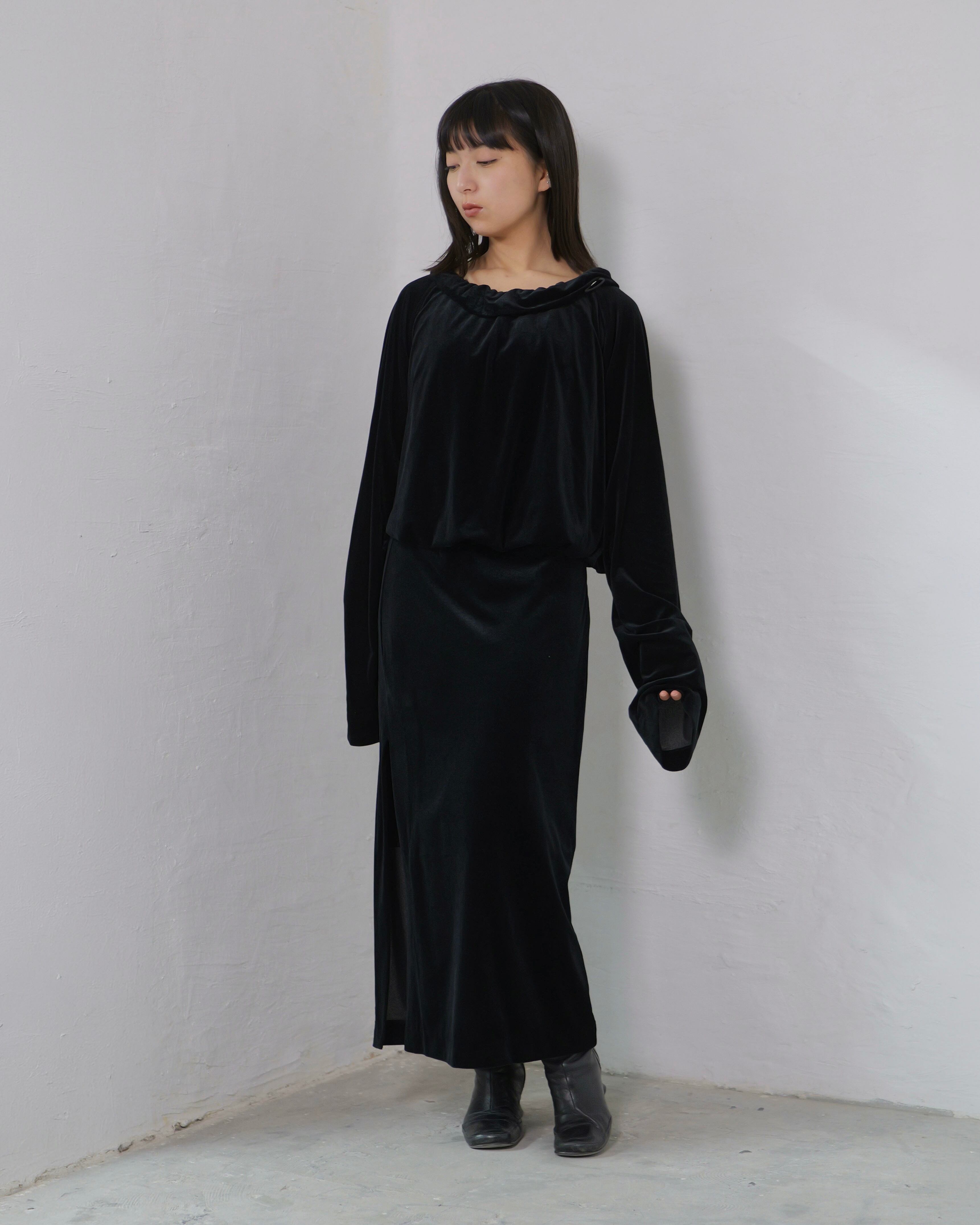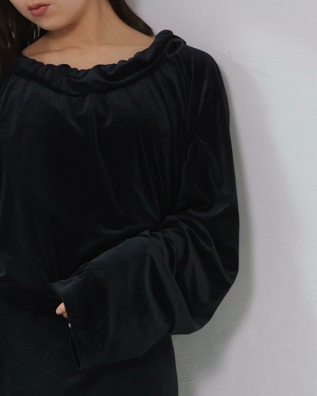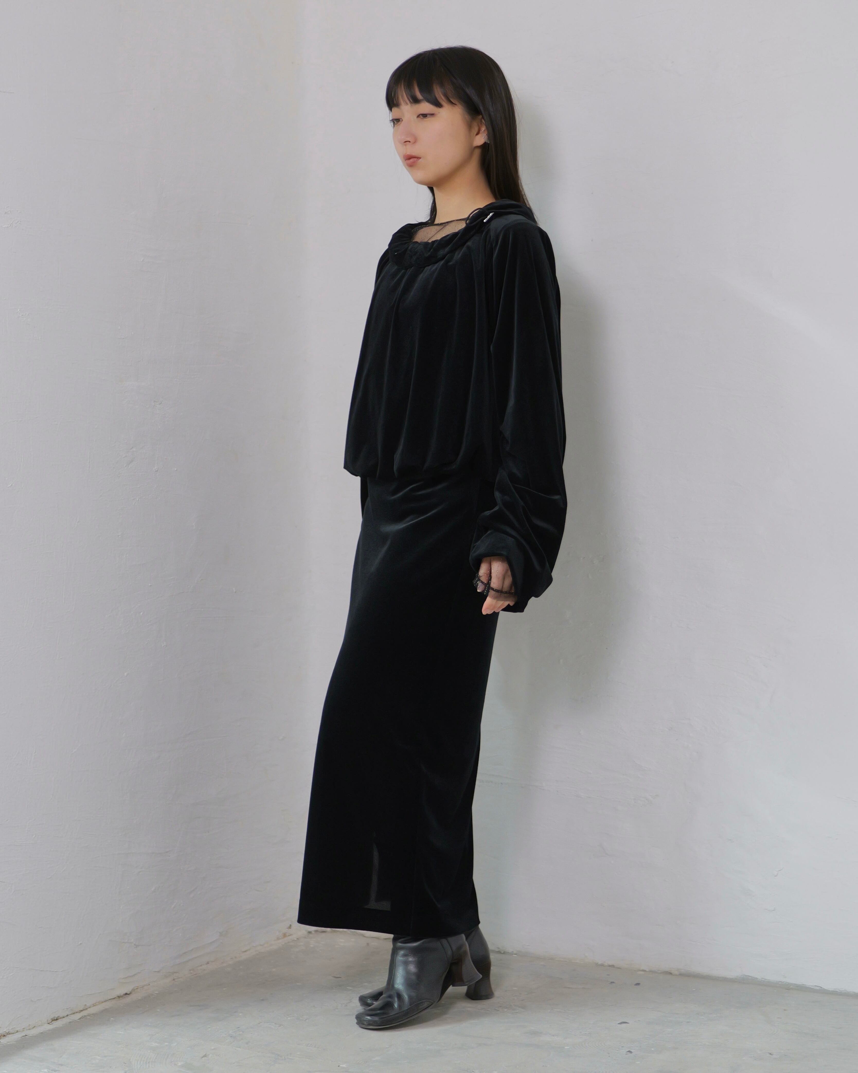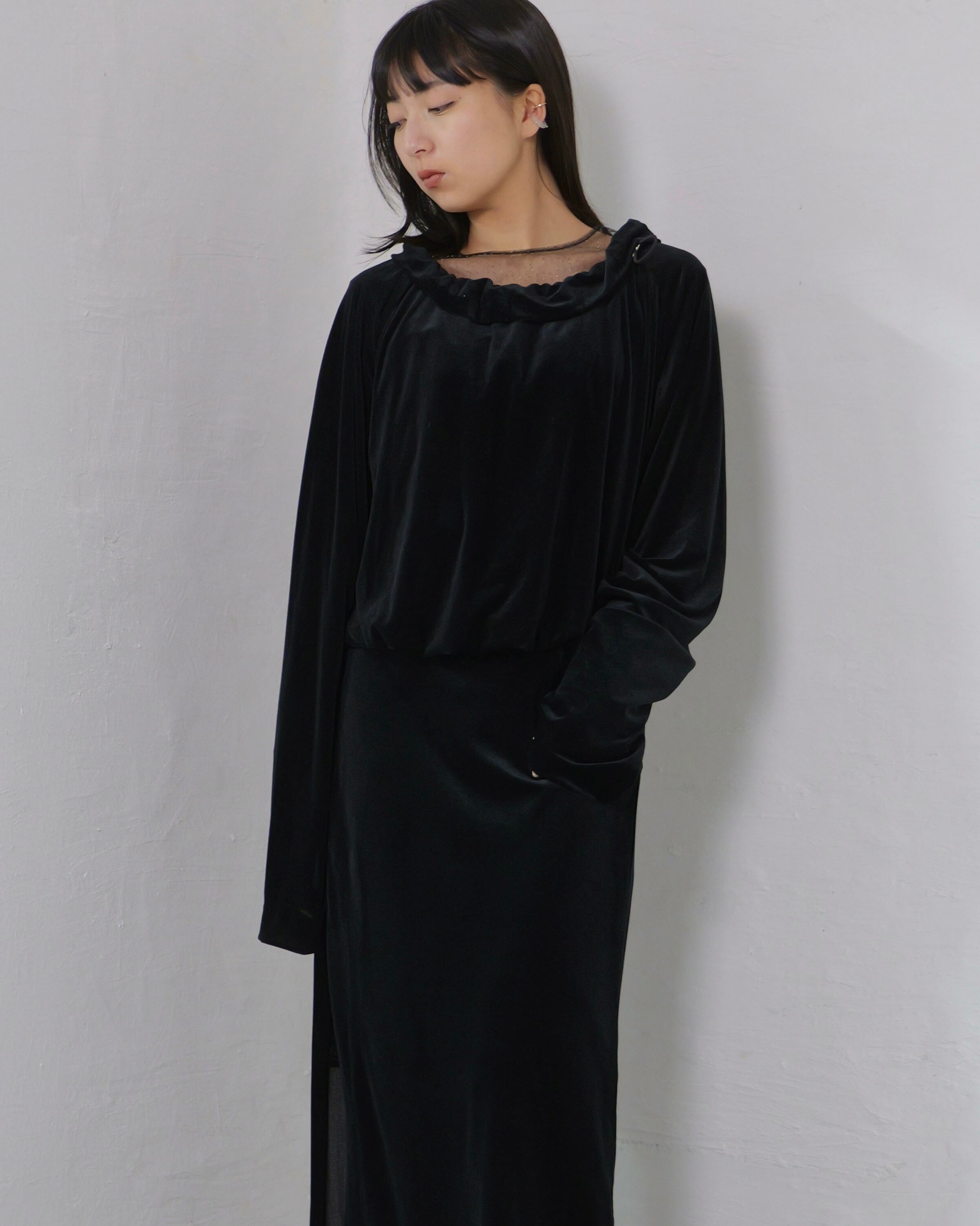 RITSUKO KARITA - Sheer Velour Gather Tops〔plain〕 :Black|透けベロア/ネックギャザー