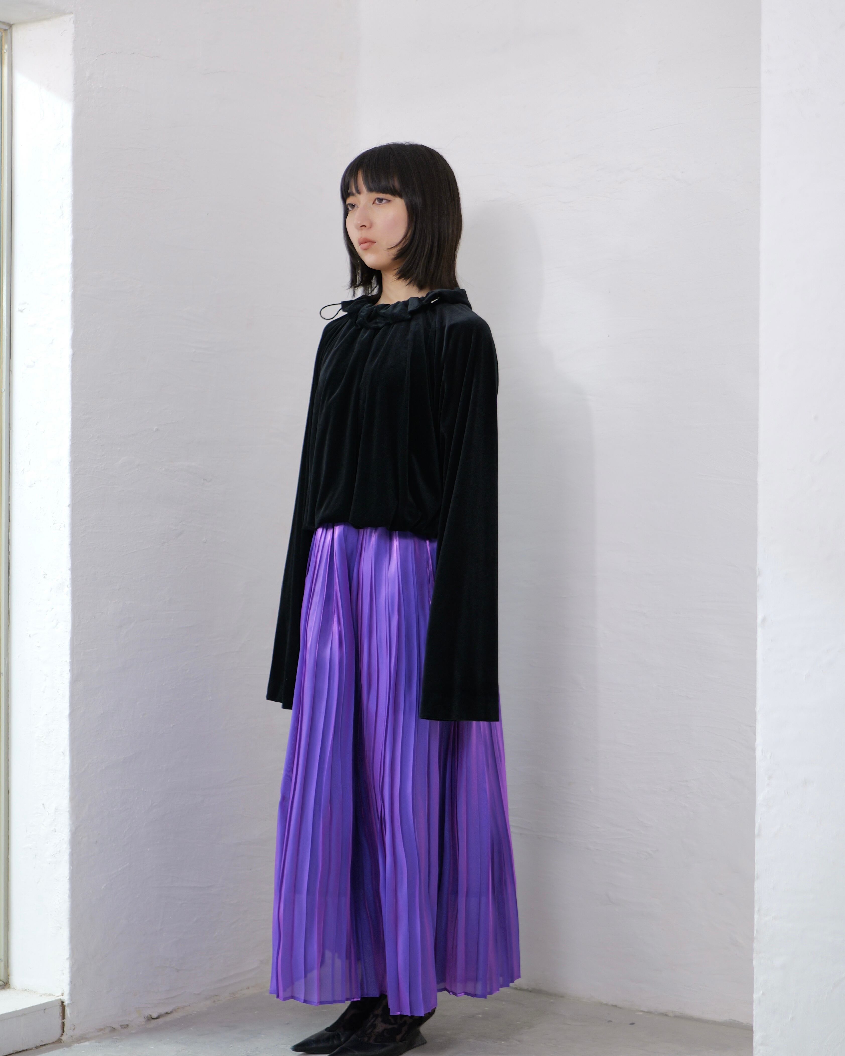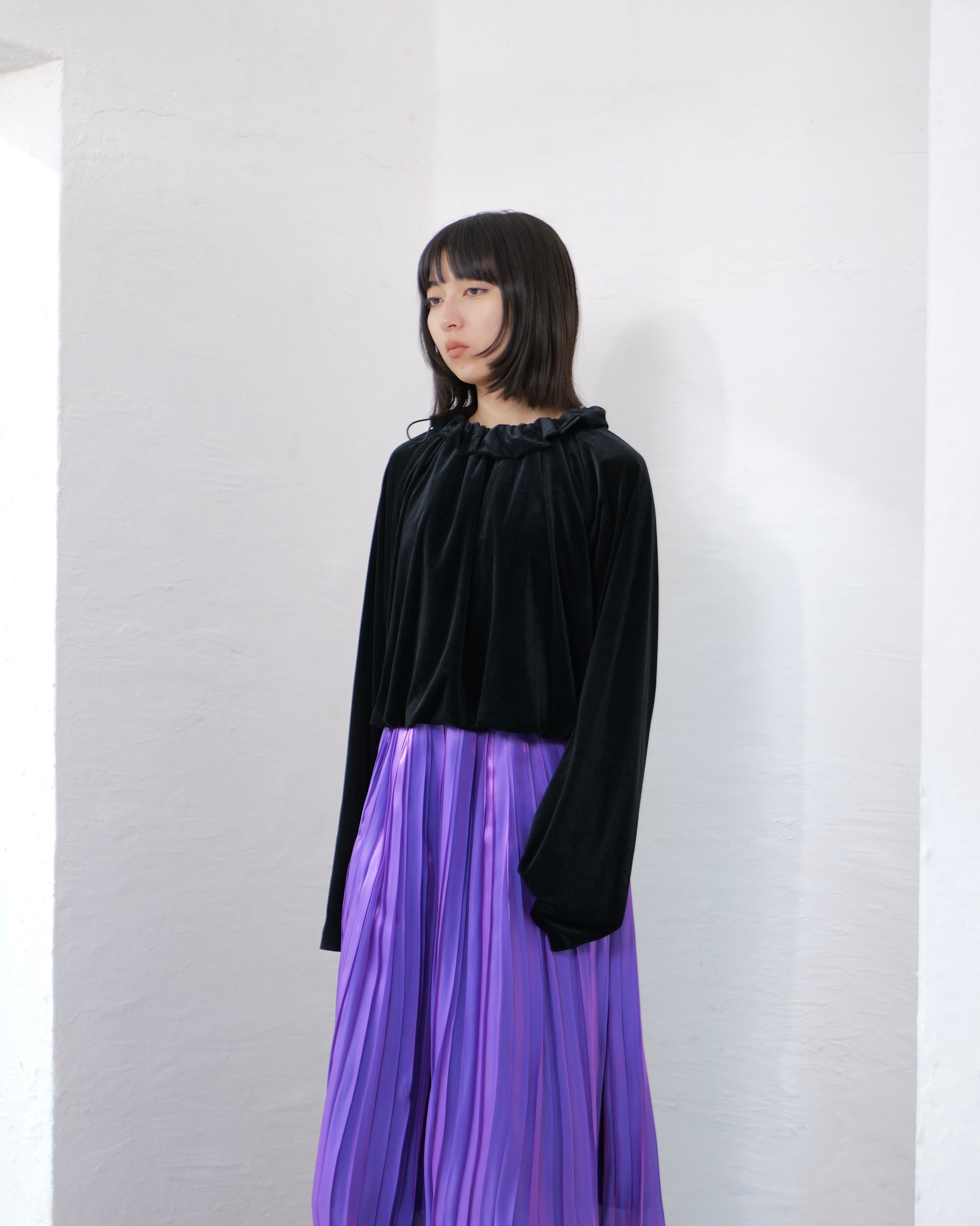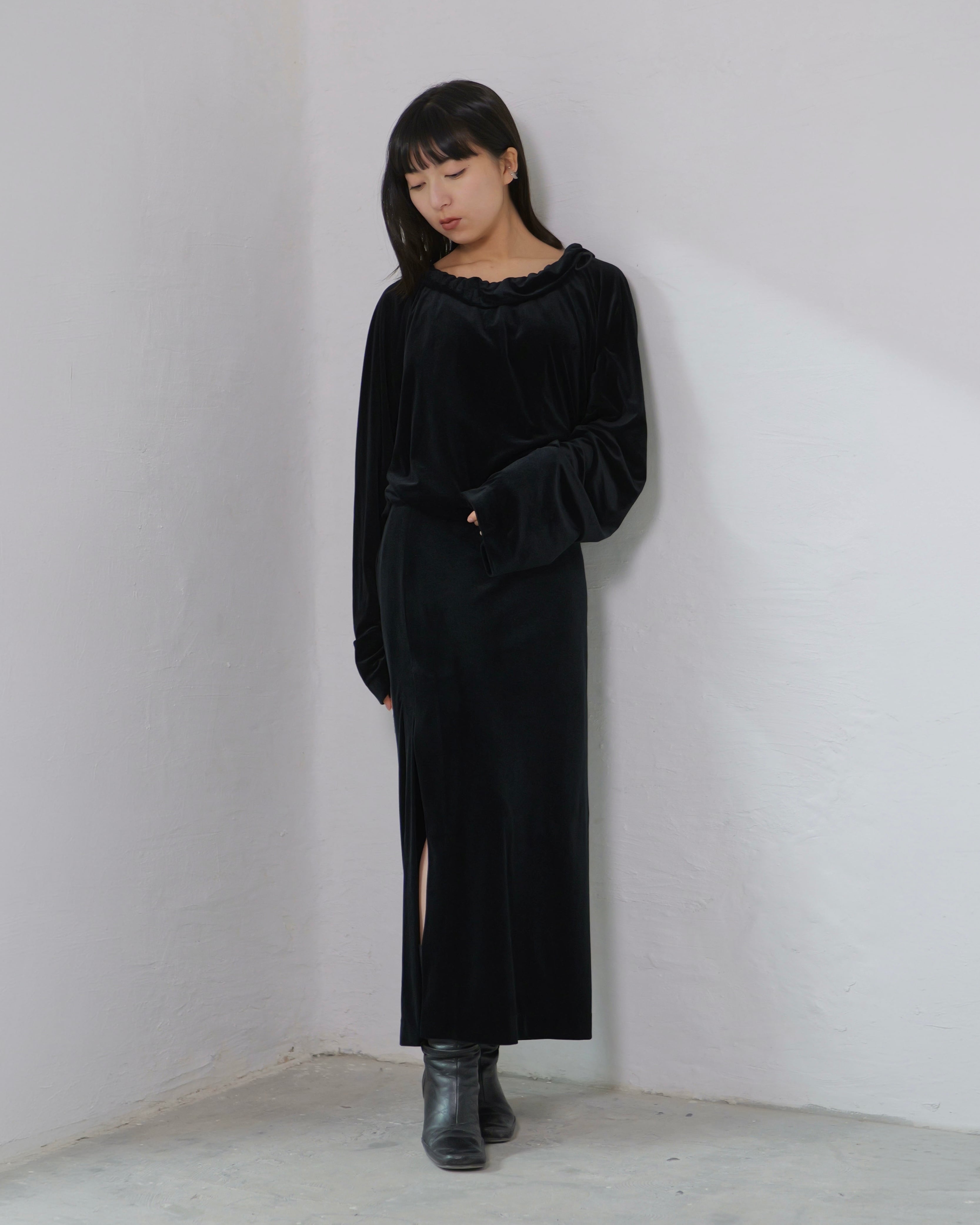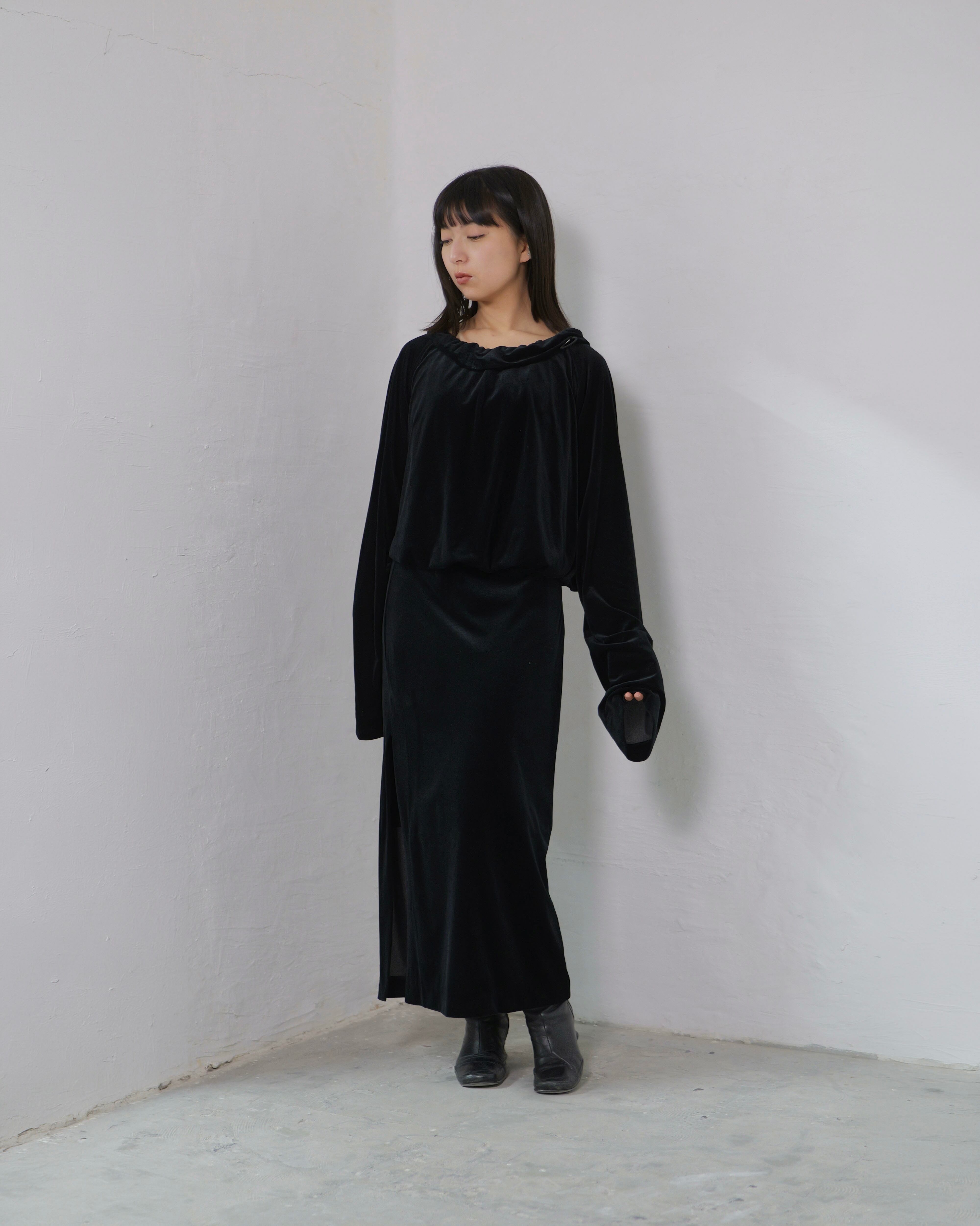 RITSUKO KARITA - Sheer Velour Gather Tops〔plain〕 :Black|透けベロア/ネックギャザー