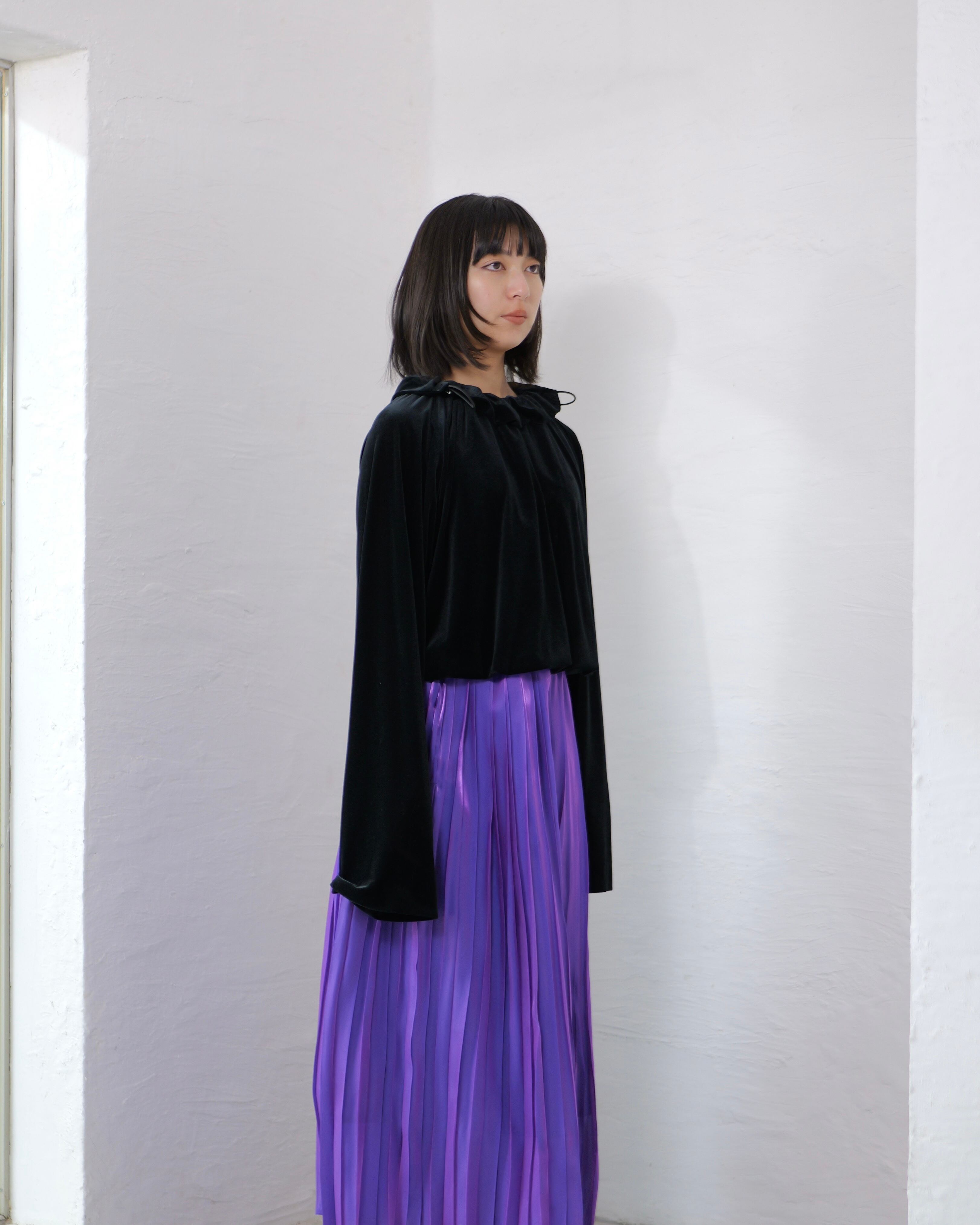 首元はギャザーを寄せて着る設計で、立体感が生まれ、顔まわりが静かに整います。