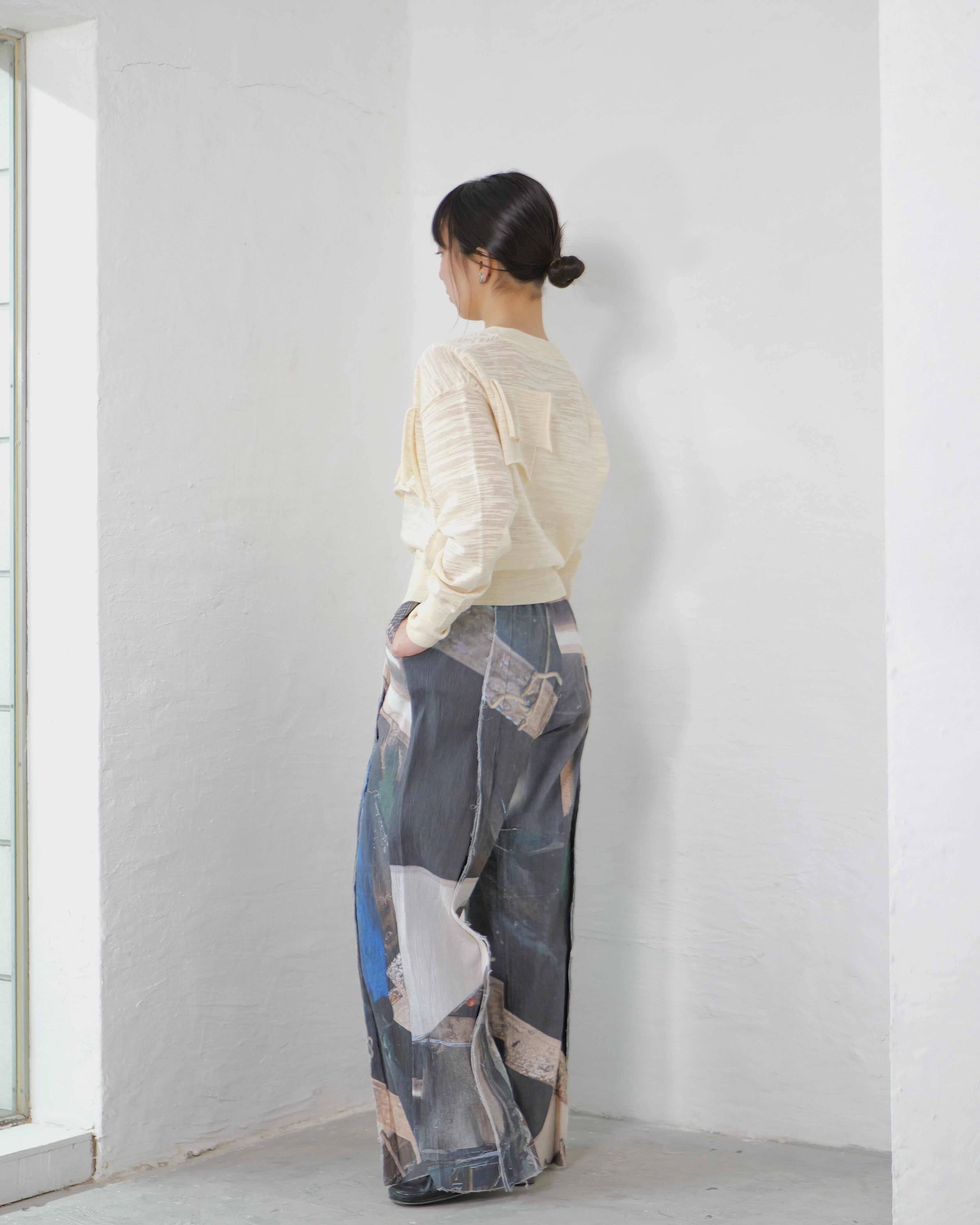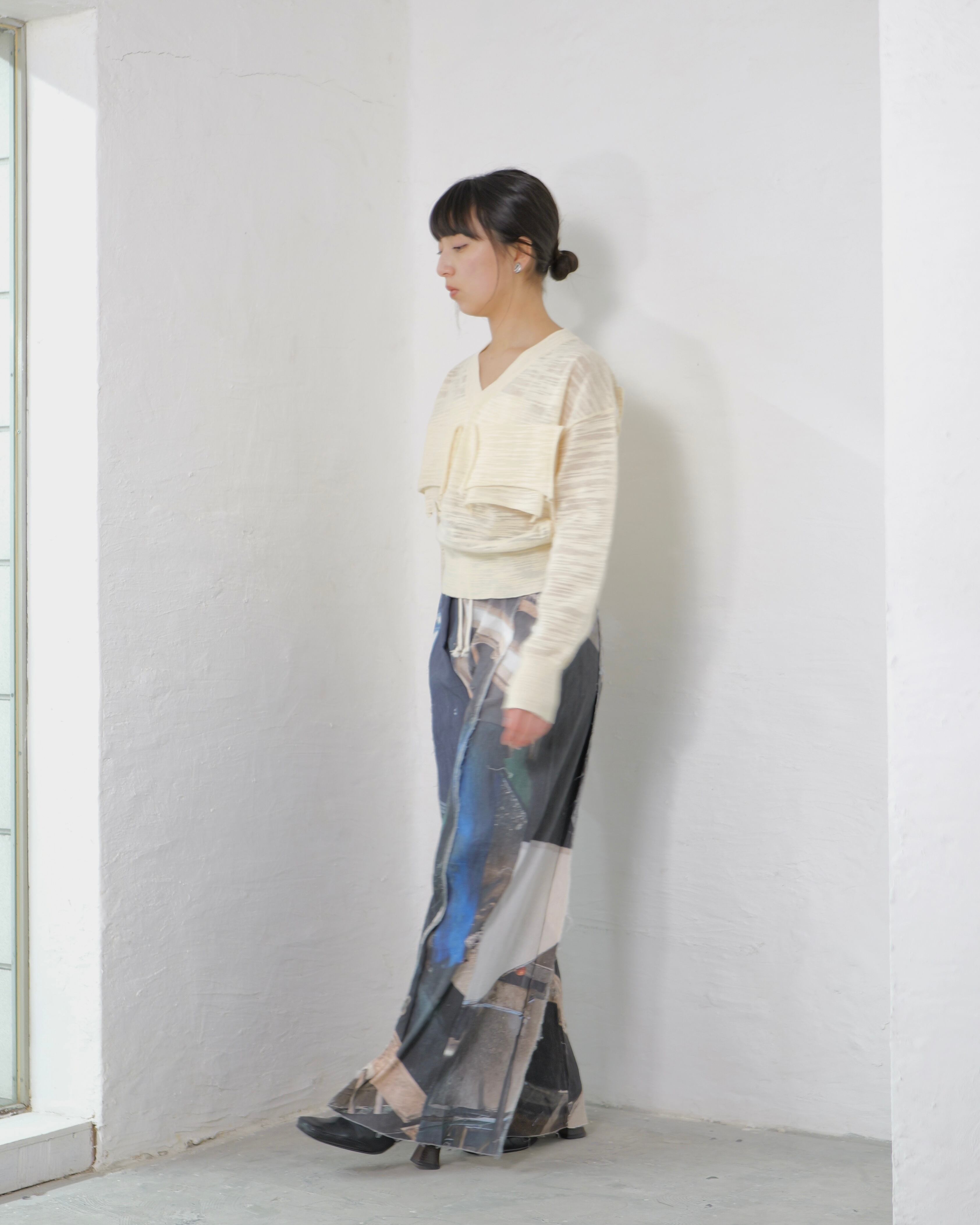 A. トップに透けと立体感があるので、ボトムはスラックス、デニム、落ち感のあるスカートまで幅広く。迷ったら、腰回りがすっきりしたパンツで縦のラインをつくるとバランスが取りやすいです。