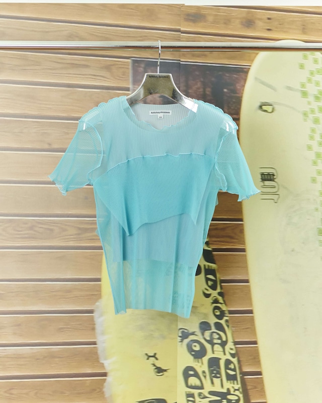 This set pairs a sheer tulle dress—like a “shell” you can see through—with an inner dress that makes the color look clean and vivid.