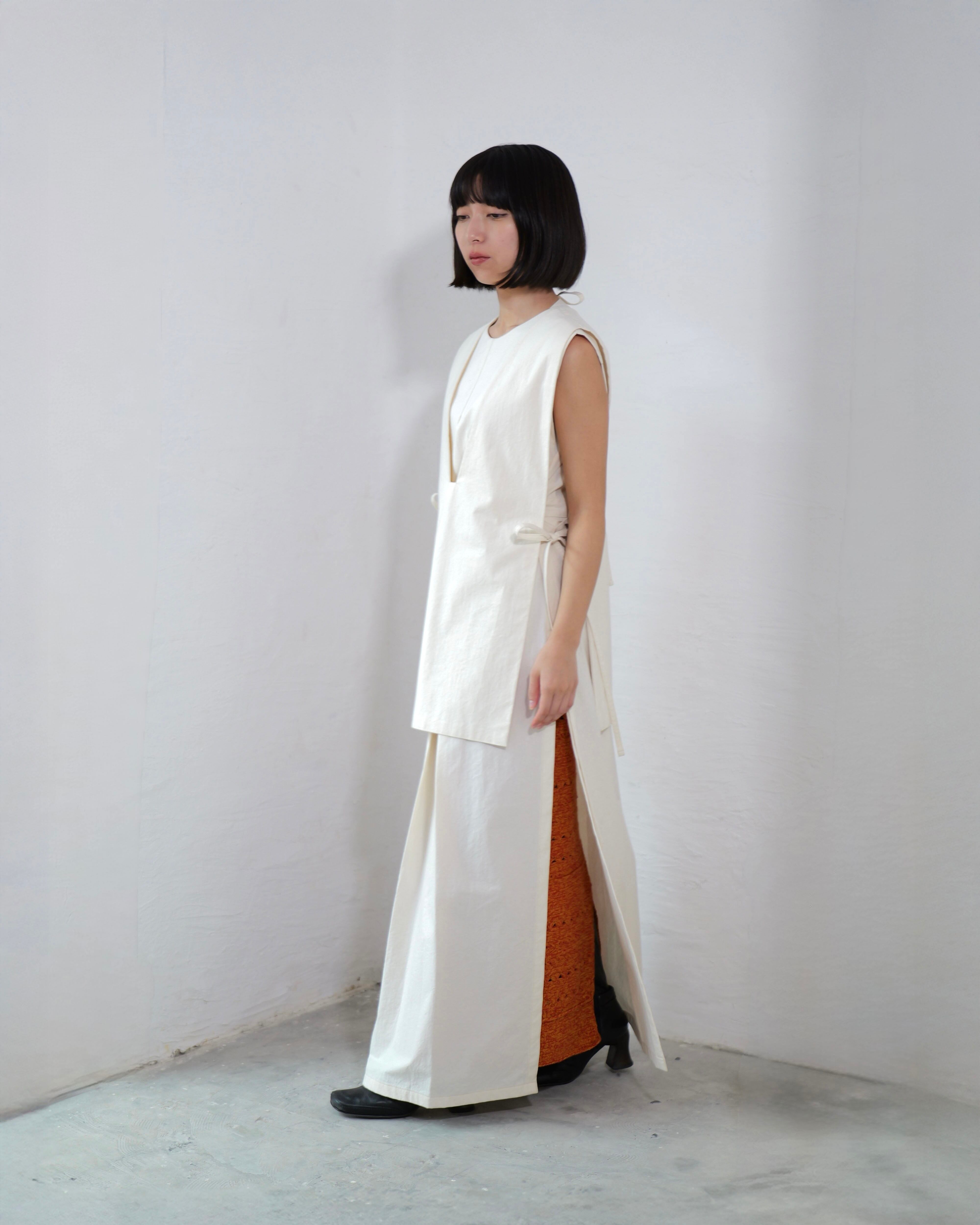 Made-to-order sleeveless dress (OPEN TYPE only) in high-density cotton horse-cloth. The layered inner dress features a back slit from neck to waist, allowing airy styling. Drawcords let you cinch side/front/back; vest and dress can also be worn separately.
