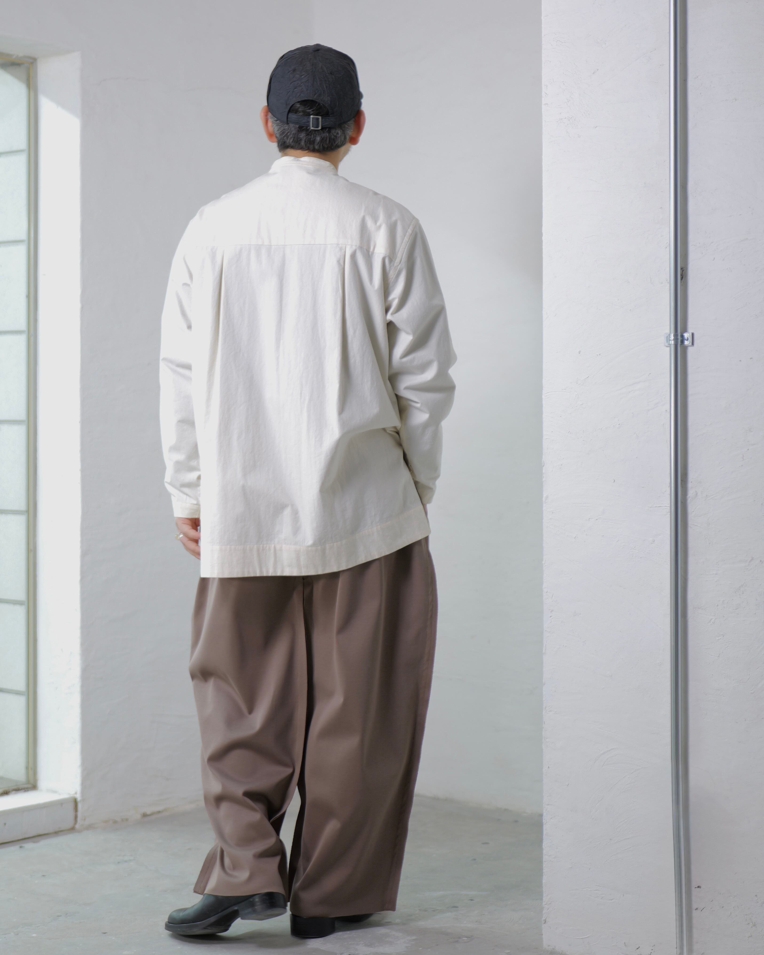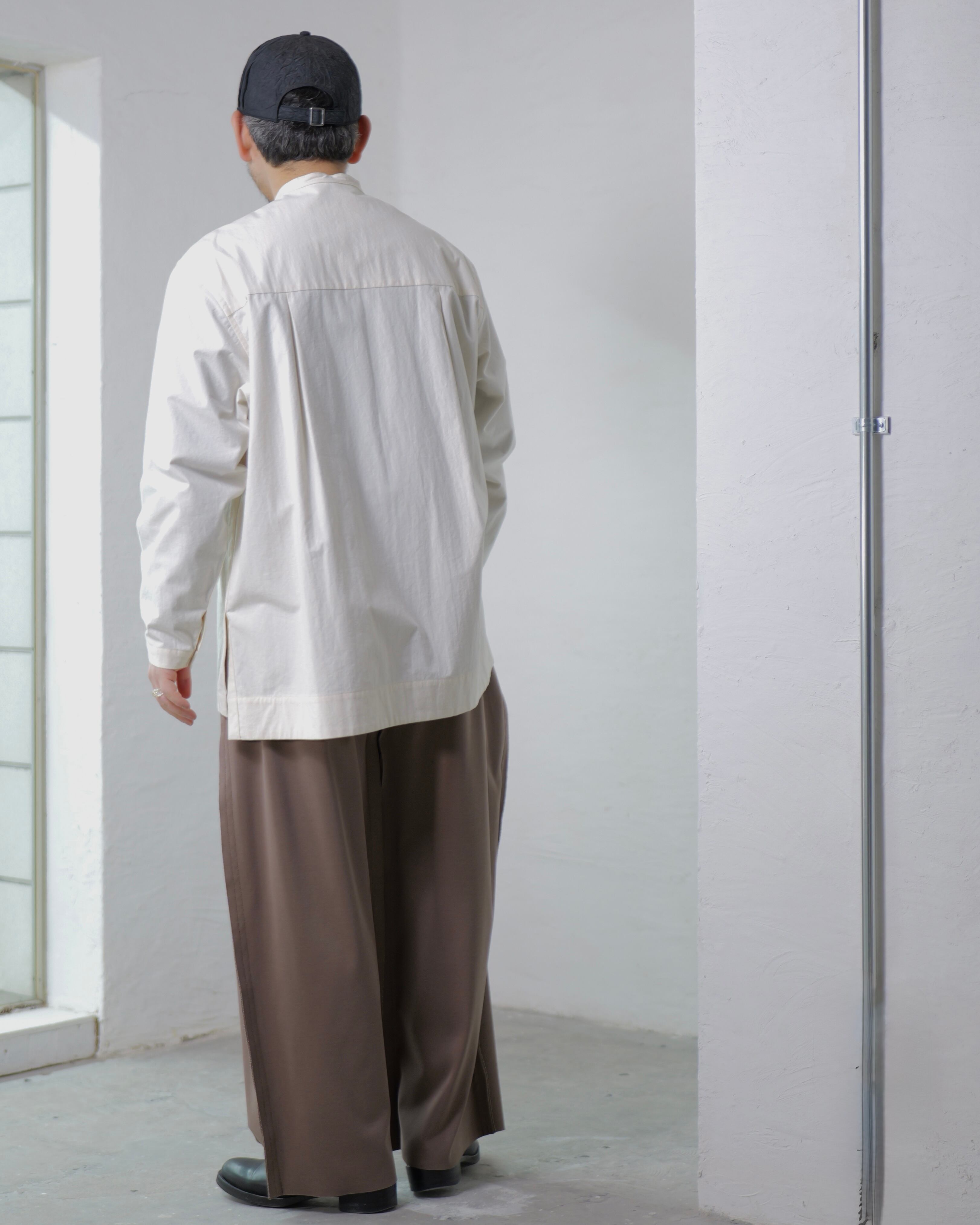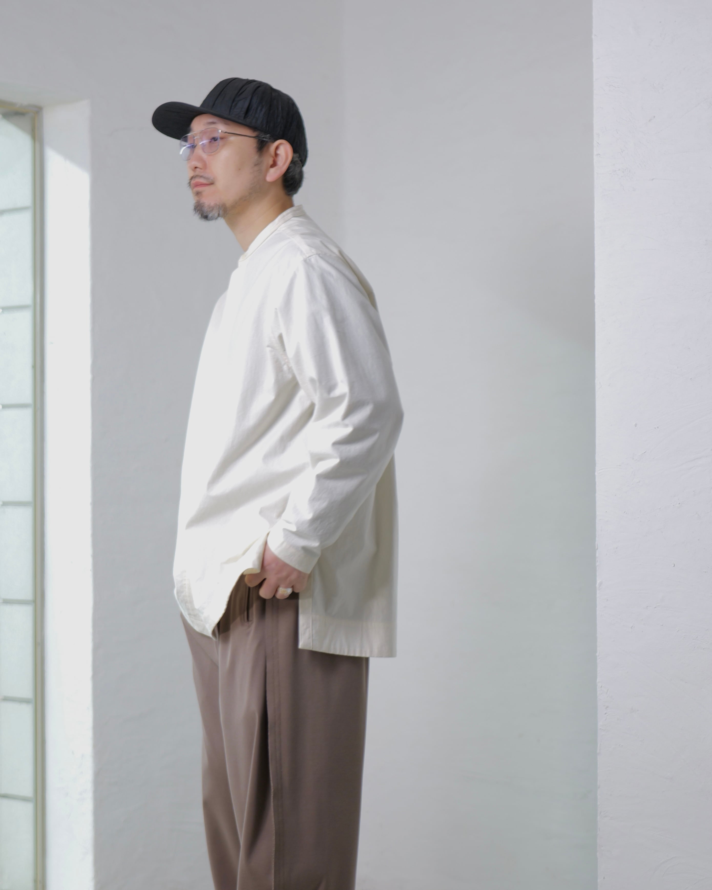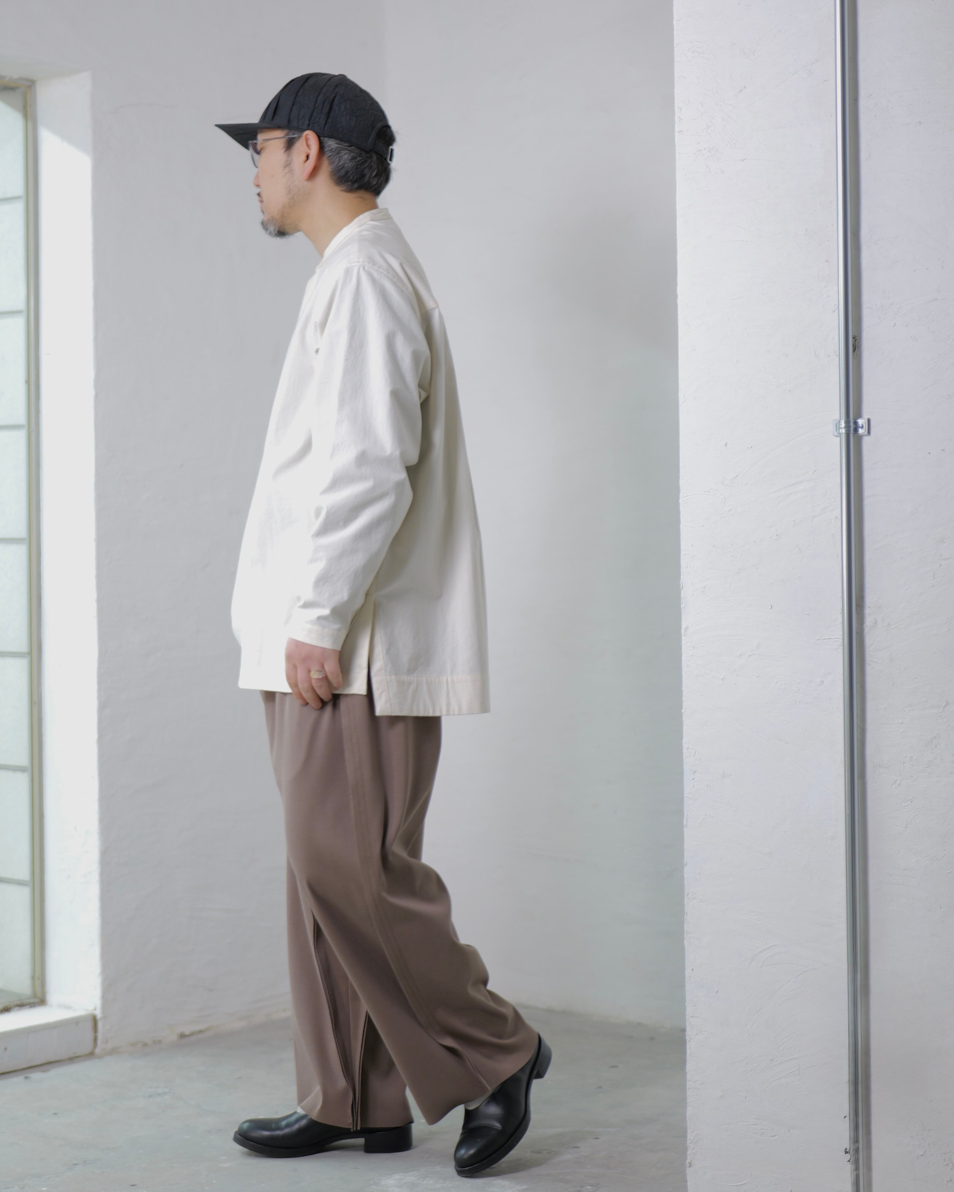 一見するとシンプルでも、着たときのバランスや縫製仕様、布の重なり方まで丁寧に設計されており、日々の使用の中で良さがじわっと見えてくるようなものづくりが魅力です。
