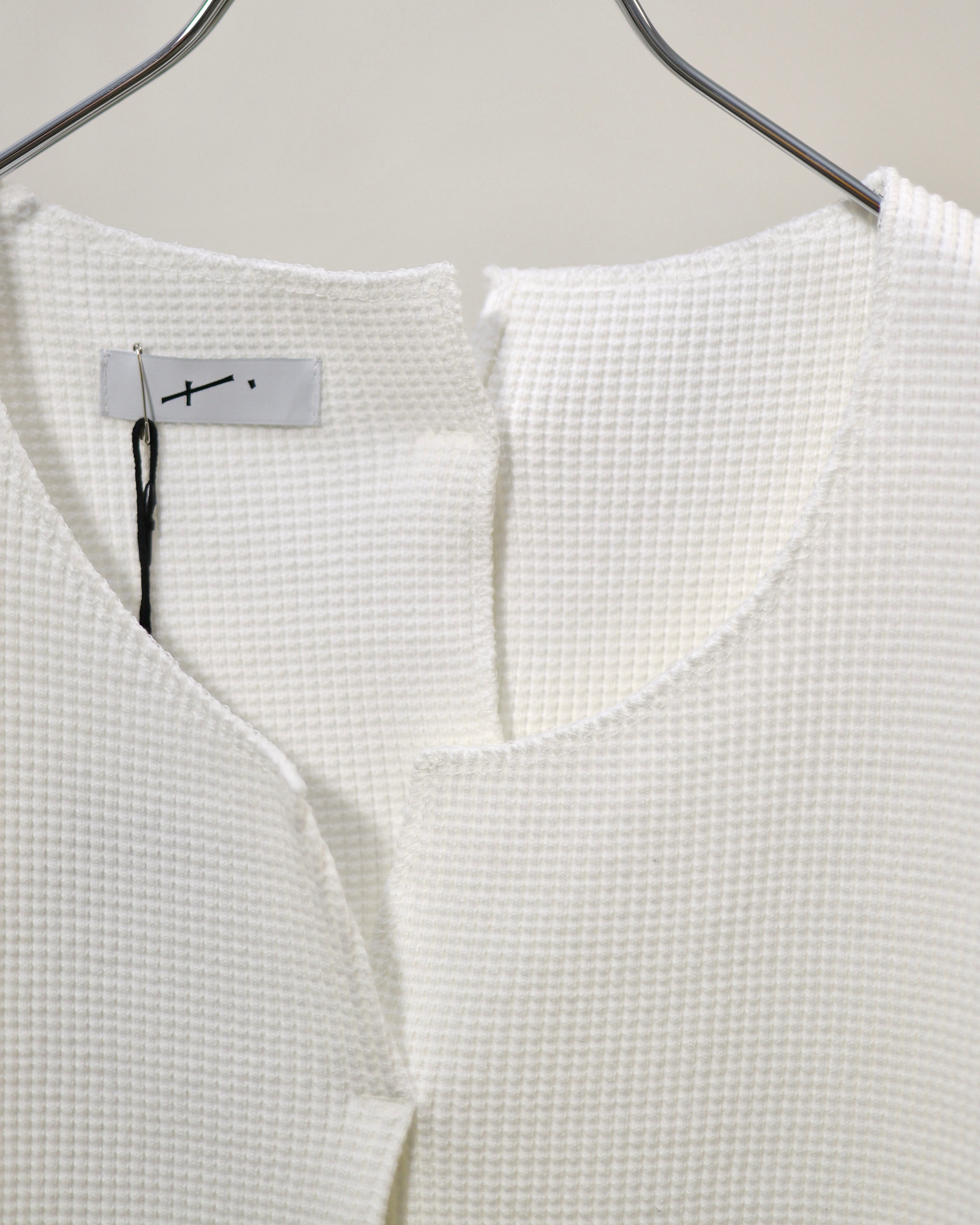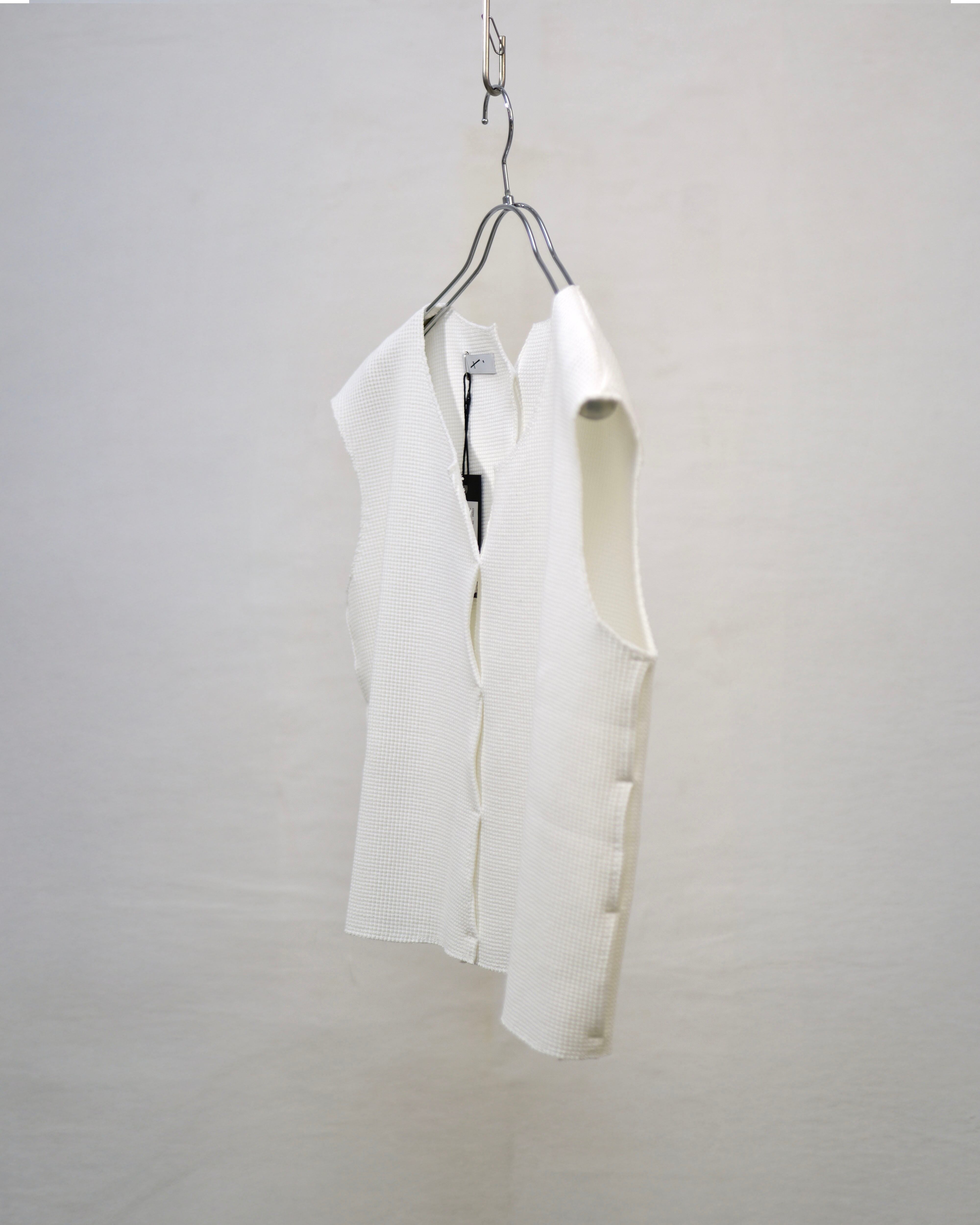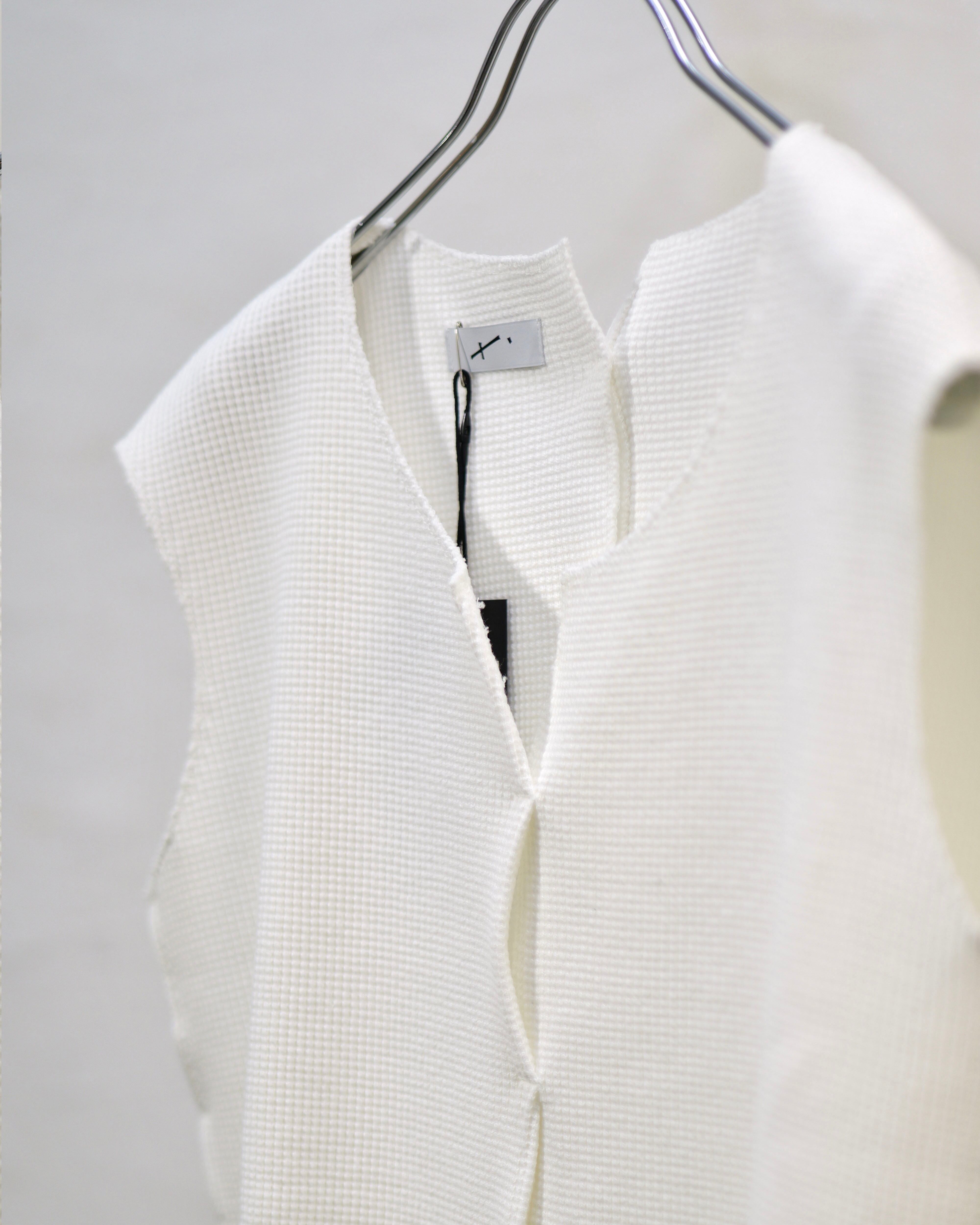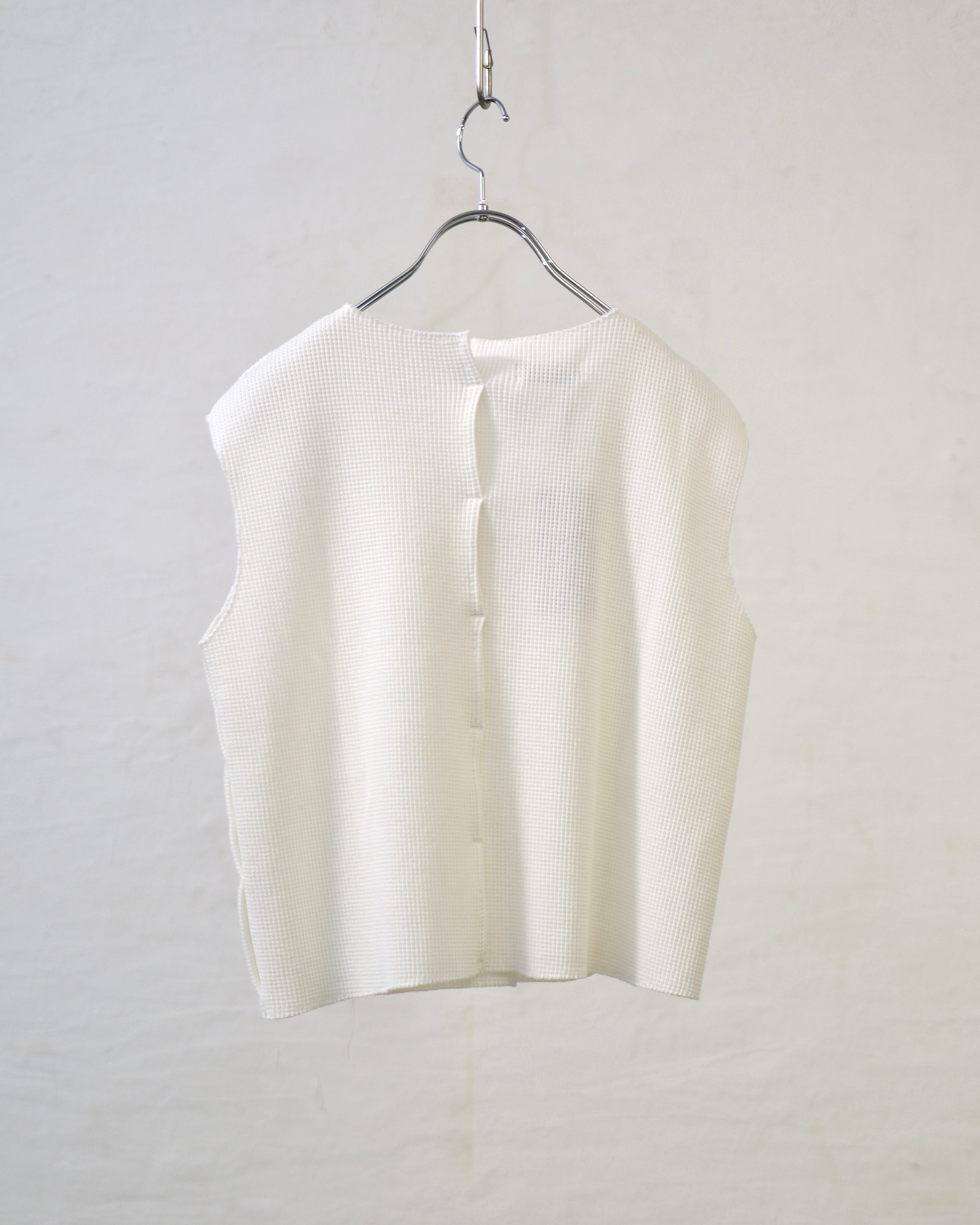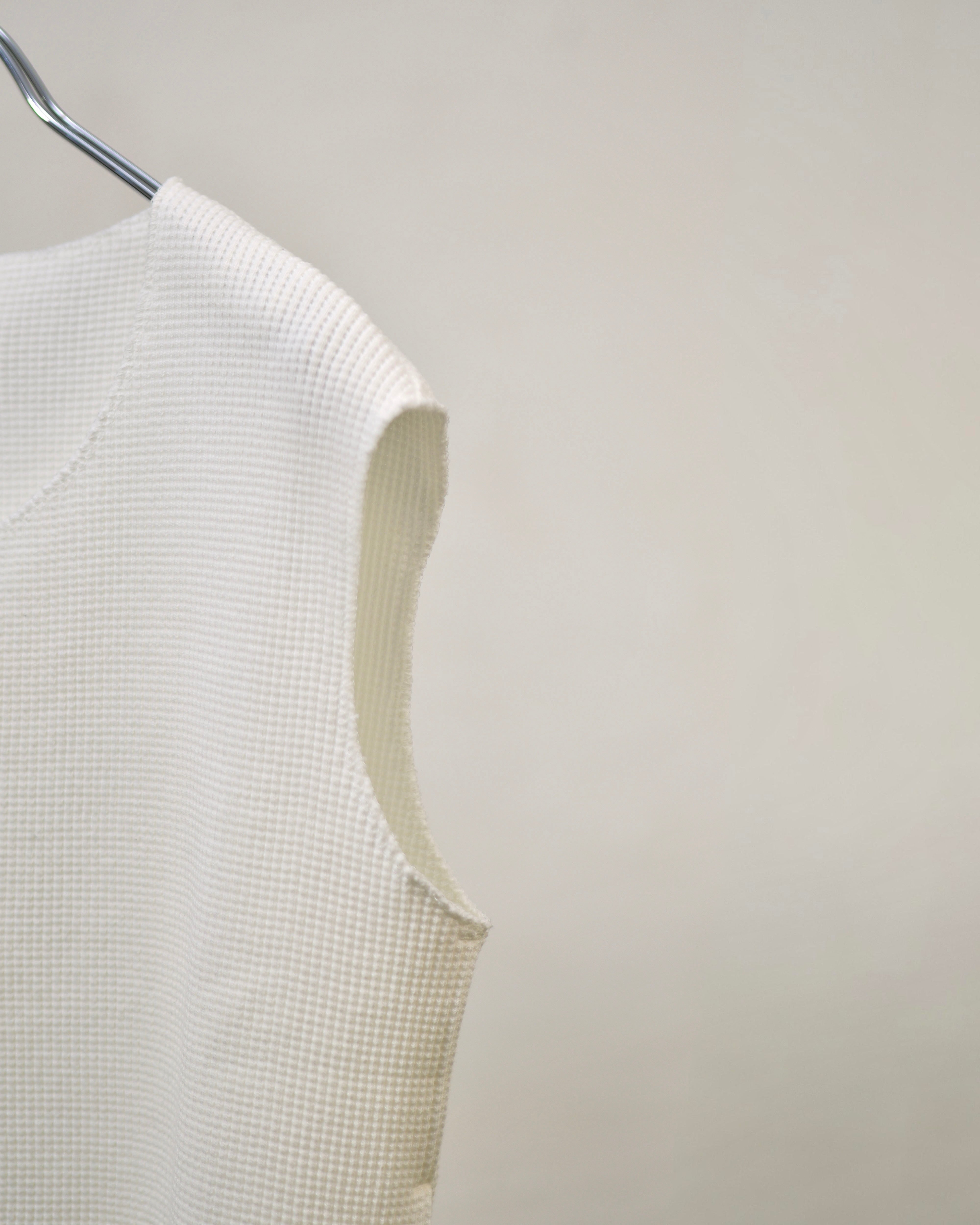 This sleeveless top stands out with its sculptural silhouette and delicate detailing. Uniquely designed with reinforced bar-tack stitching—called kan-nuki—along the front, back, and sides, the garment intentionally leaves subtle gaps, allowing fresh air to pass through for a light and breathable feel.