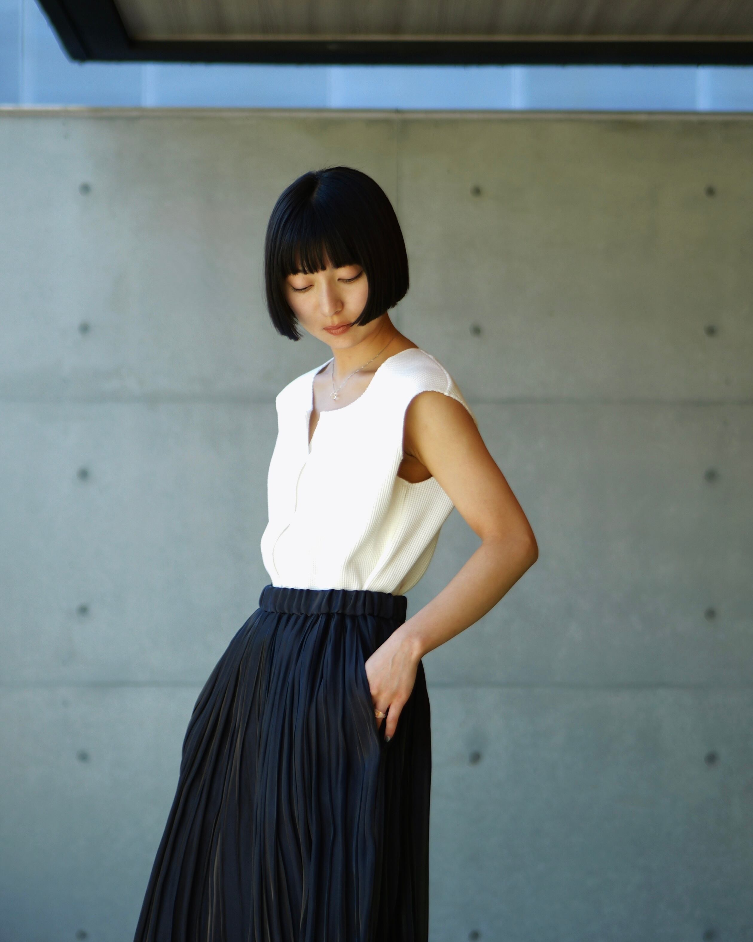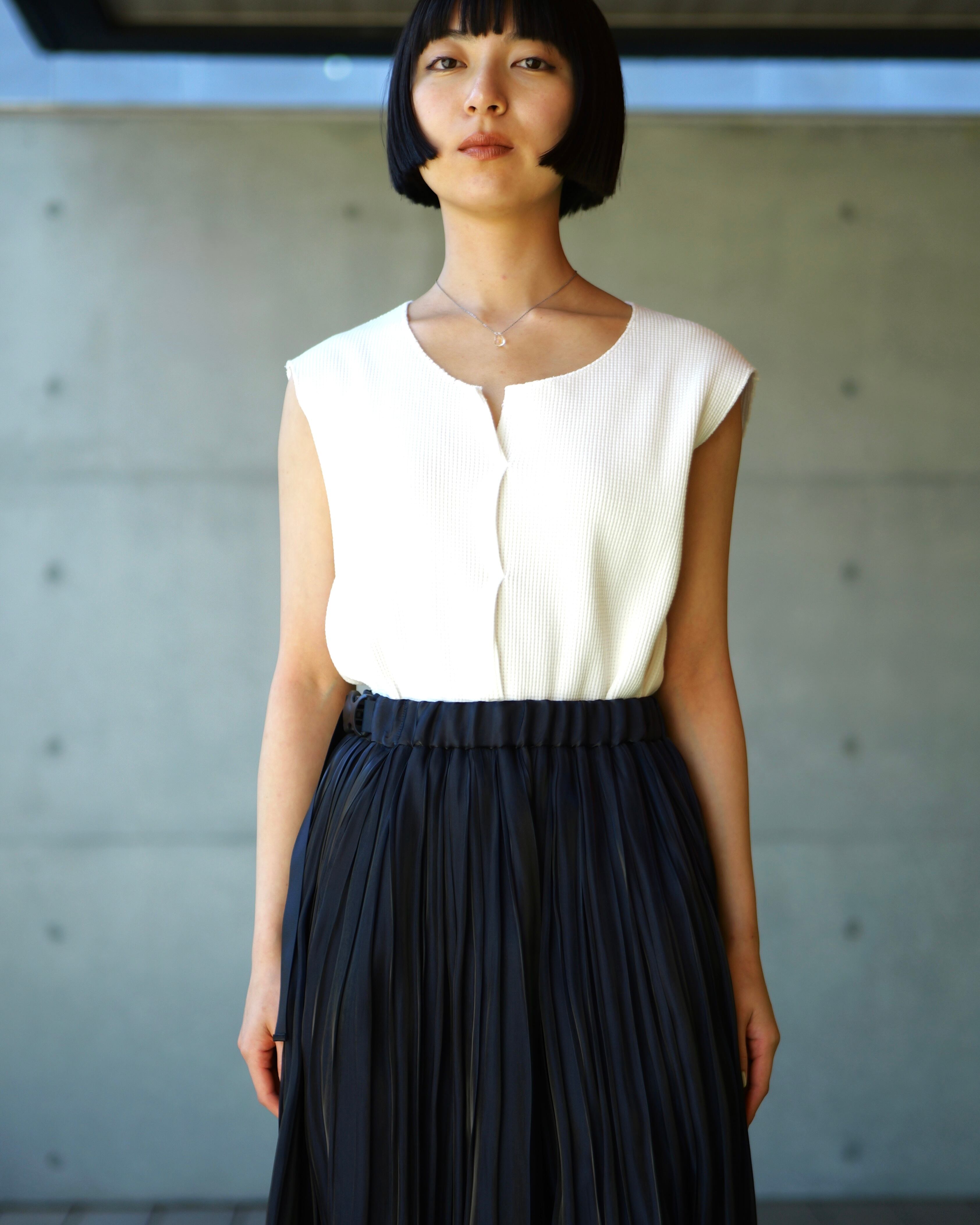 立体的なフォルムと繊細なディテールが際立つ、ノースリーブトップス。前後と左右の脇を、あえて「閂(かんぬき)」と呼ばれる補強用ミシンで固定することで、あえて隙間を生み出し、風通しの良い軽やかな着心地を実現しました。