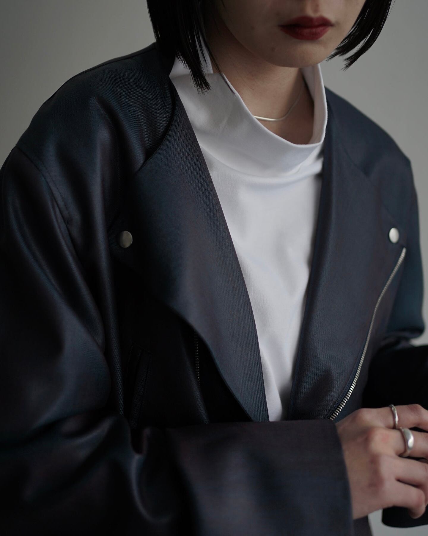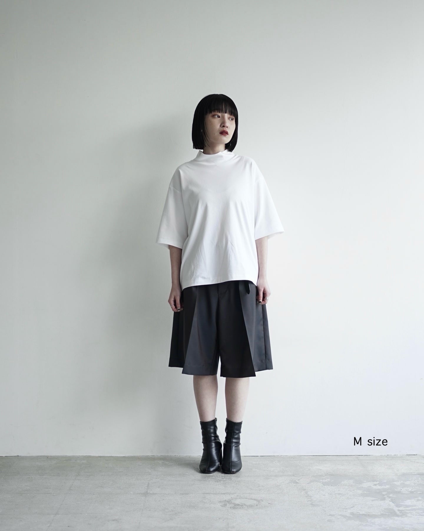 少し大きく開いたモックネック、肘まで隠す袖口の広いハーフスリーブは通した身体を美しく見せる、着用者の余白となります。