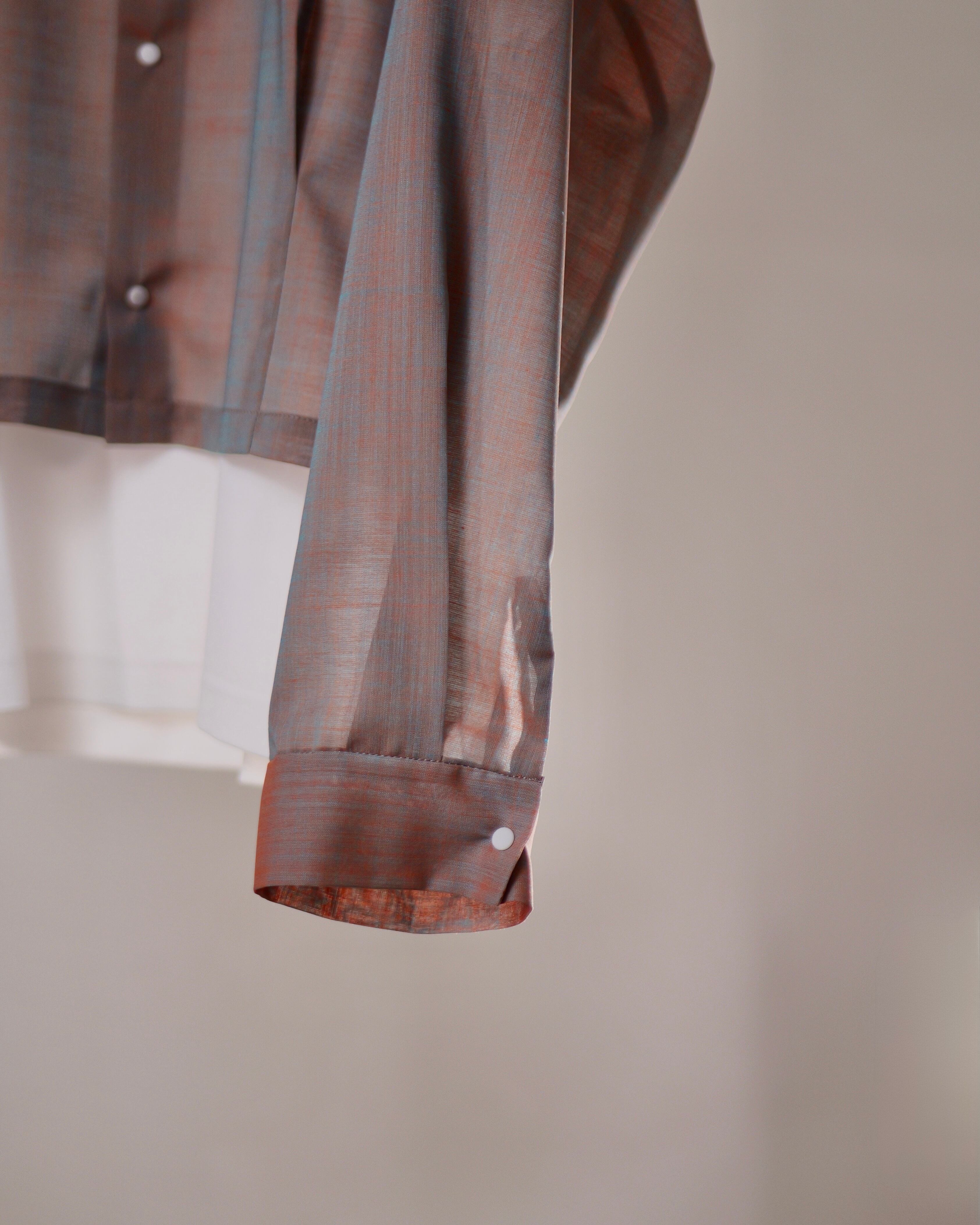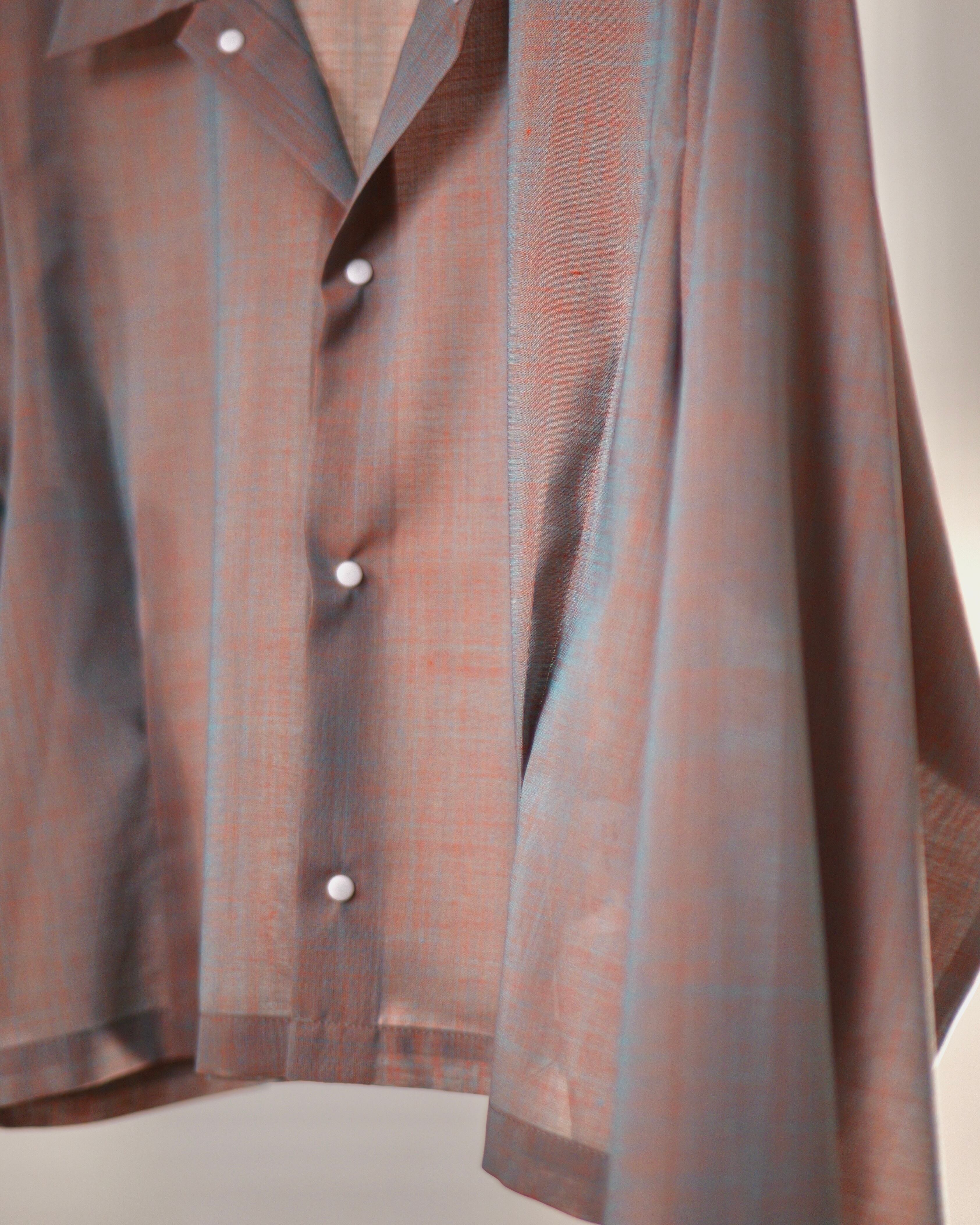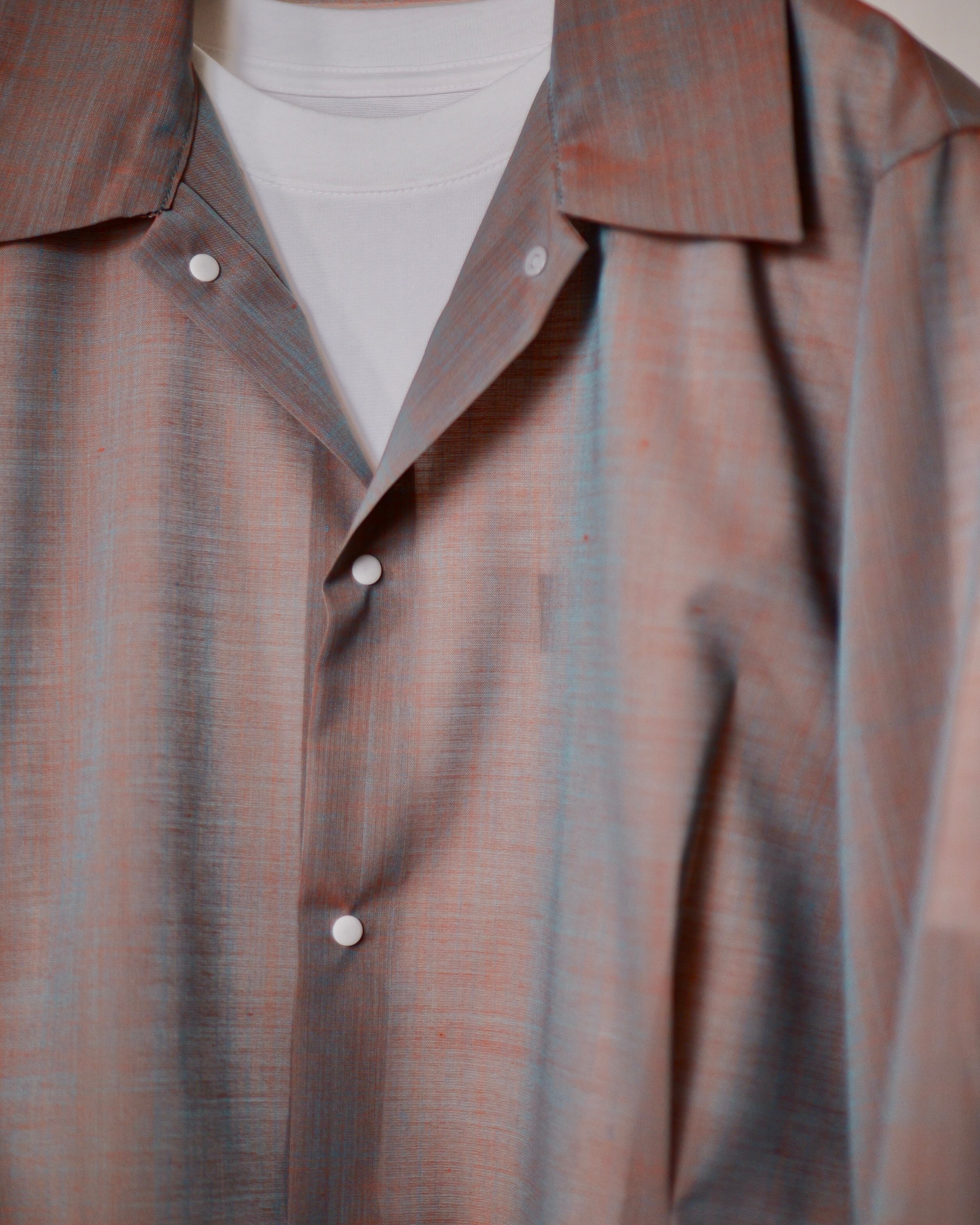 毛羽が少なく滑らかなSuper120’sウールとポリエステルを組み合わせた、高級感ある玉虫色の生地を使用したシャツです。薄手ながらも強い耐久性があり、シワになりにくい特性を持つため、日常使いから特別なシーンまで幅広く活躍します。