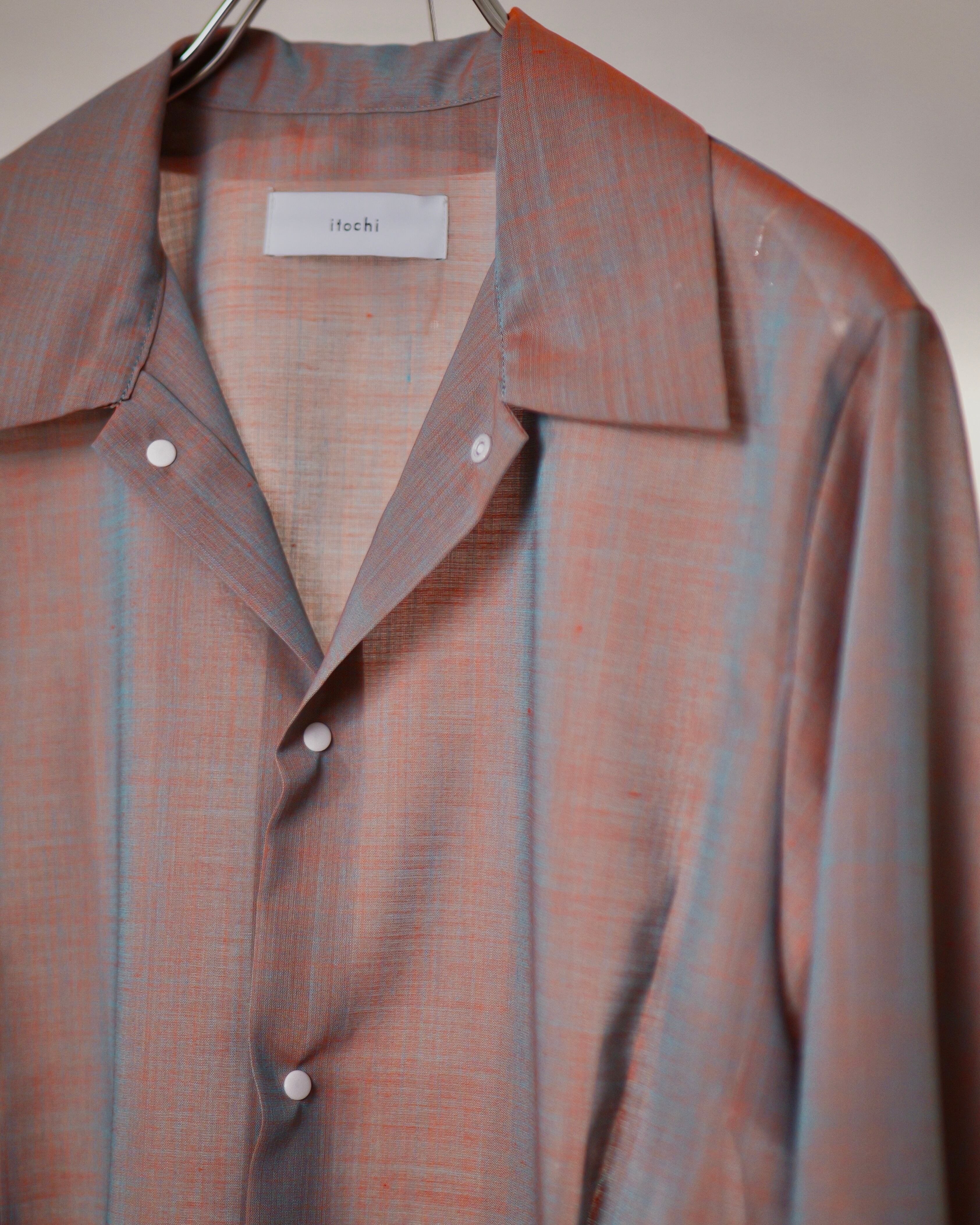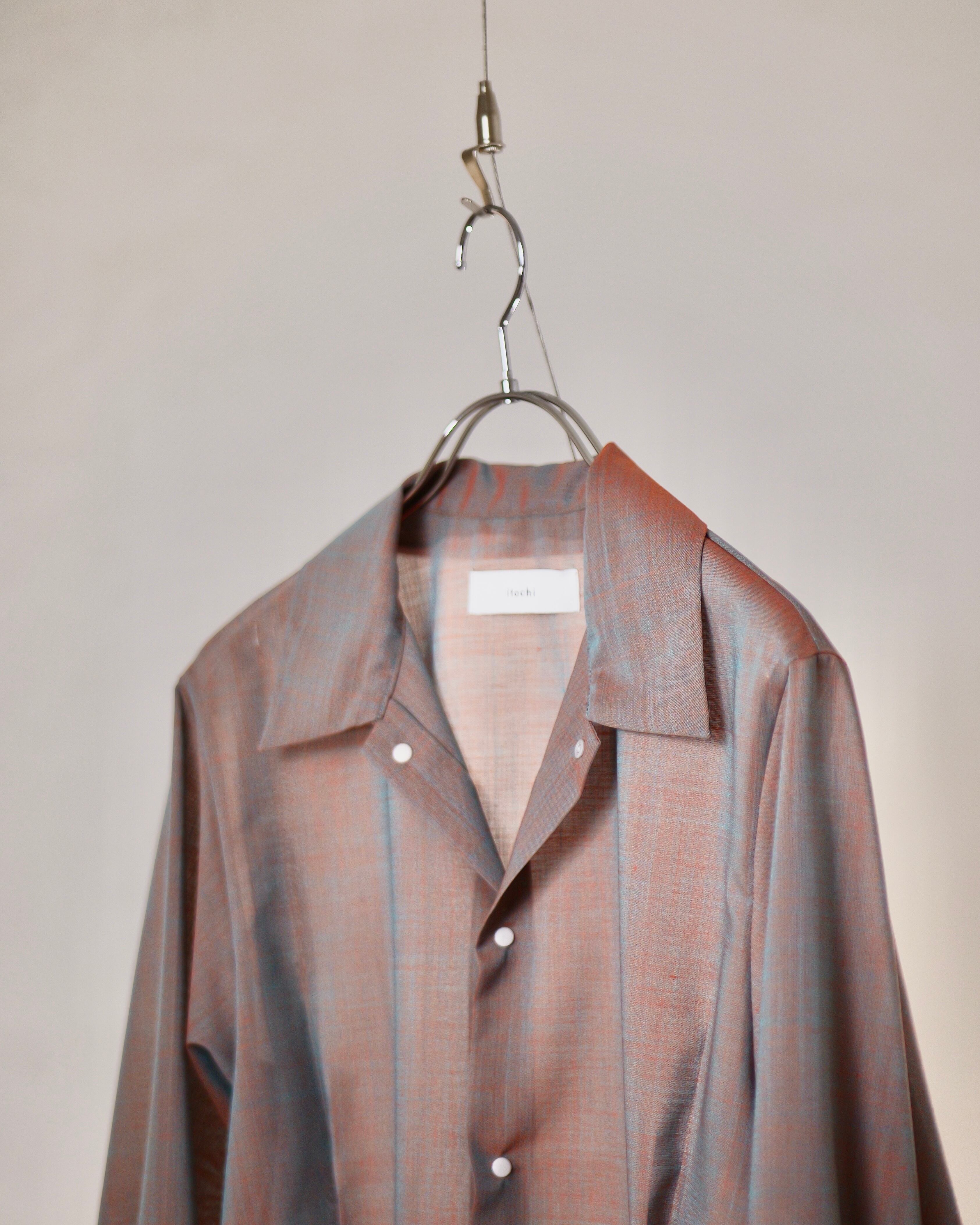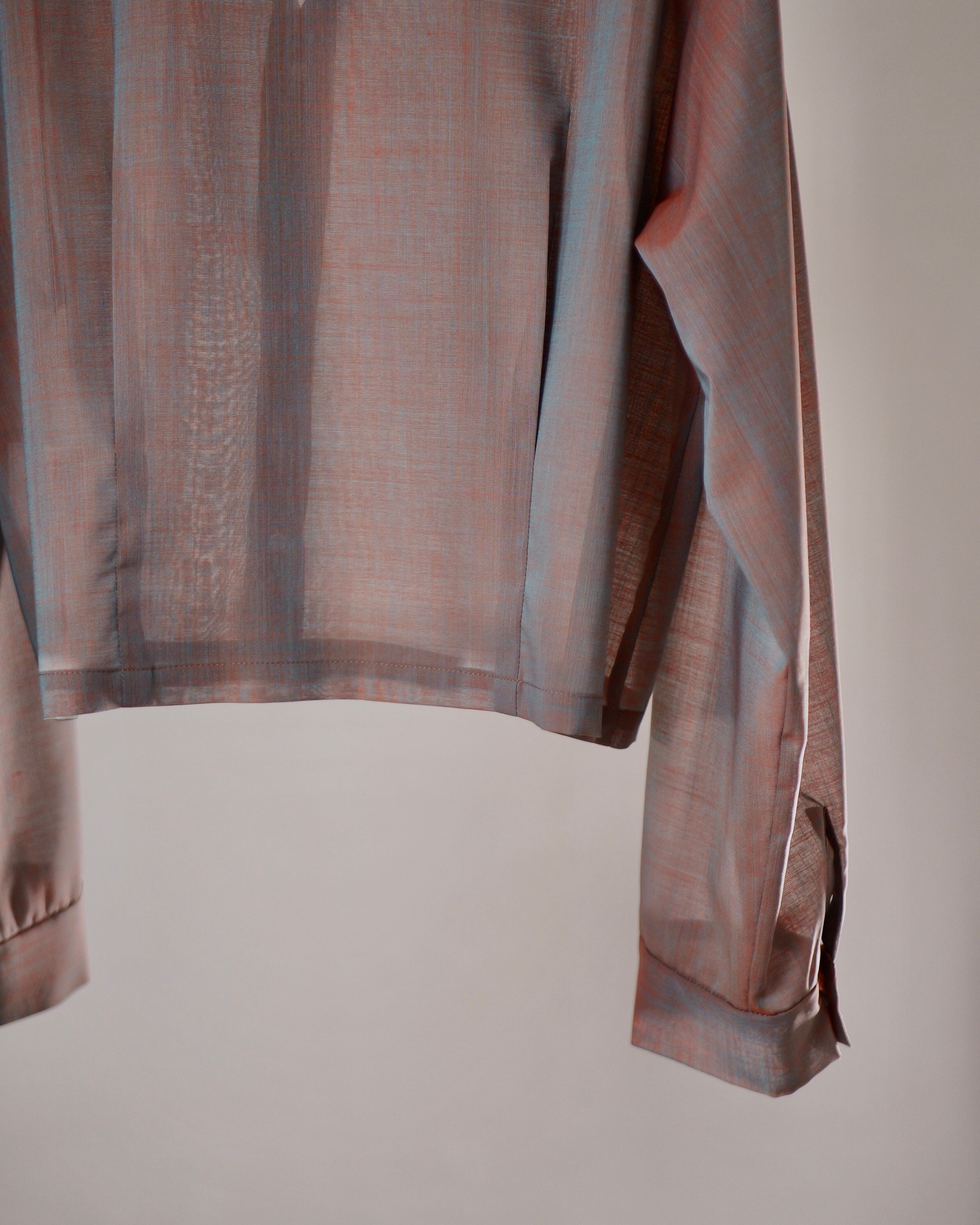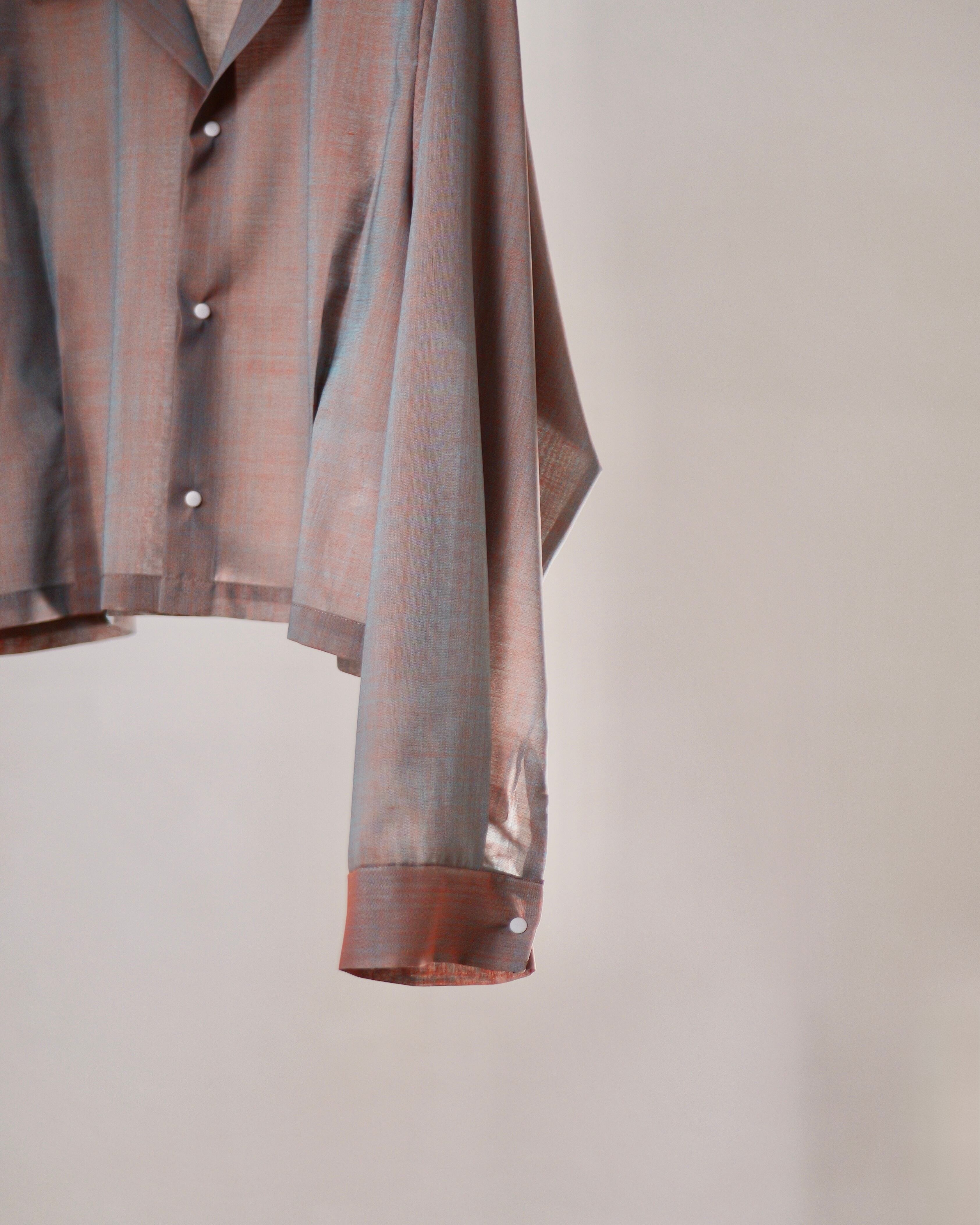 毛羽が少なく滑らかなSuper120’sウールとポリエステルを組み合わせた、高級感ある玉虫色の生地を使用したシャツです。薄手ながらも強い耐久性があり、シワになりにくい特性を持つため、日常使いから特別なシーンまで幅広く活躍します。
