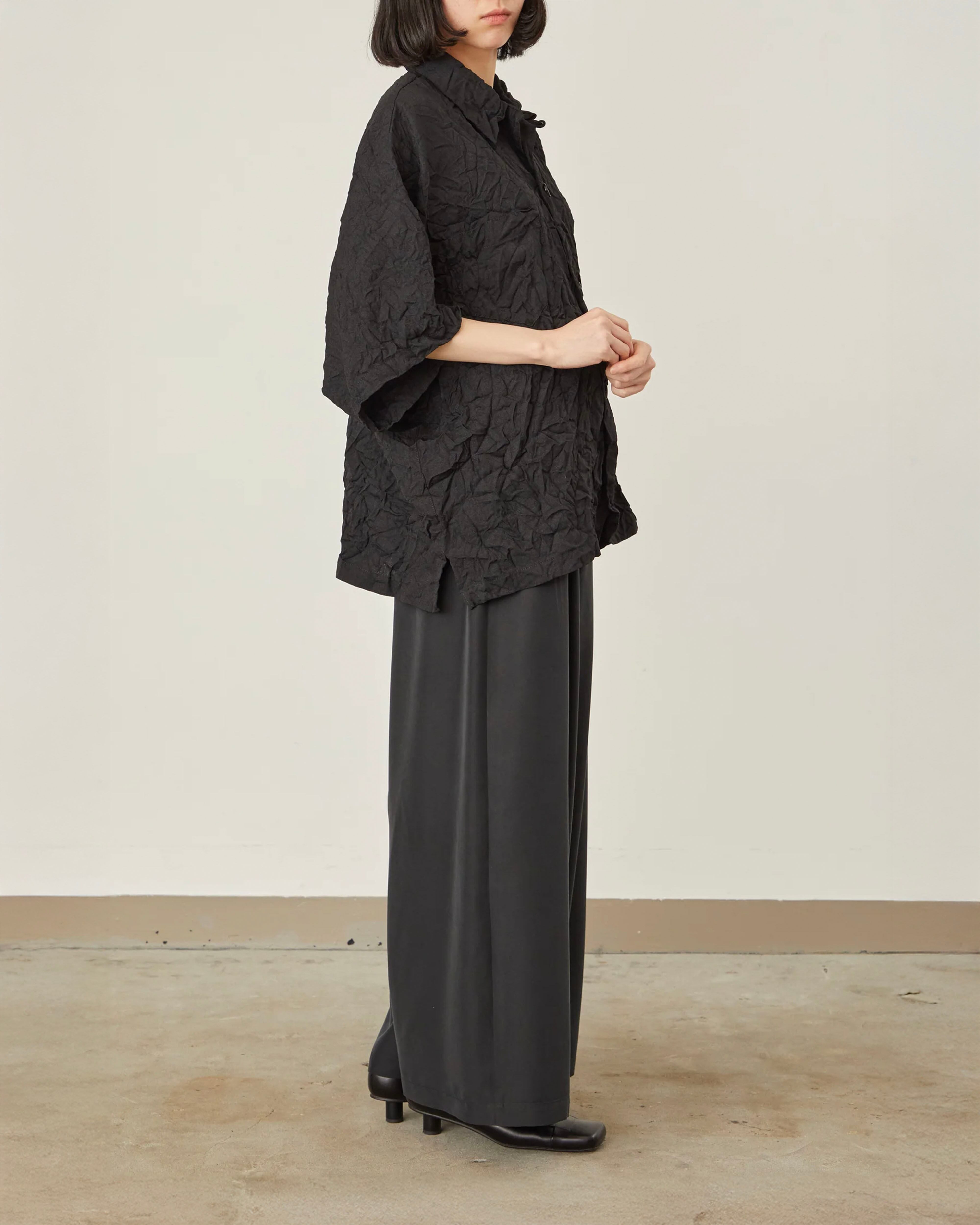 These shorts are crafted from a polyester fabric finished to mimic the texture of “linen,” using random slub yarn. The material is treated with a memory-effect catch-washer pleating process, creating a unique textured surface.