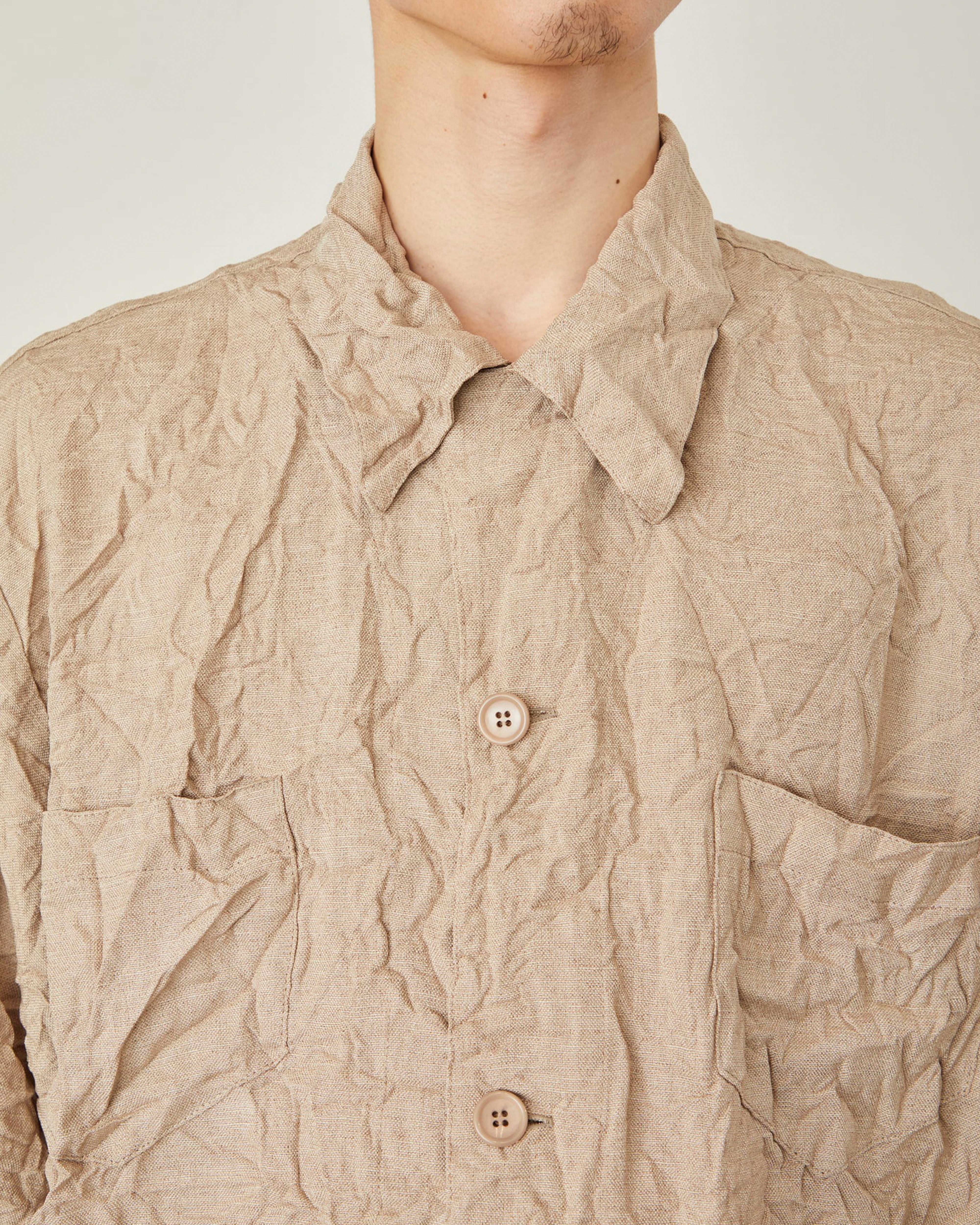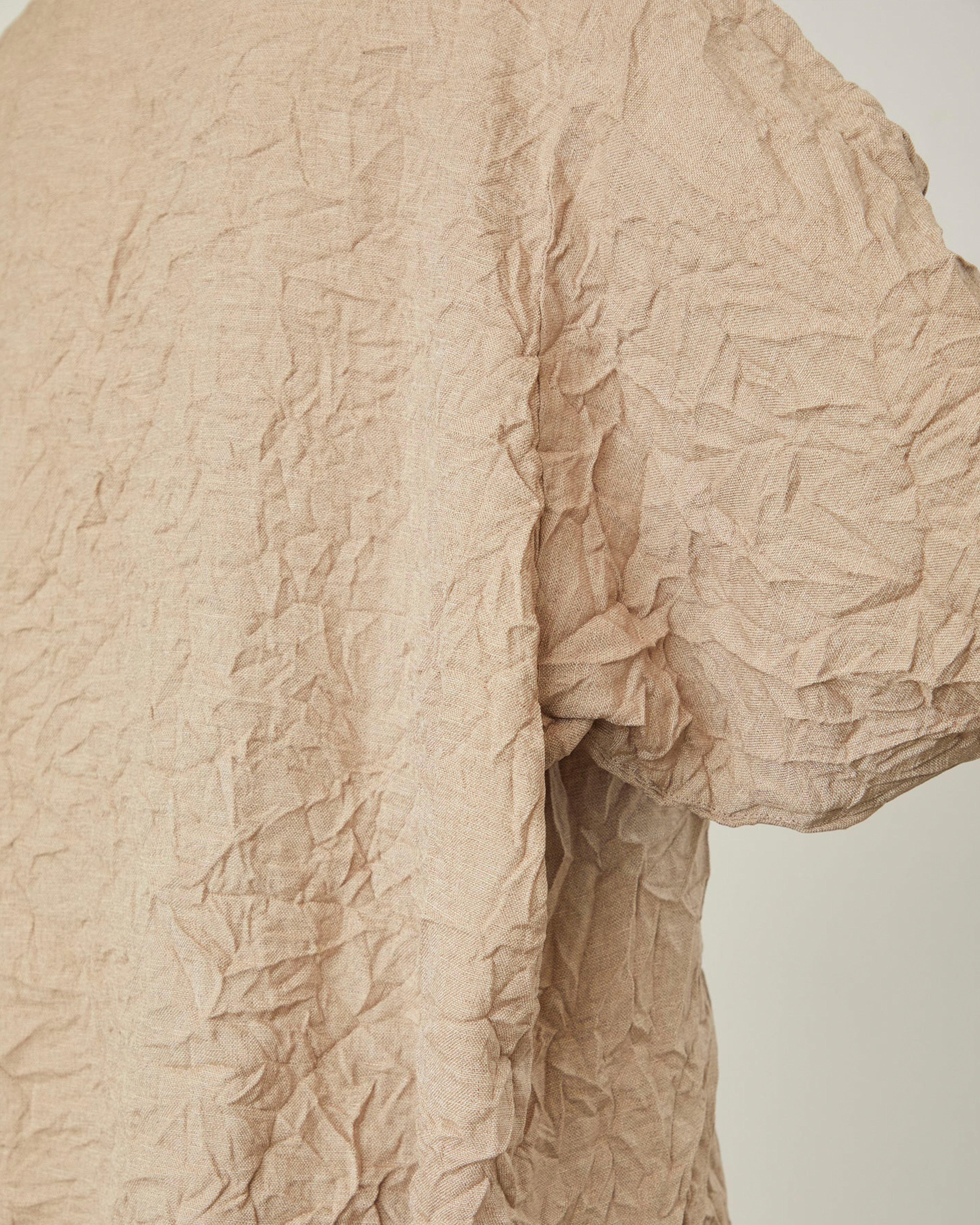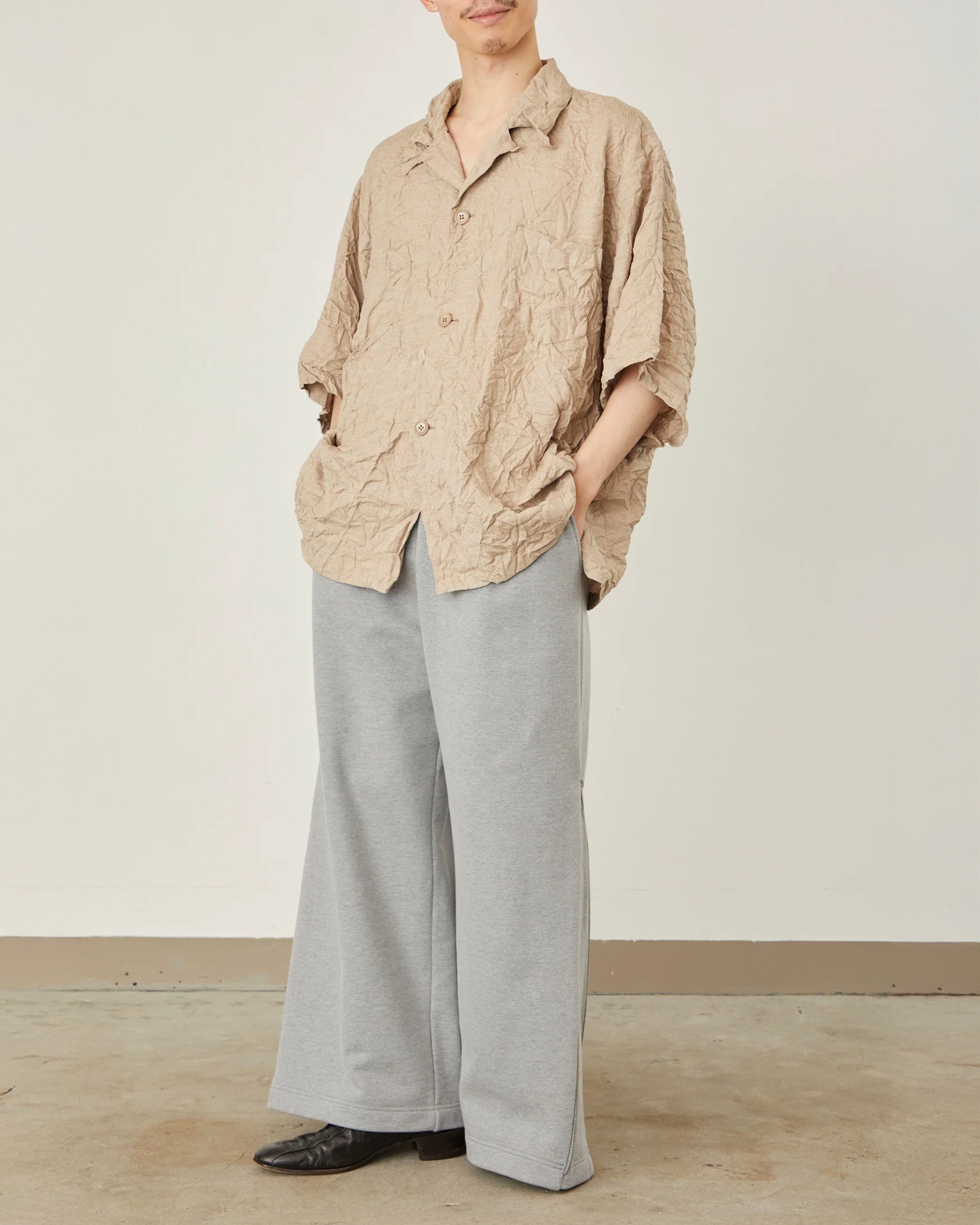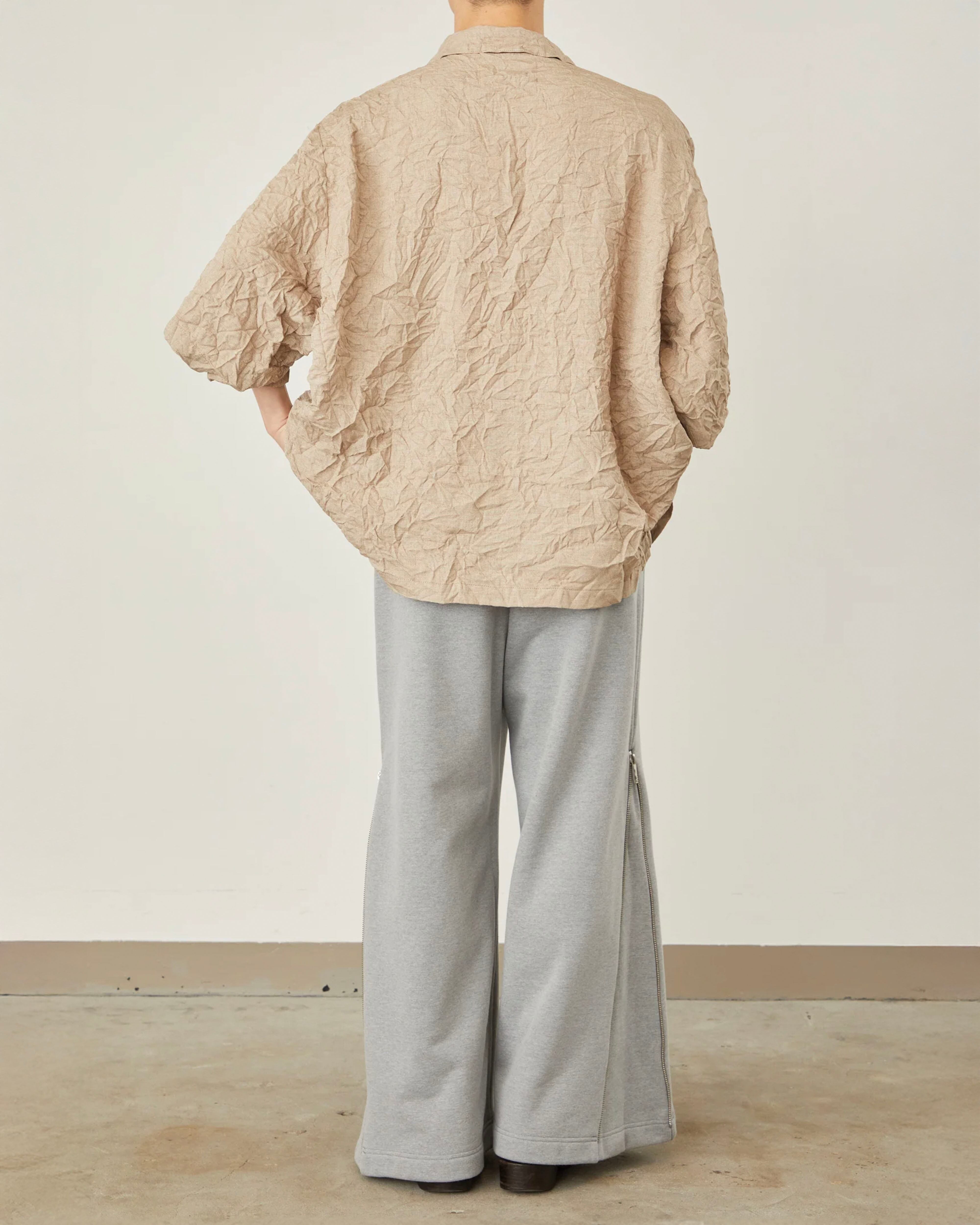 These shorts are crafted from a polyester fabric finished to mimic the texture of “linen,” using random slub yarn. The material is treated with a memory-effect catch-washer pleating process, creating a unique textured surface.